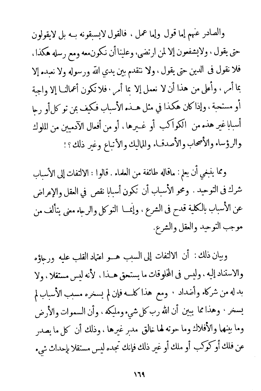 وَالصَّادِرُ عَنْهُمْ إمَّا قَوْلٌ وَإِمَّا عَمَلٌ فَالْقَوْلُ لَا يَسْبِقُونَهُ بِهِ بَلْ لَا يَقُولُونَ حَتَّى يَقُولَ وَلَا يَشْفَعُونَ إلَّا لِمَنْ ارْتَضَى وَعَلَيْنَا أَنْ نَكُونَ مَعَهُ وَمَعَ رُسُلِهِ هَكَذَا فَلَا نَقُولُ فِي الدِّينِ حَتَّى يَقُولَ وَلَا نَتَقَدَّمُ بَيْنَ يَدَيْ اللَّهِ وَرَسُولِهِ وَلَا نَعْبُدُهُ إلَّا بِمَا أَمَرَ وَأَعْلَى مِنْ هَذَا أَنْ لَا نَعْمَلَ إلَّا بِمَا أَمَرَ فَلَا تَكُونُ أَعْمَالُنَا إلَّا وَاجِبَةً أَوْ مُسْتَحَبَّةً وَإِذَا كَانَ هَكَذَا فِي مِثْلِ هَذِهِ الْأَسْبَابِ فَكَيْفَ بِمَنْ تَوَكَّلَ أَوْ رَجَا أَسْبَابًا غَيْرَ هَذِهِ مِنْ الْكَوَاكِبِ أَوْ غَيْرِهَا أَوْ مِنْ أَفْعَالِ الْآدَمِيِّينَ مِنْ الْمُلُوكِ وَالرُّؤَسَاءِ وَالْأَصْحَابِ وَالْأَصْدِقَاءِ وَالْمَمَالِيكِ وَالْأَتْبَاعِ وَغَيْرِ ذَلِكَ وَمِمَّا يَنْبَغِي أَنْ يُعْلَمَ: مَا قَالَهُ طَائِفَةٌ مِنْ الْعُلَمَاءِ. قَالُوا: الِالْتِفَاتُ إلَى الْأَسْبَابِ شِرْكٌ فِي التَّوْحِيدِ. وَمَحْوُ الْأَسْبَابِ أَنْ تَكُونَ أَسْبَابًا نَقْصٌ فِي الْعَقْلِ وَالْإِعْرَاضُ عَنْ الْأَسْبَابِ بِالْكُلِّيَّةِ قَدْحٌ فِي الشَّرْعِ وَإِنَّمَا التَّوَكُّلُ وَالرَّجَاءُ مَعْنًى يَتَأَلَّفُ مِنْ مُوجِبِ التَّوْحِيدِ وَالْعَقْلِ وَالشَّرْعِ. وَبَيَانُ ذَلِكَ: أَنَّ الِالْتِفَاتَ إلَى السَّبَبِ هُوَ اعْتِمَادُ الْقَلْبِ عَلَيْهِ وَرَجَاؤُهُ وَالِاسْتِنَادُ إلَيْهِ وَلَيْسَ فِي الْمَخْلُوقَاتِ مَا يَسْتَحِقُّ هَذَا لِأَنَّهُ لَيْسَ مُسْتَقِلًّا وَلَا بُدَّ لَهُ مِنْ شُرَكَاءَ وَأَضْدَادٍ وَمَعَ هَذَا كُلِّهِ فَإِنْ لَمْ يُسَخِّرْهُ مُسَبِّبُ الْأَسْبَابِ لَمْ يُسَخَّرْ وَهَذَا مِمَّا يُبَيِّنُ أَنَّ اللَّهَ رَبُّ كُلِّ شَيْءٍ وَمَلِيكُهُ وَأَنَّ السَّمَوَاتِ وَالْأَرْضَ وَمَا بَيْنَهُمَا وَالْأَفْلَاكَ وَمَا حَوَتْهُ لَهَا خَالِقٌ مُدَبِّرٌ غَيْرَهَا وَذَلِكَ أَنَّ كُلَّ مَا يَصْدُرُ عَنْ فَلَكٍ أَوْ كَوْكَبٍ أَوْ مَلَكٍ أَوْ غَيْرِ ذَلِكَ فَإِنَّكَ تَجِدُهُ لَيْسَ مُسْتَقِلًّا بِإِحْدَاثِ شَيْءٍ