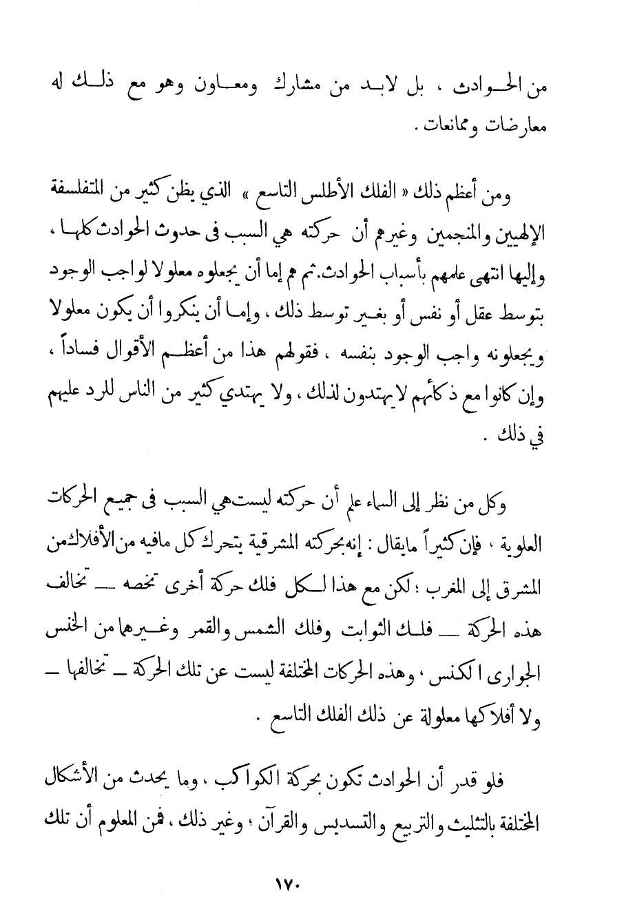 مِنْ الْحَوَادِثِ بَلْ لَا بُدَّ مِنْ مُشَارِكٍ وَمُعَاوِنٍ وَهُوَ مَعَ ذَلِكَ لَهُ مُعَارَضَاتٌ وَمُمَانَعَاتٌ. وَمِنْ أَعْظَمِ ذَلِكَ " الْفَلَكُ الْأَطْلَسُ التَّاسِعُ " الَّذِي يَظُنُّ كَثِيرٌ مِنْ الْمُتَفَلْسِفَةِ الإلهيين وَالْمُنَجِّمِينَ وَغَيْرِهِمْ أَنَّ حَرَكَتَهُ هِيَ السَّبَبُ فِي حُدُوثِ الْحَوَادِثِ كُلِّهَا وَإِلَيْهَا انْتَهَى عِلْمُهُمْ بِأَسْبَابِ الْحَوَادِثِ. ثُمَّ هُمْ إمَّا أَنْ يَجْعَلُوهُ مَعْلُومًا لِوَاجِبِ الْوُجُودِ بِتَوَسُّطِ عَقْلٍ أَوْ نَفْسٍ أَوْ بِغَيْرِ تَوَسُّطِ ذَلِكَ وَإِمَّا أَنْ يُنْكِرُوا أَنْ يَكُونَ مَعْلُولًا وَيَجْعَلُونَهُ وَاجِبَ الْوُجُودِ بِنَفْسِهِ فَقَوْلُهُمْ هَذَا مِنْ أَعْظَمِ الْأَقْوَالِ فَسَادًا وَإِنْ كَانُوا مَعَ ذَكَائِهِمْ لَا يَهْتَدُونَ لِذَلِكَ وَلَا يَهْتَدِي كَثِيرٌ مِنْ النَّاسِ لِلرَّدِّ عَلَيْهِمْ فِي ذَلِكَ. وَكُلُّ مَنْ نَظَرَ إلَى السَّمَاءِ عَلِمَ أَنَّ حَرَكَتَهُ لَيْسَتْ هِيَ السَّبَبَ فِي جَمِيعِ الْحَرَكَاتِ الْعُلْوِيَّةِ فَإِنَّ كَثِيرًا مَا يُقَالُ: إنَّهُ بِحَرَكَتِهِ الْمَشْرِقِيَّةِ يَتَحَرَّكُ كُلُّ مَا فِيهِ مِنْ الْأَفْلَاكِ مِنْ الْمَشْرِقِ إلَى الْمَغْرِبِ؛ لَكِنْ مَعَ هَذَا لِكُلِّ فَلَكٍ حَرَكَةٌ أُخْرَى تَخُصُّهُ - تُخَالِفُ هَذِهِ الْحَرَكَةَ - فَلَكَ الثَّوَابِتِ وَفَلَكَ الشَّمْسِ وَالْقَمَرِ وَغَيْرَهُمَا مِنْ الْخُنَّسِ الْجَوَارِي الْكُنَّسِ وَهَذِهِ الْحَرَكَاتُ الْمُخْتَلِفَةُ لَيْسَتْ عَنْ تِلْكَ الْحَرَكَةِ - تُخَالِفُهَا - وَلَا أَفْلَاكُهَا مَعْلُولَةٌ عَنْ ذَلِكَ الْفَلَكِ التَّاسِعِ. فَلَوْ قُدِّرَ أَنَّ الْحَوَادِثَ تَكُونُ بِحَرَكَةِ الْكَوَاكِبِ وَمَا يَحْدُثُ مِنْ الْأَشْكَالِ الْمُخْتَلِفَةِ بِالتَّثْلِيثِ وَالتَّرْبِيعِ وَالتَّسْدِيسِ وَالْقِرَانِ؛ وَغَيْرِ ذَلِكَ فَمِنْ الْمَعْلُومِ أَنَّ تِلْكَ