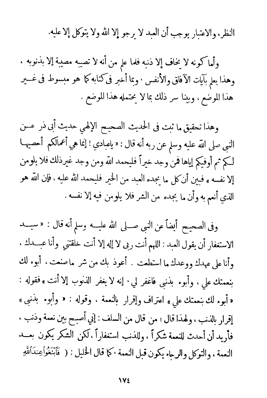 النَّظَرِ وَالِاعْتِبَارِ يُوجِبُ أَنَّ الْعَبْدَ لَا يَرْجُو إلَّا اللَّهَ وَلَا يَتَوَكَّلُ إلَّا عَلَيْهِ. وَأَمَّا كَوْنُهُ لَا يَخَافُ إلَّا ذَنْبَهُ فَلِمَا عُلِمَ مِنْ أَنَّهُ لَا تُصِيبُهُ مُصِيبَةٌ إلَّا بِذُنُوبِهِ وَهَذَا يُعْلَمُ بِآيَاتِ الْآفَاقِ وَالْأَنْفُسِ وَبِمَا أَخْبَرَ فِي كِتَابِهِ كَمَا هُوَ مَبْسُوطٌ فِي غَيْرِ هَذَا الْمَوْضِعِ وَبَيَّنَّا سِرَّ ذَلِكَ بِمَا لَا يَحْتَمِلُهُ هَذَا الْمَوْضِعُ. وَهَذَا تَحْقِيقُ مَا ثَبَتَ فِي الْحَدِيثِ الصَّحِيحِ الْإِلَهِيِّ حَدِيثِ أَبِي ذَرٍّ عَنْ النَّبِيِّ صَلَّى اللَّهُ عَلَيْهِ وَسَلَّمَ عَنْ رَبِّهِ أَنَّهُ قَالَ: {يَا عِبَادِي إنَّمَا هِيَ أَعْمَالُكُمْ أُحْصِيهَا لَكُمْ ثُمَّ أُوَفِّيكُمْ إيَّاهَا فَمَنْ وَجَدَ خَيْرًا فَلْيَحْمَدْ اللَّهَ وَمَنْ وَجَدَ غَيْرَ ذَلِكَ فَلَا يَلُومَنَّ إلَّا نَفْسَهُ} فَبَيَّنَ أَنَّ كُلَّ مَا يَجِدُهُ الْعَبْدُ مِنْ الْخَيْرِ فَلْيَحْمَدْ اللَّهَ عَلَيْهِ فَإِنَّ اللَّهَ هُوَ الَّذِي أَنْعَمَ بِهِ وَأَنَّ مَا يَجِدُهُ مِنْ الشَّرِّ فَلَا يَلُومَنَّ فِيهِ إلَّا نَفْسَهُ. وَفِي الصَّحِيحِ أَيْضًا عَنْ النَّبِيِّ صَلَّى اللَّهُ عَلَيْهِ وَسَلَّمَ أَنَّهُ قَالَ: {سَيِّدُ الِاسْتِغْفَارِ أَنْ يَقُولَ الْعَبْدُ: اللَّهُمَّ أَنْتَ رَبِّي لَا إلَهَ إلَّا أَنْتَ خَلَقْتَنِي وَأَنَا عَبْدُكَ وَأَنَا عَلَى عَهْدِكَ وَوَعْدِكَ مَا اسْتَطَعْتُ أَعُوذُ بِكَ مِنْ شَرِّ مَا صَنَعْتُ أَبُوءُ لَكَ بِنِعْمَتِكَ عَلَيَّ وَأَبُوءُ بِذَنْبِي فَاغْفِرْ لِي إنَّهُ لَا يَغْفِرُ الذُّنُوبَ إلَّا أَنْتَ} فَقَوْلُهُ: {أَبُوءُ لَكَ بِنِعْمَتِكَ عَلَيَّ} اعْتِرَافٌ وَإِقْرَارٌ بِالنِّعْمَةِ وَقَوْلُهُ: {وَأَبُوءُ بِذَنْبِي} إقْرَارٌ بِالذَّنْبِ وَلِهَذَا قَالَ؛ مَنْ قَالَ مِنْ السَّلَفِ: إنِّي أُصْبِحُ بَيْنَ نِعْمَةٍ وَذَنْبٍ فَأُرِيدُ أَنْ أُحْدِثَ لِلنِّعْمَةِ شُكْرًا وَلِلذَّنْبِ اسْتِغْفَارًا لَكِنَّ الشُّكْرَ يَكُونُ بَعْدَ النِّعْمَةِ وَالتَّوَكُّلُ وَالرَّجَاءُ يَكُونُ قَبْلَ النِّعْمَةِ كَمَا قَالَ الْخَلِيلُ: {فَابْتَغُوا عِنْدَ اللَّهِ