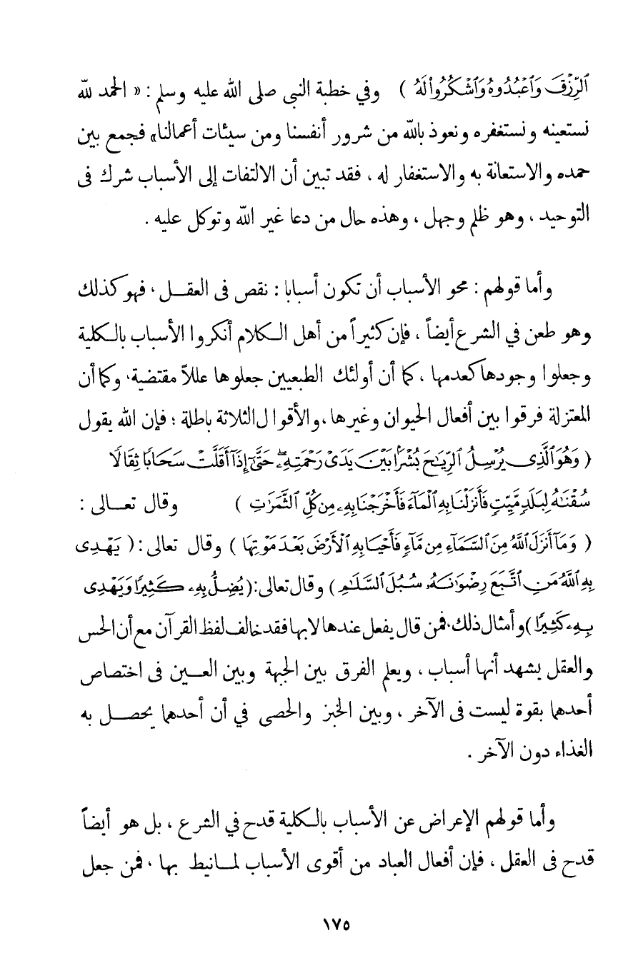 وَأَمَّا قَوْلُهُمْ: مَحْوُ الْأَسْبَابِ أَنْ تَكُونَ أَسْبَابًا: نَقْصٌ فِي الْعَقْلِ فَهُوَ كَذَلِكَ وَهُوَ طَعْنٌ فِي الشَّرْعِ أَيْضًا فَإِنَّ كَثِيرًا مِنْ أَهْلِ الْكَلَامِ أَنْكَرُوا الْأَسْبَابَ بِالْكُلِّيَّةِ وَجَعَلُوا وُجُودَهَا كَعَدَمِهَا كَمَا أَنَّ أُولَئِكَ الطبعيين جَعَلُوهَا عِلَلًا مُقْتَضِيَةً وَكَمَا أَنَّ الْمُعْتَزِلَةَ فَرَّقُوا بَيْنَ أَفْعَالِ الْحَيَوَانِ وَغَيْرِهَا وَالْأَقْوَالُ الثَّلَاثَةُ بَاطِلَةٌ؛ فَإِنَّ اللَّهَ يَقُولُ {وَهُوَ الَّذِي يُرْسِلُ الرِّيَاحَ بُشْرًا بَيْنَ يَدَيْ رَحْمَتِهِ حَتَّى إذَا أَقَلَّتْ سَحَابًا ثِقَالًا سُقْنَاهُ لِبَلَدٍ مَيِّتٍ فَأَنْزَلْنَا بِهِ الْمَاءَ فَأَخْرَجْنَا بِهِ مِنْ كُلِّ الثَّمَرَاتِ} وَقَالَ تَعَالَى: {وَمَا أَنْزَلَ اللَّهُ مِنَ السَّمَاءِ مِنْ مَاءٍ فَأَحْيَا بِهِ الْأَرْضَ بَعْدَ مَوْتِهَا} وَقَالَ تَعَالَى: {يَهْدِي بِهِ اللَّهُ مَنِ اتَّبَعَ رِضْوَانَهُ سُبُلَ السَّلَامِ} وَقَالَ تَعَالَى: {يُضِلُّ بِهِ كَثِيرًا وَيَهْدِي بِهِ كَثِيرًا} وَأَمْثَالُ ذَلِكَ فَمَنْ قَالَ يُفْعَلُ عِنْدَهَا لَا بِهَا فَقَدْ خَالَفَ لَفْظَ الْقُرْآنِ مَعَ أَنَّ الْحِسَّ وَالْعَقْلَ يَشْهَدُ أَنَّهَا أَسْبَابٌ وَيَعْلَمُ الْفَرْقَ بَيْنَ الْجَبْهَةِ وَبَيْنَ الْعَيْنِ فِي اخْتِصَاصِ أَحَدِهِمَا بِقُوَّةِ لَيْسَتْ فِي الْآخَرِ وَبَيْنَ الْخُبْزِ وَالْحَصَى فِي أَنَّ أَحَدَهُمَا يَحْصُلُ بِهِ الْغِذَاءُ دُونَ الْآخَرِ. وَأَمَّا قَوْلُهُمْ الْإِعْرَاضُ عَنْ الْأَسْبَابِ بِالْكُلِّيَّةِ قَدْحٌ فِي الشَّرْعِ بَلْ هُوَ أَيْضًا قَدْحٌ فِي الْعَقْلِ فَإِنَّ أَفْعَالَ الْعِبَادِ مِنْ أَقْوَى الْأَسْبَابِ لِمَا نِيطَ بِهَا فَمَنْ جَعَلَ