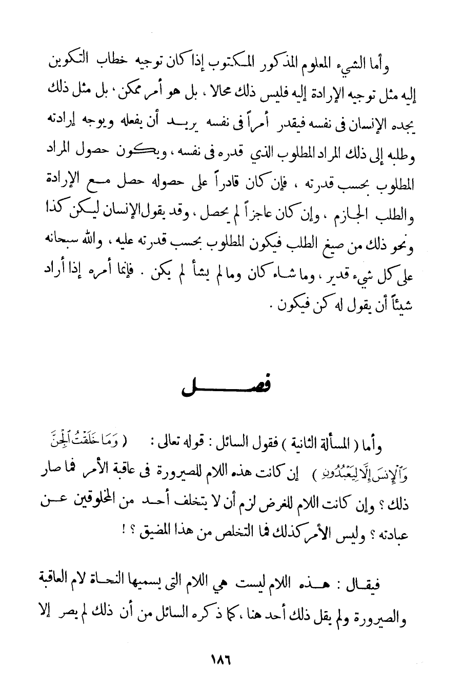 وَأَمَّا الْمَسْأَلَةُ الثَّانِيَةُ فَقَوْلُ السَّائِلِ: قَوْله تَعَالَى {وَمَا خَلَقْتُ الْجِنَّ وَالْإِنْسَ إلَّا لِيَعْبُدُونِ} إنْ كَانَتْ هَذِهِ اللَّامُ لِلصَّيْرُورَةِ فِي عَاقِبَةِ الْأَمْرِ فَمَا صَارَ ذَلِكَ؟ وَإِنْ كَانَتْ اللَّامُ لِلْغَرَضِ لَزِمَ أَنْ لَا يَتَخَلَّفَ أَحَدٌ مِنْ الْمَخْلُوقِينَ عَنْ عِبَادَتِهِ؟ وَلَيْسَ الْأَمْرُ كَذَلِكَ فَمَا التَّخَلُّصُ مِنْ هَذَا الْمَضِيقِ؟