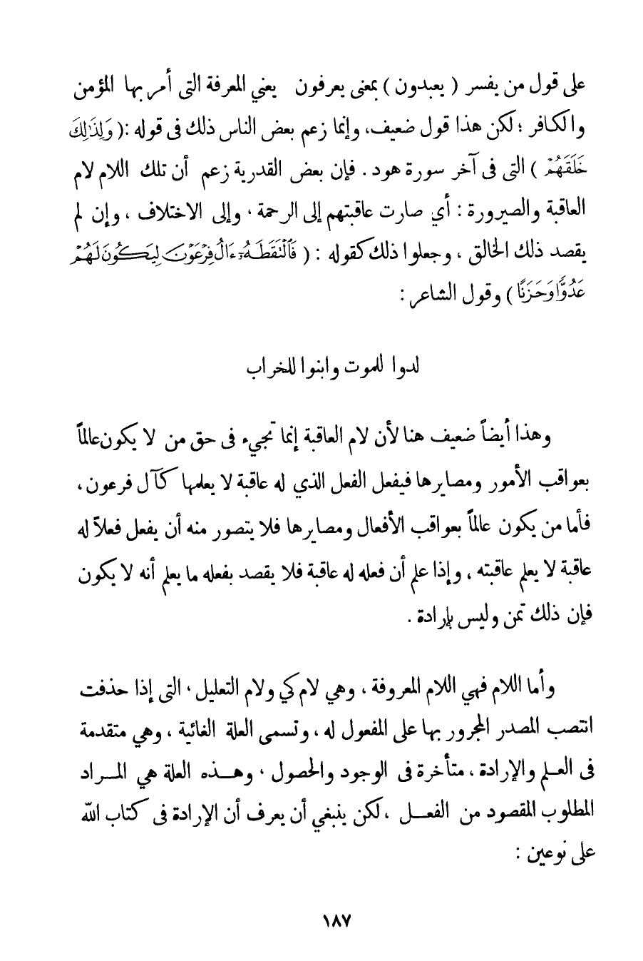 وَهَذَا أَيْضًا ضَعِيفٌ هُنَا لِأَنَّ لَامَ الْعَاقِبَةِ إنَّمَا تَجِيءُ فِي حَقِّ مَنْ لَا يَكُونُ عَالِمًا بِعَوَاقِبِ الْأُمُورِ ومصايرها فَيَفْعَلُ الْفِعْلَ الَّذِي لَهُ عَاقِبَةٌ لَا يَعْلَمُهَا كَآلِ فِرْعَوْنَ فَأَمَّا مَنْ يَكُونُ عَالِمًا بِعَوَاقِبِ الْأَفْعَالِ ومصايرها فَلَا يُتَصَوَّرُ مِنْهُ أَنْ يَفْعَلَ فِعْلًا لَهُ عَاقِبَةٌ لَا يَعْلَمُ عَاقِبَتَهُ وَإِذَا عَلِمَ أَنَّ فِعْلَهُ لَهُ عَاقِبَةٌ فَلَا يَقْصِدُ بِفِعْلِهِ مَا يَعْلَمُ أَنَّهُ لَا يَكُونُ فَإِنَّ ذَلِكَ تَمَنٍّ وَلَيْسَ بِإِرَادَةِ. وَأَمَّا اللَّامُ فَهِيَ اللَّامُ الْمَعْرُوفَةُ وَهِيَ لَامُ كَيْ وَلَامُ التَّعْلِيلِ الَّتِي إذَا حُذِفَتْ انْتَصَبَ الْمَصْدَرُ الْمَجْرُورُ بِهَا عَلَى الْمَفْعُولِ لَهُ وَتُسَمَّى الْعِلَّةُ الْغَائِبَةُ وَهِيَ مُتَقَدِّمَةٌ فِي الْعِلْمِ وَالْإِرَادَةِ مُتَأَخِّرَةٌ فِي الْوُجُودِ وَالْحُصُولِ وَهَذِهِ الْعِلَّةُ هِيَ الْمُرَادُ الْمَطْلُوبُ الْمَقْصُودُ مِنْ الْفِعْلِ لَكِنْ يَنْبَغِي أَنْ يُعْرَفَ أَنَّ الْإِرَادَةَ فِي كِتَابِ اللَّهِ عَلَى نَوْعَيْنِ: