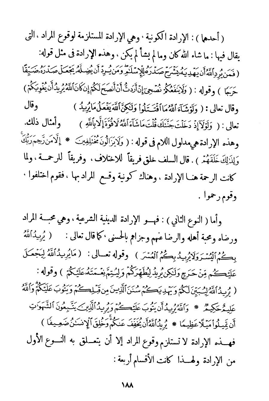 أَحَدُهُمَا: الْإِرَادَةُ الْكَوْنِيَّةُ وَهِيَ الْإِرَادَةُ الْمُسْتَلْزِمَةُ لِوُقُوعِ الْمُرَادِ الَّتِي يُقَالُ فِيهَا: مَا شَاءَ اللَّهُ كَانَ وَمَا لَمْ يَشَأْ لَمْ يَكُنْ وَهَذِهِ الْإِرَادَةُ فِي مِثْلِ قَوْلِهِ: {فَمَنْ يُرِدِ اللَّهُ أَنْ يَهدِيَهُ يَشْرَحْ صَدْرَهُ لِلْإِسْلَامِ وَمَنْ يُرِدْ أَنْ يُضِلَّهُ يَجْعَلْ صَدْرَهُ ضَيِّقًا حَرَجًا} وَقَوْلِهِ: {وَلَا يَنْفَعُكُمْ نُصْحِي إنْ أَرَدْتُ أَنْ أَنْصَحَ لَكُمْ إنْ كَانَ اللَّهُ يُرِيدُ أَنْ يُغْوِيَكُمْ} وَقَالَ تَعَالَى: {وَلَوْ شَاءَ اللَّهُ مَا اقْتَتَلُوا وَلَكِنَّ اللَّهَ يَفْعَلُ مَا يُرِيدُ} وَقَالَ تَعَالَى: {وَلَوْلَا إذْ دَخَلْتَ جَنَّتَكَ قُلْتَ مَا شَاءَ اللَّهُ لَا قُوَّةَ إلَّا بِاللَّهِ} وَأَمْثَالِ ذَلِكَ. وَهَذِهِ الْإِرَادَةُ هِيَ مَدْلُولُ اللَّامِ فِي قَوْلِهِ: {وَلَا يَزَالُونَ مُخْتَلِفِينَ} {إلَّا مَنْ رَحِمَ رَبُّكَ وَلِذَلِكَ خَلَقَهُمْ} . قَالَ السَّلَفُ خَلَقَ فَرِيقًا لِلِاخْتِلَافِ وَفَرِيقًا لِلرَّحْمَةِ وَلَمَّا كَانَتْ الرَّحْمَةُ هُنَا الْإِرَادَةَ وَهُنَاكَ كَوْنِيَّةً وَقَعَ الْمُرَادُ بِهَا فَقَوْمٌ اخْتَلَفُوا وَقَوْمٌ رَحِمُوا. وَأَمَّا (النَّوْعُ الثَّانِي: فَهُوَ الْإِرَادَةُ الدِّينِيَّةُ الشَّرْعِيَّةُ وَهِيَ مَحَبَّةُ الْمُرَادِ وَرِضَاهُ وَمَحَبَّةُ أَهْلِهِ وَالرِّضَا عَنْهُمْ وَجَزَاهُمْ بِالْحُسْنَى كَمَا قَالَ تَعَالَى: {يُرِيدُ اللَّهُ بِكُمُ الْيُسْرَ وَلَا يُرِيدُ بِكُمُ الْعُسْرَ} وقَوْله تَعَالَى {مَا يُرِيدُ اللَّهُ لِيَجْعَلَ عَلَيْكُمْ مِنْ حَرَجٍ وَلَكِنْ يُرِيدُ لِيُطَهِّرَكُمْ وَلِيُتِمَّ نِعْمَتَهُ عَلَيْكُمْ} وَقَوْلِهِ: {يُرِيدُ اللَّهُ لِيُبَيِّنَ لَكُمْ وَيَهْدِيَكُمْ سُنَنَ الَّذِينَ مِنْ قَبْلِكُمْ وَيَتُوبَ عَلَيْكُمْ وَاللَّهُ عَلِيمٌ حَكِيمٌ} {وَاللَّهُ يُرِيدُ أَنْ يَتُوبَ عَلَيْكُمْ وَيُرِيدُ الَّذِينَ يَتَّبِعُونَ الشَّهَوَاتِ أَنْ تَمِيلُوا مَيْلًا عَظِيمًا} {يُرِيدُ اللَّهُ أَنْ يُخَفِّفَ عَنْكُمْ وَخُلِقَ الْإِنْسَانُ ضَعِيفًا} فَهَذِهِ الْإِرَادَةُ لَا تَسْتَلْزِمُ وُقُوعَ الْمُرَادِ إلَّا أَنْ يَتَعَلَّقَ بِهِ النَّوْعُ الْأَوَّلُ مِنْ الْإِرَادَةِ وَلِهَذَا كَانَتْ الْأَقْسَامُ أَرْبَعَةً: