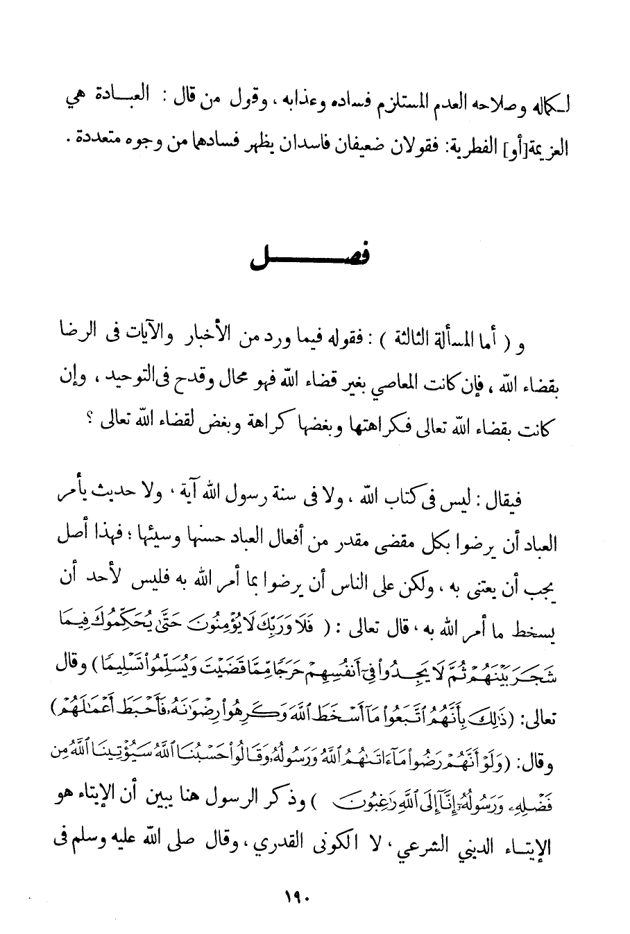 وَأَمَّا الْمَسْأَلَةُ الثَّالِثَةُ: فَقَوْلُهُ فِيمَا وَرَدَ مِنْ الْأَخْبَارِ وَالْآيَاتِ فِي الرِّضَا بِقَضَاءِ اللَّهِ فَإِنْ كَانَتْ الْمَعَاصِي بِغَيْرِ قَضَاءِ اللَّهِ فَهُوَ مُحَالٌ وَقَدْحٌ فِي التَّوْحِيدِ وَإِنْ كَانَتْ بِقَضَاءِ اللَّهِ تَعَالَى فَكَرَاهَتُهَا وَبُغْضُهَا كَرَاهَةٌ وَبُغْضٌ لِقَضَاءِ اللَّهِ تَعَالَى؟ فَيُقَالُ: لَيْسَ فِي كِتَابِ اللَّهِ وَلَا فِي سُنَّةِ رَسُولِ اللَّهِ آيَةٌ وَلَا حَدِيثٌ يَأْمُرُ الْعِبَادَ أَنْ يَرْضَوْا بِكُلِّ مَقْضِيٍّ مُقَدَّرٍ مِنْ أَفْعَالِ الْعِبَادِ حَسَنِهَا وَسَيِّئِهَا؛ فَهَذَا أَصْلٌ يَجِبُ أَنْ يُعْتَنَى بِهِ وَلَكِنْ عَلَى النَّاسِ أَنْ يَرْضَوْا بِمَا أَمَرَ اللَّهُ بِهِ فَلَيْسَ لِأَحَدِ أَنْ يَسْخَطَ مَا أَمَرَ اللَّهُ بِهِ قَالَ تَعَالَى: {فَلَا وَرَبِّكَ لَا يُؤْمِنُونَ حَتَّى يُحَكِّمُوكَ فِيمَا شَجَرَ بَيْنَهُمْ ثُمَّ لَا يَجِدُوا فِي أَنْفُسِهِمْ حَرَجًا مِمَّا قَضَيْتَ وَيُسَلِّمُوا تَسْلِيمًا} وَقَالَ تَعَالَى: {ذَلِكَ بِأَنَّهُمُ اتَّبَعُوا مَا أَسْخَطَ اللَّهَ وَكَرِهُوا رِضْوَانَهُ فَأَحْبَطَ أَعْمَالَهُمْ} وَقَالَ: {وَلَوْ أَنَّهُمْ رَضُوا مَا آتَاهُمُ اللَّهُ وَرَسُولُهُ وَقَالُوا حَسْبُنَا اللَّهُ سَيُؤْتِينَا اللَّهُ مِنْ فَضْلِهِ وَرَسُولُهُ إنَّا إلَى اللَّهِ رَاغِبُونَ} وَذِكْرُ الرَّسُولِ هُنَا يُبَيِّنُ أَنَّ الْإِيتَاءَ هُوَ الْإِيتَاءُ الدِّينِيُّ الشَّرْعِيُّ لَا الْكَوْنِيُّ الْقَدَرِيُّ وَقَالَ صَلَّى اللَّهُ عَلَيْهِ وَسَلَّمَ فِي