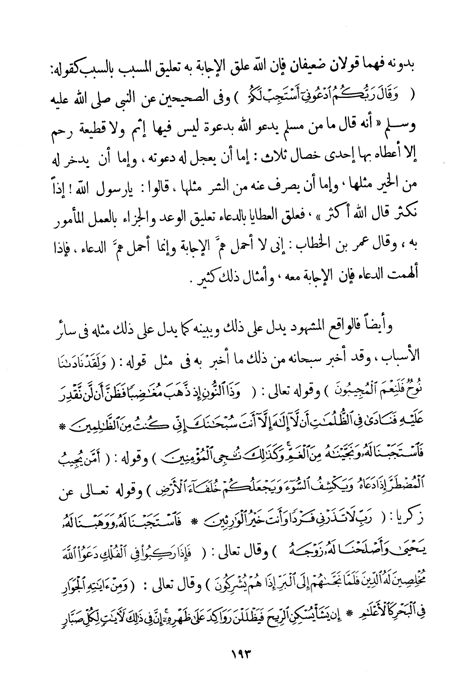 بِدُونِهِ فَهُمَا قَوْلَانِ ضَعِيفَانِ فَإِنَّ اللَّهَ عَلَّقَ الْإِجَابَةَ بِهِ تَعْلِيقَ الْمُسَبَّبِ بِالسَّبَبِ كَقَوْلِهِ: {وَقَالَ رَبُّكُمُ ادْعُونِي أَسْتَجِبْ لَكُمْ} وَفِي الصَّحِيحَيْنِ عَنْ النَّبِيِّ صَلَّى اللَّهُ عَلَيْهِ وَسَلَّمَ {أَنَّهُ قَالَ مَا مِنْ مُسْلِمٍ يَدْعُو اللَّهَ بِدَعْوَةِ لَيْسَ فِيهَا إثْمٌ وَلَا قَطِيعَةُ رَحِمٍ إلَّا أَعْطَاهُ بِهَا إحْدَى خِصَالٍ ثَلَاثٍ: إمَّا أَنْ يُعَجِّلَ لَهُ دَعْوَتَهُ وَإِمَّا أَنْ يَدَّخِرَ لَهُ مِنْ الْخَيْرِ مِثْلَهَا وَإِمَّا أَنْ يَصْرِفَ عَنْهُ مِنْ الشَّرِّ مِثْلَهَا قَالُوا: يَا رَسُولَ اللَّهِ إذًا نُكْثِرُ قَالَ اللَّهُ أَكْثَرُ} فَعَلَّقَ الْعَطَايَا بِالدُّعَاءِ تَعْلِيقَ الْوَعْدِ وَالْجَزَاءِ بِالْعَمَلِ الْمَأْمُورِ بِهِ وَقَالَ عُمَرُ بْنُ الْخَطَّابِ: إنِّي لَا أَحْمِلُ هَمَّ الْإِجَابَةِ وَإِنَّمَا أَحْمِلُ هَمَّ الدُّعَاءِ فَإِذَا أُلْهِمْتُ الدُّعَاءَ فَإِنَّ الْإِجَابَةَ مَعَهُ وَأَمْثَالُ ذَلِكَ كَثِيرٌ. وَأَيْضًا فَالْوَاقِعُ الْمَشْهُودُ يَدُلُّ عَلَى ذَلِكَ وَيُبَيِّنُهُ كَمَا يَدُلُّ عَلَى ذَلِكَ مِثْلُهُ فِي سَائِرِ الْأَسْبَابِ وَقَدْ أَخْبَرَ سُبْحَانَهُ مِنْ ذَلِكَ مَا أَخْبَرَ بِهِ فِي مِثْلِ قَوْلِهِ: {وَلَقَدْ نَادَانَا نُوحٌ فَلَنِعْمَ الْمُجِيبُونَ} وقَوْله تَعَالَى {وَذَا النُّونِ إذْ ذَهَبَ مُغَاضِبًا فَظَنَّ أَنْ لَنْ نَقْدِرَ عَلَيْهِ فَنَادَى فِي الظُّلُمَاتِ أَنْ لَا إلَهَ إلَّا أَنْتَ سُبْحَانَكَ إنِّي كُنْتُ مِنَ الظَّالِمِينَ} {فَاسْتَجَبْنَا لَهُ وَنَجَّيْنَاهُ مِنَ الْغَمِّ وَكَذَلِكَ نُنْجِي الْمُؤْمِنِينَ} وَقَوْلِهِ: {أَمَّنْ يُجِيبُ الْمُضْطَرَّ إذَا دَعَاهُ وَيَكْشِفُ السُّوءَ وَيَجْعَلُكُمْ خُلَفَاءَ الْأَرْضِ} وقَوْله تَعَالَى عَنْ زَكَرِيَّا: {رَبِّ لَا تَذَرْنِي فَرْدًا وَأَنْتَ خَيْرُ الْوَارِثِينَ} {فَاسْتَجَبْنَا لَهُ وَوَهَبْنَا لَهُ يَحْيَى وَأَصْلَحْنَا لَهُ زَوْجَهُ} وَقَالَ تَعَالَى: {فَإِذَا رَكِبُوا فِي الْفُلْكِ دَعَوُا اللَّهَ مُخْلِصِينَ لَهُ الدِّينَ فَلَمَّا نَجَّاهُمْ إلَى الْبَرِّ إذَا هُمْ يُشْرِكُونَ} وَقَالَ تَعَالَى: {وَمِنْ آيَاتِهِ الْجَوَارِي فِي الْبَحْرِ كَالْأَعْلَامِ} {إنْ يَشَأْ يُسْكِنِ الرِّيحَ فَيَظْلَلْنَ رَوَاكِدَ عَلَى ظَهْرِهِ إنَّ فِي ذَلِكَ