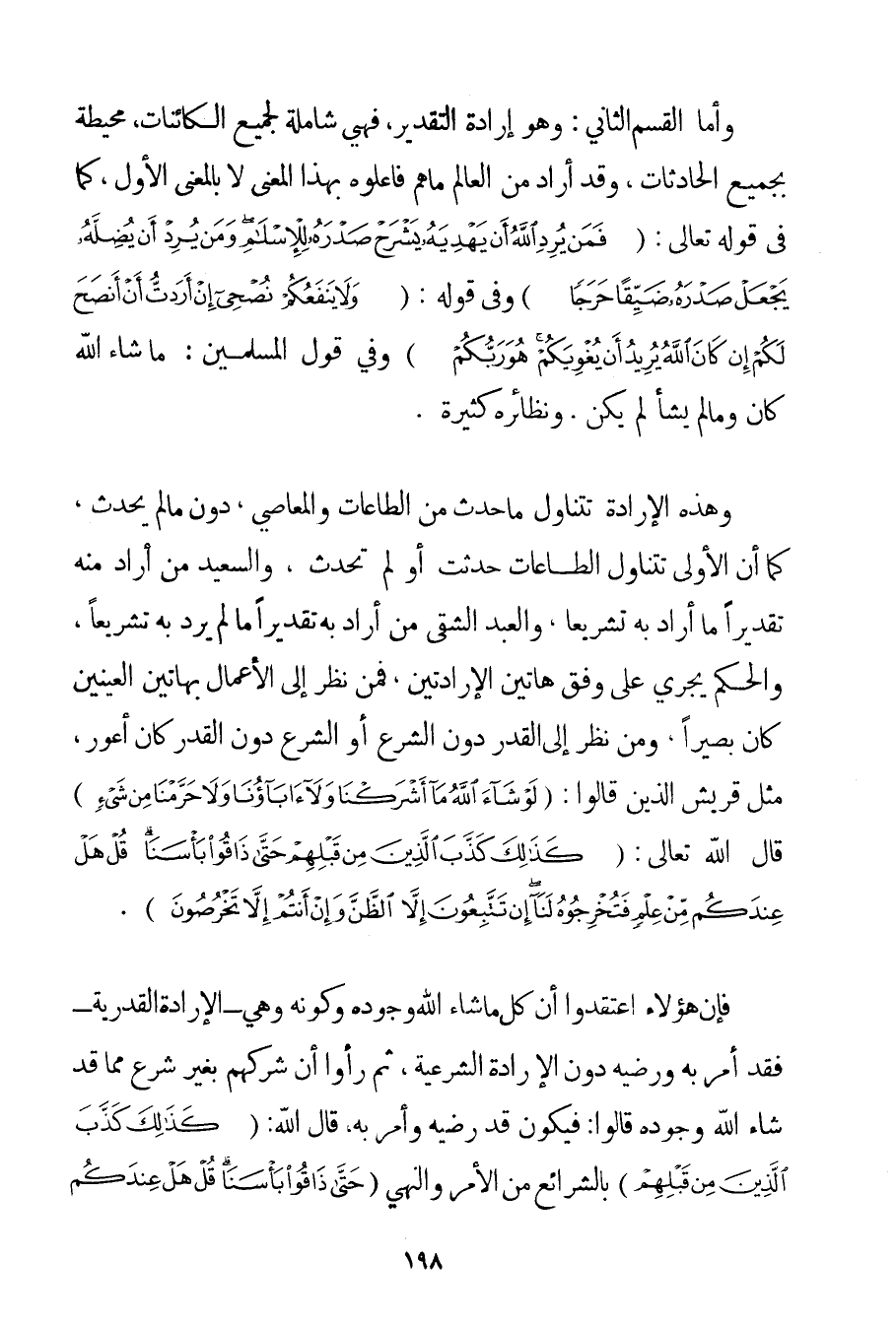 وَأَمَّا الْقِسْمُ الثَّانِي: وَهُوَ إرَادَةُ التَّقْدِيرِ فَهِيَ شَامِلَةٌ لِجَمِيعِ الْكَائِنَاتِ مُحِيطَةٌ بِجَمِيعِ الْحَادِثَاتِ وَقَدْ أَرَادَ مِنْ الْعَالَمِ مَا هُمْ فَاعِلُوهُ بِهَذَا الْمَعْنَى لَا بِالْمَعْنَى الْأَوَّلِ كَمَا فِي قَوْله تَعَالَى {فَمَنْ يُرِدِ اللَّهُ أَنْ يَهدِيَهُ يَشْرَحْ صَدْرَهُ لِلْإِسْلَامِ وَمَنْ يُرِدْ أَنْ يُضِلَّهُ يَجْعَلْ صَدْرَهُ ضَيِّقًا حَرَجًا} وَفِي قَوْلِهِ: {وَلَا يَنْفَعُكُمْ نُصْحِي إنْ أَرَدْتُ أَنْ أَنْصَحَ لَكُمْ إنْ كَانَ اللَّهُ يُرِيدُ أَنْ يُغْوِيَكُمْ هُوَ رَبُّكُمْ} وَفِي قَوْلِ الْمُسْلِمِينَ: مَا شَاءَ اللَّهُ كَانَ وَمَا لَمْ يَشَأْ لَمْ يَكُنْ. وَنَظَائِرُهُ كَثِيرَةٌ. وَهَذِهِ الْإِرَادَةُ تَتَنَاوَلُ مَا حَدَثَ مِنْ الطَّاعَاتِ وَالْمَعَاصِي دُونَ مَا لَمْ يَحْدُثْ كَمَا أَنَّ الْأُولَى تَتَنَاوَلُ الطَّاعَاتِ حَدَثَتْ أَوْ لَمْ تَحْدُثْ وَالسَّعِيدُ مَنْ أَرَادَ مِنْهُ تَقْدِيرًا مَا أَرَادَ بِهِ تَشْرِيعًا وَالْعَبْدُ الشَّقِيُّ مَنْ أَرَادَ بِهِ تَقْدِيرًا مَا لَمْ يُرِدْ بِهِ تَشْرِيعًا وَالْحُكْمُ يَجْرِي عَلَى وَفْقِ هَاتَيْنِ الْإِرَادَتَيْنِ فَمَنْ نَظَرَ إلَى الْأَعْمَالِ بِهَاتَيْنِ الْعَيْنَيْنِ كَانَ بَصِيرًا وَمَنْ نَظَرَ إلَى الْقَدَرِ دُونَ الشَّرْعِ أَوْ الشَّرْعِ دُونَ الْقَدَرِ كَانَ أَعْوَرَ مِثْلَ قُرَيْشٍ الَّذِينَ قَالُوا: {لَوْ شَاءَ اللَّهُ مَا أَشْرَكْنَا وَلَا آبَاؤُنَا وَلَا حَرَّمْنَا مِنْ شَيْءٍ} قَالَ اللَّهُ تَعَالَى: {كَذَلِكَ كَذَّبَ الَّذِينَ مِنْ قَبْلِهِمْ حَتَّى ذَاقُوا بَأْسَنَا قُلْ هَلْ عِنْدَكُمْ مِنْ عِلْمٍ فَتُخْرِجُوهُ لَنَا إنْ تَتَّبِعُونَ إلَّا الظَّنَّ وَإِنْ أَنْتُمْ إلَّا تَخْرُصُونَ} . فَإِنَّ هَؤُلَاءِ اعْتَقَدُوا أَنَّ كُلَّ مَا شَاءَ اللَّهُ وُجُودَهُ وَكَوْنَهُ وَهِيَ - الْإِرَادَةُ الْقَدَرِيَّةُ - فَقَدْ أَمَرَ بِهِ وَرَضِيَهُ دُونَ الْإِرَادَةِ الشَّرْعِيَّةِ ثُمَّ رَأَوْا أَنَّ شِرْكَهُمْ بِغَيْرِ شَرْعٍ مِمَّا قَدْ شَاءَ اللَّهُ وُجُودَهُ قَالُوا: فَيَكُونُ قَدْ رَضِيَهُ وَأَمَرَ بِهِ قَالَ اللَّهُ: {كَذَلِكَ كَذَّبَ الَّذِينَ مِنْ قَبْلِهِمْ} بِالشَّرَائِعِ مِنْ الْأَمْرِ وَالنَّهْيِ {حَتَّى ذَاقُوا بَأْسَنَا قُلْ هَلْ عِنْدَكُمْ مِنْ