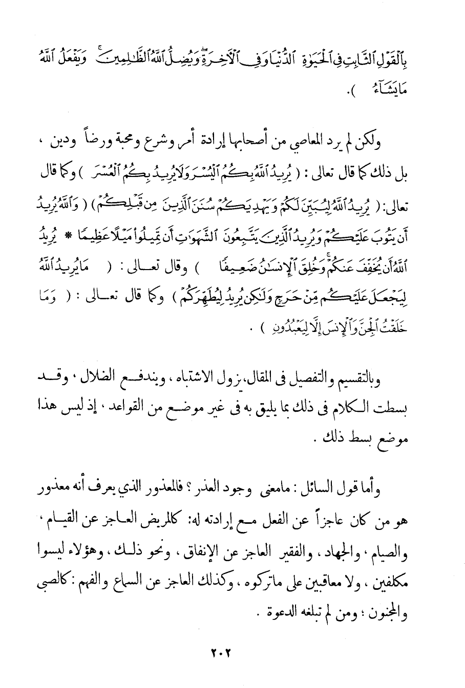 بِالْقَوْلِ الثَّابِتِ فِي الْحَيَاةِ الدُّنْيَا وَفِي الْآخِرَةِ وَيُضِلُّ اللَّهُ الظَّالِمِينَ وَيَفْعَلُ اللَّهُ مَا يَشَاءُ} . وَلَكِنْ لَمْ يُرِدْ الْمَعَاصِيَ مِنْ أَصْحَابِهَا إرَادَةَ أَمْرٍ وَشَرْعٍ وَمَحَبَّةٍ وَرِضًى وَدِينٍ بَلْ ذَلِكَ كَمَا قَالَ تَعَالَى: {يُرِيدُ اللَّهُ بِكُمُ الْيُسْرَ وَلَا يُرِيدُ بِكُمُ الْعُسْرَ} وَكَمَا قَالَ تَعَالَى: {يُرِيدُ اللَّهُ لِيُبَيِّنَ لَكُمْ وَيَهْدِيَكُمْ سُنَنَ الَّذِينَ مِنْ قَبْلِكُمْ} {وَاللَّهُ يُرِيدُ أَنْ يَتُوبَ عَلَيْكُمْ وَيُرِيدُ الَّذِينَ يَتَّبِعُونَ الشَّهَوَاتِ أَنْ تَمِيلُوا مَيْلًا عَظِيمًا} {يُرِيدُ اللَّهُ أَنْ يُخَفِّفَ عَنْكُمْ وَخُلِقَ الْإِنْسَانُ ضَعِيفًا} وَقَالَ تَعَالَى: {مَا يُرِيدُ اللَّهُ لِيَجْعَلَ عَلَيْكُمْ مِنْ حَرَجٍ وَلَكِنْ يُرِيدُ لِيُطَهِّرَكُمْ} وَكَمَا قَالَ تَعَالَى: {وَمَا خَلَقْتُ الْجِنَّ وَالْإِنْسَ إلَّا لِيَعْبُدُونِ} . وَبِالتَّقْسِيمِ وَالتَّفْصِيلِ فِي الْمَقَالِ يَزُولُ الِاشْتِبَاهُ وَيَنْدَفِعُ الضَّلَالُ وَقَدْ بَسَطْتُ الْكَلَامَ فِي ذَلِكَ بِمَا يَلِيقُ بِهِ فِي غَيْرِ مَوْضِعٍ مِنْ الْقَوَاعِدِ إذْ لَيْسَ هَذَا مَوْضِعَ بَسْطِ ذَلِكَ. وَأَمَّا قَوْلُ السَّائِلِ: مَا مَعْنَى وُجُودِ الْعُذْرِ؟ فَالْمَعْذُورُ الَّذِي يَعْرِفُ أَنَّهُ مَعْذُورٌ هُوَ مَنْ كَانَ عَاجِزًا عَنْ الْفِعْلِ مَعَ إرَادَتِهِ لَهُ: كَالْمَرِيضِ الْعَاجِزِ عَنْ الْقِيَامِ وَالصِّيَامِ وَالْجِهَادِ وَالْفَقِيرِ الْعَاجِزِ عَنْ الْإِنْفَاقِ وَنَحْوِ ذَلِكَ وَهَؤُلَاءِ لَيْسُوا مُكَلَّفِينَ وَلَا مُعَاقَبِينَ عَلَى مَا تَرَكُوهُ وَكَذَلِكَ الْعَاجِزُ عَنْ السَّمَاعِ وَالْفَهْمِ: كَالصَّبِيِّ وَالْمَجْنُونِ؛ وَمَنْ لَمْ تَبْلُغْهُ الدَّعْوَةُ.