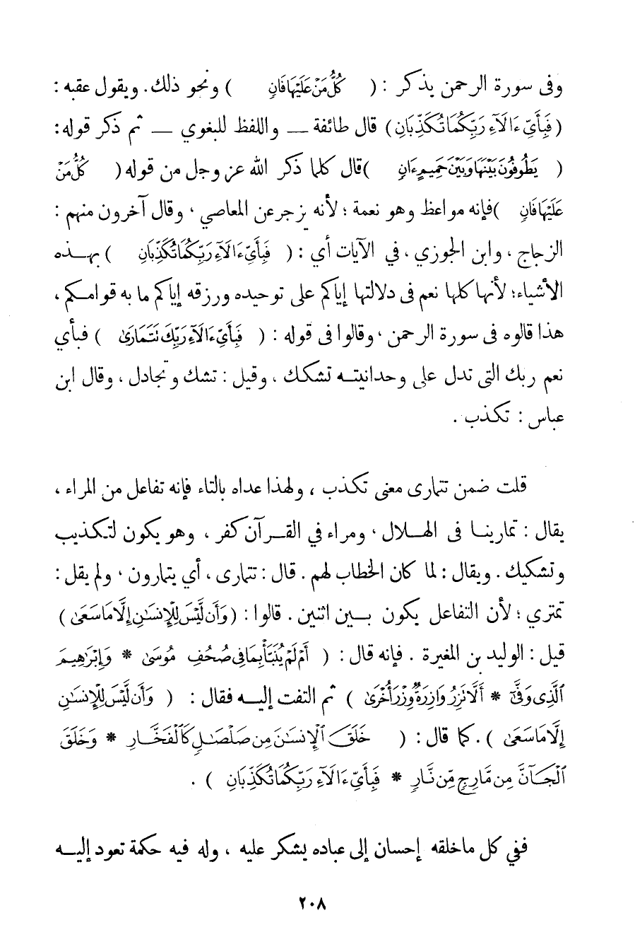 وَفِي سُورَةِ الرَّحْمَنِ يَذْكُرُ: {كُلُّ مَنْ عَلَيْهَا فَانٍ} وَنَحْوَ ذَلِكَ. وَيَقُولُ عَقِبَهُ: {فَبِأَيِّ آلَاءِ رَبِّكُمَا تُكَذِّبَانِ} قَالَ طَائِفَةٌ - وَاللَّفْظُ للبغوي - ثُمَّ ذَكَرَ قَوْلَهُ: {يَطُوفُونَ بَيْنَهَا وَبَيْنَ حَمِيمٍ آنٍ} قَالَ كُلَّمَا ذَكَرَ اللَّهُ عَزَّ وَجَلَّ مِنْ قَوْلِهِ {كُلُّ مَنْ عَلَيْهَا فَانٍ} فَإِنَّهُ مَوَاعِظُ وَهُوَ نِعْمَةٌ؛ لِأَنَّهُ يَزْجُرُ عَنْ الْمَعَاصِي، وَقَالَ آخَرُونَ مِنْهُمْ: الزَّجَّاجُ، وَابْنُ الْجَوْزِيِّ، فِي الْآيَاتِ أَيْ: {فَبِأَيِّ آلَاءِ رَبِّكُمَا تُكَذِّبَانِ} بِهَذِهِ الْأَشْيَاءِ؛ لِأَنَّهَا كُلَّهَا نِعَمٌ فِي دِلَالَتِهَا إيَّاكُمْ عَلَى تَوْحِيدِهِ وَرِزْقِهِ إيَّاكُمْ مَا بِهِ قِوَامُكُمْ، هَذَا قَالُوهُ فِي سُورَةِ الرَّحْمَنِ، وَقَالُوا فِي قَوْلِهِ: {فَبِأَيِّ آلَاءِ رَبِّكَ تَتَمَارَى} فَبِأَيِّ نِعَمِ رَبِّكَ الَّتِي تَدُلُّ عَلَى وَحْدَانِيِّتِهِ تُشَكِّكُ، وَقِيلَ: تَشُكُّ وَتُجَادِلُ، وَقَالَ ابْنُ عَبَّاسٍ: تُكَذِّبُ. قُلْتُ ضُمِّنَ تَتَمَارَى مَعْنَى تُكَذِّبُ، وَلِهَذَا عَدَّاهُ بِالتَّاءِ فَإِنَّهُ تَفَاعُلٌ مِنْ الْمِرَاءِ، يُقَالُ: تَمَارَيْنَا فِي الْهِلَالِ، وَمِرَاءٌ فِي الْقُرْآنِ كُفْرٌ، وَهُوَ يَكُونُ لِتَكْذِيبِ وَتَشْكِيكٍ. وَيُقَالُ: لَمَّا كَانَ الْخِطَابُ لَهُمْ. قَالَ: تَتَمَارَى، أَيْ يَتَمَارَوْنَ، وَلَمْ يَقُلْ: تَمْتَرِي؛ لِأَنَّ التَّفَاعُلَ يَكُونُ بَيْنَ اثْنَيْنِ. قَالُوا: {وَأَنْ لَيْسَ لِلْإِنْسَانِ إلَّا مَا سَعَى} قِيلَ: الْوَلِيدُ بْنُ الْمُغِيرَةِ. فَإِنَّهُ قَالَ: {أَمْ لَمْ يُنَبَّأْ بِمَا فِي صُحُفِ مُوسَى} {وَإِبْرَاهِيمَ الَّذِي وَفَّى} {أَلَّا تَزِرُ وَازِرَةٌ وِزْرَ أُخْرَى} [ثُمَّ الْتَفَتَ إلَيْهِ فَقَالَ: {وَأَنْ لَيْسَ لِلْإِنْسَانِ إلَّا مَا سَعَى} ] (*) . كَمَا قَالَ: {خَلَقَ الْإِنْسَانَ مِنْ صَلْصَالٍ كَالْفَخَّارِ} {وَخَلَقَ الْجَانَّ مِنْ مَارِجٍ مِنْ نَارٍ} {فَبِأَيِّ آلَاءِ رَبِّكُمَا تُكَذِّبَانِ} . فَفِي كُلِّ مَا خَلَقَهُ إحْسَانٌ إلَى عِبَادِهِ يُشْكَرُ عَلَيْهِ، وَلَهُ فِيهِ حِكْمَةٌ تَعُودُ إلَيْهِ