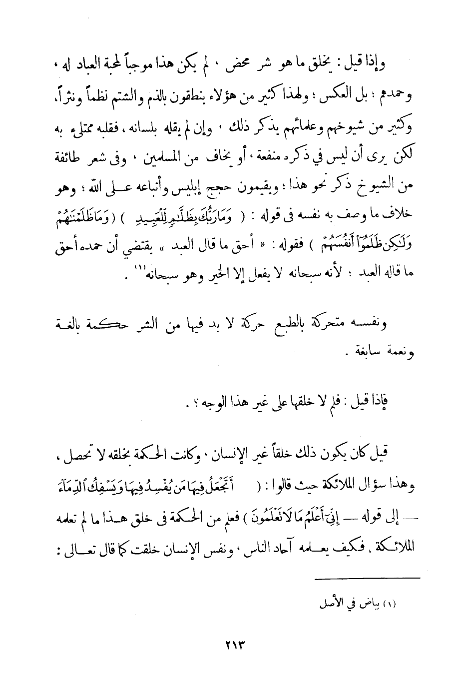 وَإِذَا قِيلَ: يَخْلُقُ مَا هُوَ شَرٌّ مَحْضٌ، لَمْ يَكُنْ هَذَا مُوجِبًا لِمَحَبَّةِ الْعِبَادِ لَهُ، وَحَمْدِهِمْ؛ بَلْ الْعَكْسُ؛ وَلِهَذَا كَثِيرٌ مِنْ هَؤُلَاءِ يَنْطِقُونَ بِالذَّمِّ وَالشَّتْمِ نَظْمًا وَنَثْرًا، وَكَثِيرٌ مِنْ شُيُوخِهِمْ وَعُلَمَائِهِمْ يَذْكُرُ ذَلِكَ، وَإِنْ لَمْ يَقُلْهُ بِلِسَانِهِ، فَقَلْبُهُ مُمْتَلِئٌ بِهِ لَكِنْ يَرَى أَنْ لَيْسَ فِي ذِكْرِهِ مَنْفَعَةٌ، أَوْ يَخَافُ مِنْ الْمُسْلِمِينَ، وَفِي شِعْرِ طَائِفَةٍ مِنْ الشُّيُوخِ ذِكْرُ نَحْوِ هَذَا؛ وَيُقِيمُونَ حُجَجَ إبْلِيسَ وَأَتْبَاعِهِ عَلَى اللَّهِ؛ وَهُوَ خِلَافُ مَا وَصَفَ بِهِ نَفْسَهُ فِي قَوْلِهِ: {وَمَا رَبُّكَ بِظَلَّامٍ لِلْعَبِيدِ} {وَمَا ظَلَمْنَاهُمْ وَلَكِنْ ظَلَمُوا أَنْفُسَهُمْ} فَقَوْلُهُ: {أَحَقُّ مَا قَالَ الْعَبْدُ} يَقْتَضِي أَنَّ حَمْدَهُ أَحَقُّ مَا قَالَهُ الْعَبْدُ؛ لِأَنَّهُ سُبْحَانَهُ لَا يَفْعَلُ إلَّا الْخَيْرَ وَهُوَ سُبْحَانَهُ. . . (1) (*) .