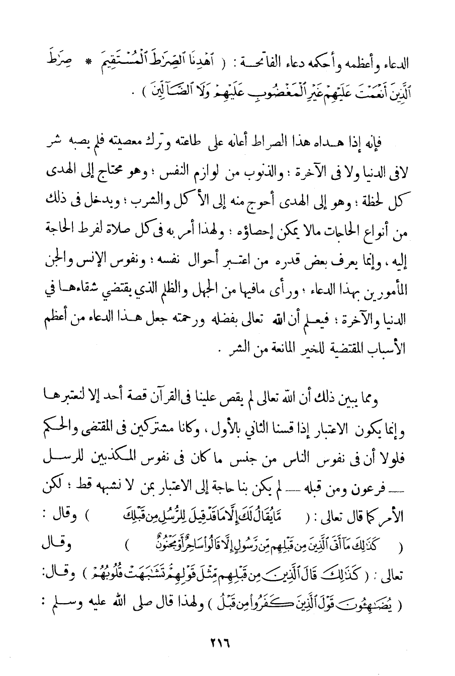 الدُّعَاءِ وَأَعْظَمُهُ وَأَحْكَمُهُ دُعَاءَ الْفَاتِحَةِ: {اهْدِنَا الصِّرَاطَ الْمُسْتَقِيمَ} {صِرَاطَ الَّذِينَ أَنْعَمْتَ عَلَيْهِمْ غَيْرِ الْمَغْضُوبِ عَلَيْهِمْ وَلَا الضَّالِّينَ} . فَإِنَّهُ إذَا هَدَاهُ هَذَا الصِّرَاطَ أَعَانَهُ عَلَى طَاعَتِهِ وَتَرْكِ مَعْصِيَتِهِ فَلَمْ يُصِبْهُ شَرٌّ لَا فِي الدُّنْيَا وَلَا فِي الْآخِرَةِ؛ وَالذُّنُوبُ مِنْ لَوَازِمِ النَّفْسِ؛ وَهُوَ مُحْتَاجٌ إلَى الْهُدَى كُلَّ لَحْظَةٍ؛ وَهُوَ إلَى الْهُدَى أَحْوَجُ مِنْهُ إلَى الْأَكْلِ وَالشُّرْبِ؛ وَيَدْخُلُ فِي ذَلِكَ مِنْ أَنْوَاعِ الْحَاجَاتِ مَا لَا يُمْكِنُ إحْصَاؤُهُ؛ وَلِهَذَا أَمَرَ بِهِ فِي كُلِّ صَلَاةٍ لِفَرْطِ الْحَاجَةِ إلَيْهِ، وَإِنَّمَا يَعْرِفُ بَعْضَ قَدْرِهِ مَنْ اعْتَبَرَ أَحْوَالَ نَفْسِهِ؛ وَنُفُوسِ الْإِنْسِ وَالْجِنِّ الْمَأْمُورِينَ بِهَذَا الدُّعَاءِ؛ وَرَأَى مَا فِيهَا مِنْ الْجَهْلِ وَالظُّلْمِ الَّذِي يَقْتَضِي شَقَاءَهَا فِي الدُّنْيَا وَالْآخِرَةِ؛ فَيَعْلَمُ أَنَّ اللَّهَ تَعَالَى بِفَضْلِهِ وَرَحْمَتِهِ جَعَلَ هَذَا الدُّعَاءَ مِنْ أَعْظَمِ الْأَسْبَابِ الْمُقْتَضِيَةِ لِلْخَيْرِ الْمَانِعَةِ مِنْ الشَّرِّ. وَمِمَّا يُبَيِّنُ ذَلِكَ أَنَّ اللَّهَ تَعَالَى [لَمْ يَقُصَّ عَلَيْنَا فِي الْقُرْآنِ قِصَّةَ أَحَدٍ إلَّا لِنَعْتَبِرَهَا] (1) وَإِنَّمَا يَكُونُ الِاعْتِبَارُ إذَا قِسْنَا الثَّانِيَ بِالْأَوَّلِ، [وَكَانَا مُشْتَرِكَيْنِ فِي الْمُقْتَضَى وَالْحُكْمِ] (2) فَلَوْلَا أَنَّ فِي نُفُوسِ النَّاسِ مِنْ جِنْسِ مَا كَانَ فِي نُفُوسِ الْمُكَذِّبِينَ لِلرُّسُلِ - فِرْعَوْنَ وَمَنْ قَبْلَهُ - لَمْ يَكُنْ بِنَا حَاجَةٌ إلَى الِاعْتِبَارِ بِمَنْ لَا نُشْبِهُهُ قَطُّ؛ لَكِنَّ الْأَمْرَ كَمَا قَالَ تَعَالَى: {مَا يُقَالُ لَكَ إلَّا مَا قَدْ قِيلَ لِلرُّسُلِ مِنْ قَبْلِكَ} وَقَالَ: {كَذَلِكَ مَا أَتَى الَّذِينَ مِنْ قَبْلِهِمْ مِنْ رَسُولٍ إلَّا قَالُوا سَاحِرٌ أَوْ مَجْنُونٌ} وَقَالَ تَعَالَى: {كَذَلِكَ قَالَ الَّذِينَ مِنْ قَبْلِهِمْ مِثْلَ قَوْلِهِمْ تَشَابَهَتْ قُلُوبُهُمْ} وَقَالَ: {يُضَاهِئُونَ قَوْلَ الَّذِينَ كَفَرُوا مِنْ قَبْلُ} وَلِهَذَا قَالَ صَلَّى اللَّهُ عَلَيْهِ وَسَلَّمَ: