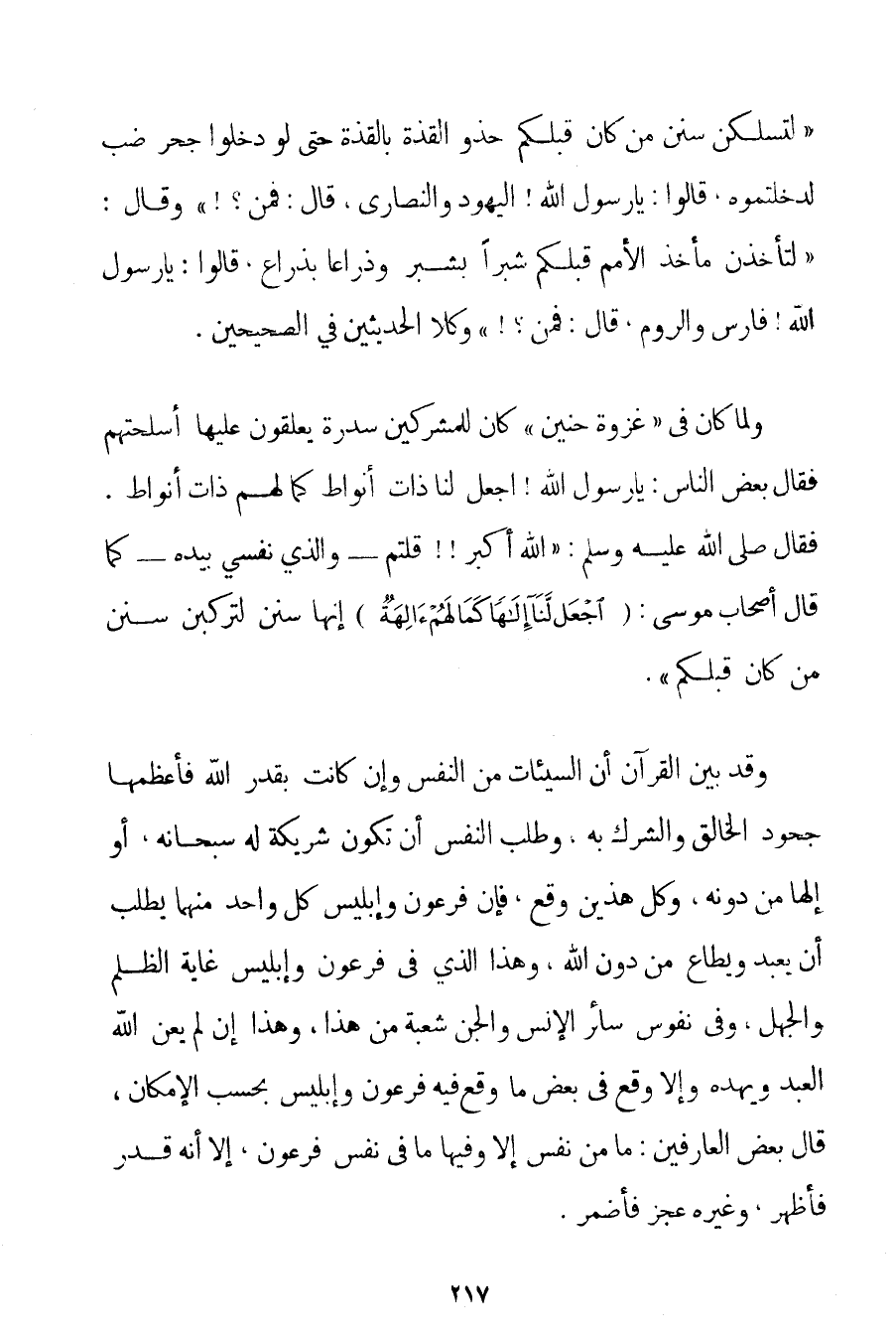 {لَتَسْلُكُنَّ سَنَنَ مَنْ كَانَ قَبْلَكُمْ حَذْوَ الْقُذَّةِ بِالْقُذَّةِ حَتَّى لَوْ دَخَلُوا جُحْرَ ضَبٍّ لَدَخَلْتُمُوهُ، قَالُوا: يَا رَسُولَ اللَّهِ الْيَهُودُ وَالنَّصَارَى، قَالَ: فَمَنْ} وَقَالَ: {لَتَأْخُذُنَّ مَأْخَذَ الْأُمَمِ قَبْلَكُمْ شِبْرًا بِشِبْرِ وَذِرَاعًا بِذِرَاعِ، قَالُوا: يَا رَسُولَ اللَّهِ فَارِسُ وَالرُّومُ، قَالَ: فَمَنْ} وَكِلَا الْحَدِيثَيْنِ فِي الصَّحِيحَيْنِ. وَلَمَّا كَانَ فِي {غَزْوَةِ حنين كَانَ لِلْمُشْرِكِينَ سِدْرَةٌ يُعَلِّقُونَ عَلَيْهَا أَسْلِحَتَهُمْ فَقَالَ بَعْضُ النَّاسِ: يَا رَسُولَ اللَّهِ اجْعَلْ لَنَا ذَاتَ أَنْوَاطٍ كَمَا لَهُمْ ذَاتُ أَنْوَاطٍ. فَقَالَ صَلَّى اللَّهُ عَلَيْهِ وَسَلَّمَ اللَّهُ أَكْبَرُ قُلْتُمْ - وَاَلَّذِي نَفْسِي بِيَدِهِ - كَمَا قَالَ أَصْحَابُ مُوسَى: {اجْعَلْ لَنَا إلَهًا كَمَا لَهُمْ آلِهَةٌ} إنَّهَا سُنَنٌ لَتَرْكَبُنَّ سَنَنَ مَنْ كَانَ قَبْلَكُمْ} . وَقَدْ بَيَّنَ الْقُرْآنُ أَنَّ السَّيِّئَاتِ مِنْ النَّفْسِ وَإِنْ كَانَتْ بِقَدَرِ اللَّهِ فَأَعْظَمُهَا جُحُودُ الْخَالِقِ وَالشِّرْكُ بِهِ، وَطَلَبُ النَّفْسِ أَنْ تَكُونَ شَرِيكَةً لَهُ سُبْحَانَهُ، أَوْ إلَهًا مِنْ دُونِهِ، وَكُلُّ هَذَيْنِ وَقَعَ، فَإِنَّ فِرْعَوْنَ وَإِبْلِيسَ كُلُّ وَاحِدٍ مِنْهُمَا يَطْلُبُ أَنْ يُعْبَدَ وَيُطَاعَ مِنْ دُونِ اللَّهِ، وَهَذَا الَّذِي فِي فِرْعَوْنَ وَإِبْلِيسَ غَايَةُ الظُّلْمِ وَالْجَهْلِ، وَفِي نُفُوسِ سَائِرِ الْإِنْسِ وَالْجِنِّ شُعْبَةٌ مِنْ هَذَا، وَهَذَا إنْ لَمْ يُعِنْ اللَّهُ الْعَبْدَ وَيَهْدِهِ وَإِلَّا وَقَعَ فِي بَعْضِ مَا وَقَعَ فِيهِ فِرْعَوْنُ وَإِبْلِيسُ بِحَسَبِ الْإِمْكَانِ، قَالَ بَعْضُ الْعَارِفِينَ: مَا مِنْ نَفْسٍ إلَّا وَفِيهَا مَا فِي نَفْسِ فِرْعَوْنَ، إلَّا أَنَّهُ قَدَرَ فَأَظْهَرَ، وَغَيْرُهُ عَجَزَ فَأَضْمَرَ.