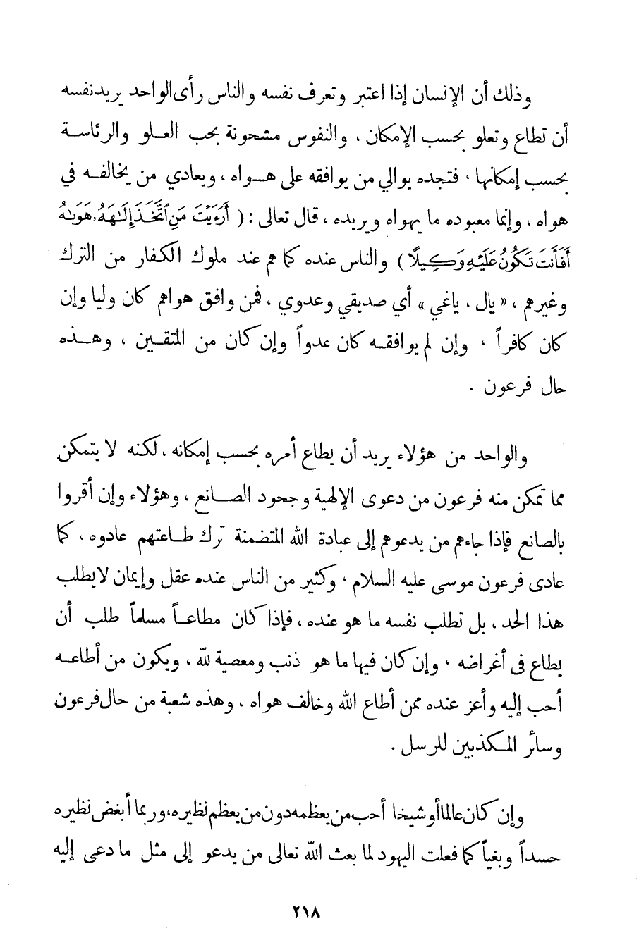 وَذَلِكَ أَنَّ الْإِنْسَانَ إذَا اعْتَبَرَ وَتَعَرَّفَ نَفْسَهُ وَالنَّاسَ رَأَى الْوَاحِدَ يُرِيدُ نَفْسَهُ أَنْ تُطَاعَ وَتَعْلُوَ بِحَسَبِ الْإِمْكَانِ، وَالنُّفُوسُ مَشْحُونَةٌ بِحُبِّ الْعُلُوِّ وَالرِّئَاسَةِ بِحَسَبِ إمْكَانِهَا، فَتَجِدُهُ يُوَالِي مَنْ يُوَافِقُهُ عَلَى هَوَاهُ، وَيُعَادِي مَنْ يُخَالِفُهُ فِي هَوَاهُ، وَإِنَّمَا مَعْبُودُهُ مَا يَهْوَاهُ وَيُرِيدُهُ، قَالَ تَعَالَى: {أَرَأَيْتَ مَنِ اتَّخَذَ إلَهَهُ هَوَاهُ أَفَأَنْتَ تَكُونُ عَلَيْهِ وَكِيلًا} وَالنَّاسُ عِنْدَهُ كَمَا هُمْ عِنْدَ مُلُوكِ الْكُفَّارِ مِنْ التُّرْكِ وَغَيْرِهِمْ، " يال، ياغي " أَيْ صَدِيقِي وَعَدُوِّي، فَمَنْ وَافَقَ هَوَاهُمْ كَانَ وَلِيًّا وَإِنْ كَانَ كَافِرًا، وَإِنْ لَمْ يُوَافِقْهُ كَانَ عَدُوًّا وَإِنْ كَانَ مِنْ الْمُتَّقِينَ، وَهَذِهِ حَالُ فِرْعَوْنَ. وَالْوَاحِدُ مِنْ هَؤُلَاءِ يُرِيدُ أَنْ يُطَاعَ أَمْرُهُ بِحَسَبِ إمْكَانِهِ، لَكِنَّهُ لَا يَتَمَكَّنُ مِمَّا تَمَكَّنَ مِنْهُ فِرْعَوْنُ مِنْ دَعْوَى الْإِلَهِيَّةِ وَجُحُودِ الصَّانِعِ، وَهَؤُلَاءِ وَإِنْ أَقَرُّوا بِالصَّانِعِ فَإِذَا جَاءَهُمْ مَنْ يَدْعُوهُمْ إلَى عِبَادَةِ اللَّهِ الْمُتَضَمِّنَةِ تَرْكَ طَاعَتِهِمْ عَادَوْهُ، كَمَا عَادَى فِرْعَوْنُ مُوسَى عَلَيْهِ السَّلَامُ وَكَثِيرٌ مِنْ النَّاسِ عِنْدَهُ عَقْلٌ وَإِيمَانٌ لَا يَطْلُبُ هَذَا الْحَدَّ، بَلْ تَطْلُبُ نَفْسُهُ مَا هُوَ عِنْدَهُ، فَإِذَا كَانَ مُطَاعًا مُسْلِمًا طَلَبَ أَنْ يُطَاعَ فِي أَغْرَاضِهِ، وَإِنْ كَانَ فِيهَا مَا هُوَ ذَنْبٌ وَمَعْصِيَةٌ لِلَّهِ، وَيَكُونُ مَنْ أَطَاعَهُ أَحَبَّ إلَيْهِ وَأَعَزَّ عِنْدَهُ مِمَّنْ أَطَاعَ اللَّهَ وَخَالَفَ هَوَاهُ، وَهَذِهِ شُعْبَةٌ مِنْ حَالِ فِرْعَوْنَ وَسَائِرِ الْمُكَذِّبِينَ لِلرُّسُلِ. وَإِنْ كَانَ عَالِمًا أَوْ شَيْخًا أَحَبَّ مَنْ يُعَظِّمُهُ دُونَ مَنْ يُعَظِّمُ نَظِيرَهُ، وَرُبَّمَا أَبْغَضَ نَظِيرَهُ حَسَدًا وَبَغْيًا كَمَا فَعَلَتْ الْيَهُودُ لَمَّا بَعَثَ اللَّهُ تَعَالَى مَنْ يَدْعُو إلَى مِثْلِ مَا دَعا إلَيْهِ
