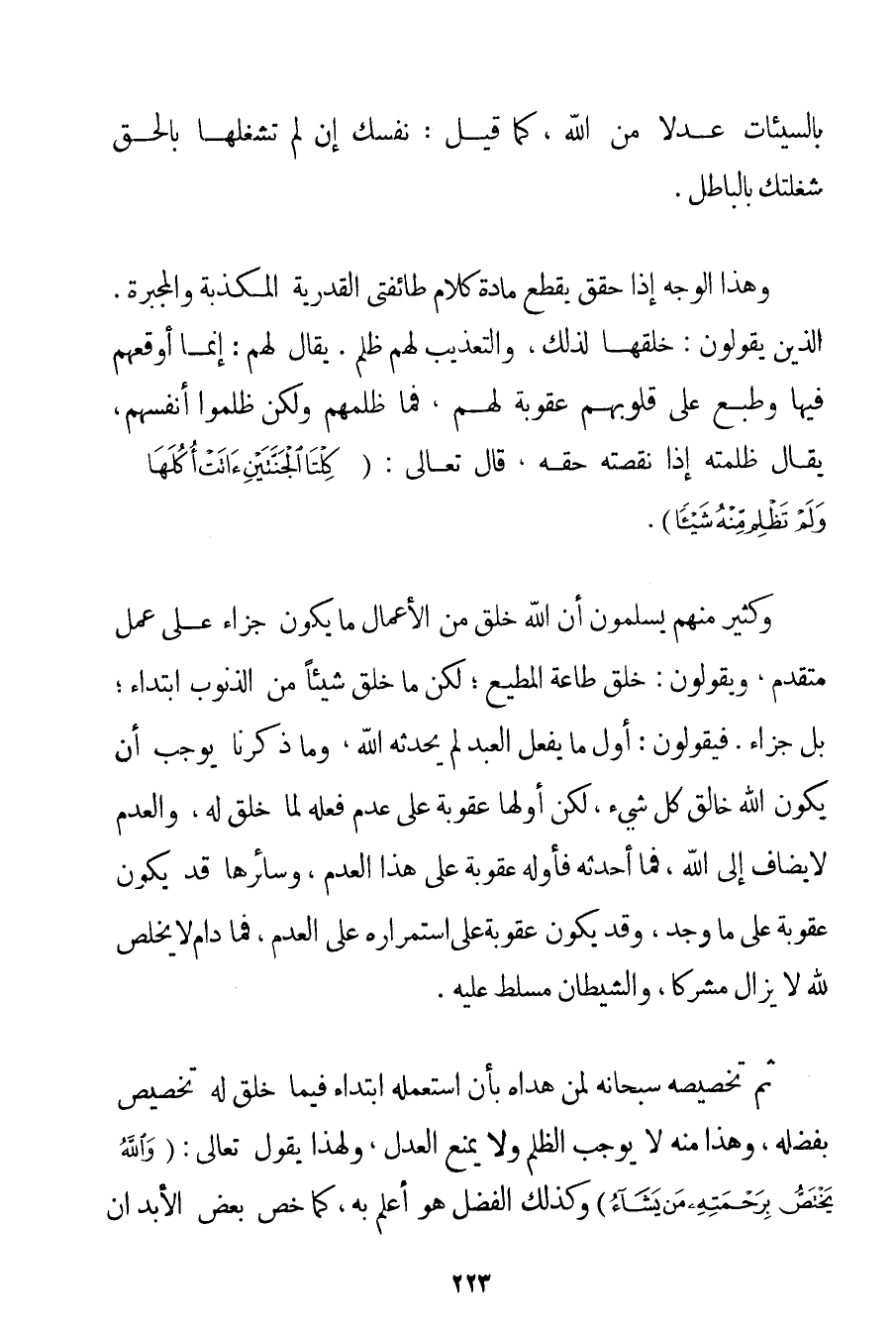 بِالسَّيِّئَاتِ عَدْلًا مِنْ اللَّهِ، كَمَا قِيلَ: نَفْسُكَ إنْ لَمْ تَشْغَلْهَا بِالْحَقِّ شَغَلَتْكَ بِالْبَاطِلِ. وَهَذَا الْوَجْهُ إذَا حُقِّقَ يَقْطَعُ مَادَّةَ كَلَامِ طَائِفَتَيْ الْقَدَرِيَّةِ الْمُكَذِّبَةِ وَالْمُجْبِرَةِ. الَّذِينَ يَقُولُونَ: خَلَقَهَا لِذَلِكَ، وَالتَّعْذِيبُ لَهُمْ ظُلْمٌ. يُقَالُ لَهُمْ: إنَّمَا أَوْقَعَهُمْ فِيهَا وَطَبَعَ عَلَى قُلُوبِهِمْ عُقُوبَةً لَهُمْ، فَمَا ظَلَمَهُمْ وَلَكِنْ ظَلَمُوا أَنْفُسَهُمْ، يُقَالُ ظَلَمْتَهُ إذَا نَقَصْتَهُ حَقَّهُ، قَالَ تَعَالَى: {كِلْتَا الْجَنَّتَيْنِ آتَتْ أُكُلَهَا وَلَمْ تَظْلِمْ مِنْهُ شَيْئًا} . وَكَثِيرٌ مِنْهُمْ يُسَلِّمُونَ أَنَّ اللَّهَ خَلَقَ مِنْ الْأَعْمَالِ مَا يَكُونُ جَزَاءً عَلَى عَمَلٍ مُتَقَدِّمٍ، وَيَقُولُونَ: خَلَقَ طَاعَةَ الْمُطِيعِ؛ لَكِنْ مَا خَلَقَ شَيْئًا مِنْ الذُّنُوبِ ابْتِدَاءً؛ بَلْ جَزَاءً. فَيَقُولُونَ: أَوَّلُ مَا يَفْعَلُ الْعَبْدُ لَمْ يُحْدِثْهُ اللَّهُ، وَمَا ذَكَرْنَا يُوجِبُ أَنْ يَكُونَ اللَّهُ خَالِقَ كُلِّ شَيْءٍ، لَكِنَّ أَوَّلَهَا عُقُوبَةٌ عَلَى عَدَمِ فِعْلِهِ لِمَا خُلِقَ لَهُ، وَالْعَدَمُ لَا يُضَافُ إلَى اللَّهِ، فَمَا أَحْدَثَهُ فَأَوَّلُهُ عُقُوبَةٌ عَلَى هَذَا الْعَدَمِ، وَسَائِرُهَا قَدْ يَكُونُ عُقُوبَةً عَلَى مَا وُجِدَ، وَقَدْ يَكُونُ عُقُوبَةً عَلَى اسْتِمْرَارِهِ عَلَى الْعَدَمِ، فَمَا دَامَ لَا يُخْلِصُ لِلَّهِ لَا يَزَالُ مُشْرِكًا، وَالشَّيْطَانُ مُسَلَّطٌ عَلَيْهِ. ثُمَّ تَخْصِيصُهُ سُبْحَانَهُ لِمَنْ هَدَاهُ بِأَنْ اسْتَعْمَلَهُ ابْتِدَاءً فِيمَا خُلِقَ لَهُ تَخْصِيصٌ بِفَضْلِهِ، وَهَذَا مِنْهُ لَا يُوجِبُ الظُّلْمَ وَلَا يَمْنَعُ الْعَدْلَ، وَلِهَذَا يَقُولُ تَعَالَى: {وَاللَّهُ يَخْتَصُّ بِرَحْمَتِهِ مَنْ يَشَاءُ} وَكَذَلِكَ الْفَضْلُ هُوَ أَعْلَمُ بِهِ، كَمَا خَصَّ بَعْضَ الْأَبْدَانِ