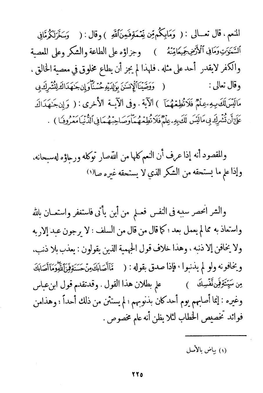 الْمُنْعِمُ. قَالَ تَعَالَى: {وَمَا بِكُمْ مِنْ نِعْمَةٍ فَمِنَ اللَّهِ} وَقَالَ: {وَسَخَّرَ لَكُمْ مَا فِي السَّمَاوَاتِ وَمَا فِي الْأَرْضِ جَمِيعًا مِنْهُ} وَجَزَاؤُهُ عَلَى الطَّاعَةِ وَالشُّكْرِ وَعَلَى الْمَعْصِيَةِ وَالْكُفْرِ لَا يَقْدِرُ أَحَدٌ عَلَى مِثْلِهِ، فَلِهَذَا لَمْ يَجُزْ أَنْ يُطَاعَ مَخْلُوقٌ فِي مَعْصِيَةِ الْخَالِقِ، وَقَالَ تَعَالَى: {وَوَصَّيْنَا الْإِنْسَانَ بِوَالِدَيْهِ حُسْنًا وَإِنْ جَاهَدَاكَ لِتُشْرِكَ بِي مَا لَيْسَ لَكَ بِهِ عِلْمٌ فَلَا تُطِعْهُمَا} الْآيَةَ. وَفِي الْآيَةِ الْأُخْرَى: {وَإِنْ جَاهَدَاكَ عَلى أَنْ تُشْرِكَ بِي مَا لَيْسَ لَكَ بِهِ عِلْمٌ فَلَا تُطِعْهُمَا وَصَاحِبْهُمَا فِي الدُّنْيَا مَعْرُوفًا} . وَالْمَقْصُودُ أَنَّهُ إذَا عَرَفَ أَنَّ النِّعَمَ كُلَّهَا مِنْ اللَّهِ صَارَ تَوَكُّلُهُ وَرَجَاؤُهُ لَهُ سُبْحَانَهُ، وَإِذَا عَلِمَ مَا يَسْتَحِقُّهُ مِنْ الشُّكْرِ الَّذِي لَا يَسْتَحِقُّهُ غَيْرُهُ. . . (1) وَالشَّرُّ انْحَصَرَ سَبَبُهُ فِي النَّفْسِ، فَعَلِمَ مِنْ أَيْنَ يَؤْتَى فَاسْتَغْفَرَ وَاسْتَعَانَ بِاَللَّهِ وَاسْتَعَاذَ بِهِ مِمَّا لَمْ يَعْمَلْ بَعْدُ؛ كَمَا قَالَ مَنْ قَالَ مِنْ السَّلَفِ: لَا يَرْجُوَنَّ عَبْدٌ إلَّا رَبَّهُ وَلَا يَخَافَنَّ إلَّا ذَنْبَهُ، وَهَذَا خِلَافُ قَوْلِ الْجَهْمِيَّة الَّذِينَ يَقُولُونَ: يُعَذِّبُ بِلَا ذَنْبٍ، وَيَخَافُونَهُ وَلَوْ لَمْ يُذْنِبُوا، فَإِذَا صَدَّقَ بِقَوْلِهِ: {مَا أَصَابَكَ مِنْ حَسَنَةٍ فَمِنَ اللَّهِ وَمَا أَصَابَكَ مِنْ سَيِّئَةٍ فَمِنْ نَفْسِكَ} عَلِمَ بُطْلَانَ هَذَا الْقَوْلِ. وَقَدْ تَقَدَّمَ قَوْلُ ابْنِ عَبَّاسٍ وَغَيْرِهِ: إنَّ مَا أَصَابَهُمْ يَوْمَ أُحُدٍ كَانَ بِذُنُوبِهِمْ: لَمْ يَسْتَثْنِ مِنْ ذَلِكَ أَحَدًا؛ وَهَذَا مِنْ فَوَائِدِ تَخْصِيصِ الْخِطَابِ لِئَلَّا يُظَنَّ أَنَّهُ عَامٌّ مَخْصُوصٌ.