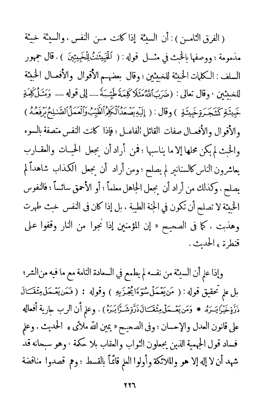الْفَرْقُ الثَّامِنُ: أَنَّ السَّيِّئَةَ إذَا كَانَتْ مِنْ النَّفْسِ، وَالسَّيِّئَةُ خَبِيثَةٌ مَذْمُومَةٌ. وَوَصْفُهَا بِالْخُبْثِ فِي مِثْلِ قَوْلِهِ: {الْخَبِيثَاتُ لِلْخَبِيثِينَ} . قَالَ جُمْهُورُ السَّلَفِ: الْكَلِمَاتُ الْخَبِيثَةُ لِلْخَبِيثِينَ؛ وَقَالَ بَعْضُهُمْ الْأَقْوَالُ وَالْأَفْعَالُ الْخَبِيثَةُ لِلْخَبِيثِينَ، وَقَالَ تَعَالَى: {ضَرَبَ اللَّهُ مَثَلًا كَلِمَةً طَيِّبَةً} - إلَى قَوْلِهِ - {وَمَثَلُ كَلِمَةٍ خَبِيثَةٍ كَشَجَرَةٍ خَبِيثَةٍ} وَقَالَ: {إلَيْهِ يَصْعَدُ الْكَلِمُ الطَّيِّبُ وَالْعَمَلُ الصَّالِحُ يَرْفَعُهُ} وَالْأَقْوَالُ وَالْأَفْعَالُ صِفَاتُ الْقَائِلِ الْفَاعِلِ؛ فَإِذَا كَانَتْ النَّفْسُ مُتَّصِفَةً بِالسُّوءِ وَالْخُبْثِ لَمْ يَكُنْ مَحَلُّهَا إلَّا مَا يُنَاسِبُهَا؛ فَمَنْ أَرَادَ أَنْ يَجْعَلَ الْحَيَّاتِ وَالْعَقَارِبَ يُعَاشِرُونَ النَّاسَ كَالسَّنَانِيرِ لَمْ يَصْلُحْ؛ وَمَنْ أَرَادَ أَنْ يَجْعَلَ الْكَذِبَ شَاهِدًا لَمْ يَصْلُحْ، وَكَذَلِكَ مَنْ أَرَادَ أَنْ يَجْعَلَ الْجَاهِلَ مُعَلِّمًا؛ أَوْ الْأَحْمَقَ سَائِسًا؛ فَالنَّفُوسُ الْخَبِيثَةُ لَا تَصْلُحُ أَنْ تَكُونَ فِي الْجَنَّةِ الطَّيِّبَةِ، بَلْ إذَا كَانَ فِي النَّفْسِ خُبْثٌ طَهُرَتْ وَهُذِّبَتْ، كَمَا فِي الصَّحِيحِ {إنَّ الْمُؤْمِنِينَ إذَا نَجَوْا مِنْ النَّارِ وُقِفُوا عَلَى قَنْطَرَةٍ} الْحَدِيثَ. وَإِذَا عَلِمَ أَنَّ السَّيِّئَةَ مِنْ نَفْسِهِ لَمْ يَطْمَعْ فِي السَّعَادَةِ التَّامَّةِ مَعَ مَا فِيهِ مِنْ الشَّرِّ؛ بَلْ عَلِمَ تَحْقِيقَ قَوْلِهِ: {مَنْ يَعْمَلْ سُوءًا يُجْزَ بِهِ} وَقَوْلِهِ: {فَمَنْ يَعْمَلْ مِثْقَالَ ذَرَّةٍ خَيْرًا يَرَهُ} {وَمَنْ يَعْمَلْ مِثْقَالَ ذَرَّةٍ شَرًّا يَرَهُ} . وَعَلِمَ أَنَّ الرَّبَّ جَارِيَةٌ أَفْعَالُهُ عَلَى قَانُونِ الْعَدْلِ وَالْإِحْسَانِ؛ وَفِي الصَّحِيحِ {يَمِينُ اللَّهِ مَلْأَى} الْحَدِيثَ، وَعَلِمَ فَسَادَ قَوْلِ الْجَهْمِيَّة الَّذِينَ يَجْعَلُونَ الثَّوَابَ وَالْعِقَابَ بِلَا حِكْمَةٍ، وَهُوَ سُبْحَانَهُ قَدْ شَهِدَ أَنْ لَا إلَهَ إلَّا هُوَ وَالْمَلَائِكَةُ وَأُولُوا الْعِلْمِ قَائِمًا بِالْقِسْطِ؛ وَهُمْ قَصَدُوا مُنَاقَضَةَ