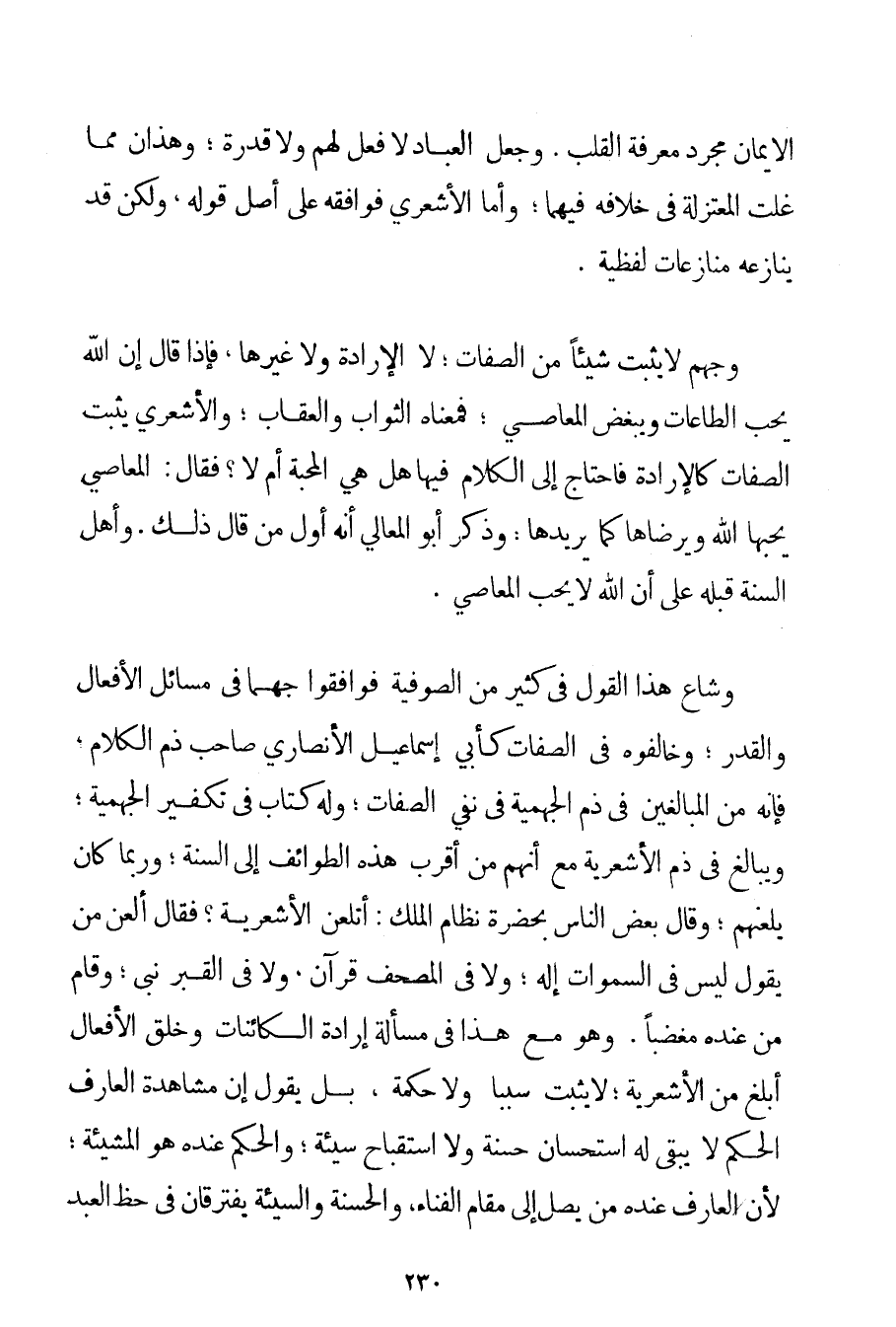 الْإِيمَانَ مُجَرَّدَ مَعْرِفَةِ الْقَلْبِ. وَجَعَلَ الْعِبَادَ لَا فِعْلَ لَهُمْ وَلَا قُدْرَةَ؛ وَهَذَانِ مِمَّا غَلَتْ الْمُعْتَزِلَةُ فِي خِلَافِهِ فِيهِمَا؛ وَأَمَّا الْأَشْعَرِيُّ فَوَافَقَهُ عَلَى أَصْلِ قَوْلِهِ، وَلَكِنْ قَدْ يُنَازِعُهُ مُنَازَعَاتٌ لَفْظِيَّةٌ. وَجَهْمٌ لَا يُثْبِتُ شَيْئًا مِنْ الصِّفَاتِ؛ لَا الْإِرَادَةَ وَلَا غَيْرَهَا، فَإِذَا قَالَ إنَّ اللَّهَ يُحِبُّ الطَّاعَاتِ وَيُبْغِضُ الْمَعَاصِيَ؛ فَمَعْنَاهُ الثَّوَابُ وَالْعِقَابُ؛ وَالْأَشْعَرِيُّ يُثْبِتُ الصِّفَاتِ كَالْإِرَادَةِ فَاحْتَاجَ إلَى الْكَلَامِ فِيهَا هَلْ هِيَ الْمَحَبَّةُ أَمْ لَا؟ فَقَالَ: الْمَعَاصِي يُحِبُّهَا اللَّهُ وَيَرْضَاهَا كَمَا يُرِيدُهَا: وَذَكَرَ أَبُو الْمَعَالِي أَنَّهُ أَوَّلُ مَنْ قَالَ ذَلِكَ. وَأَهْلُ السُّنَّةِ قَبْلَهُ عَلَى أَنَّ اللَّهَ لَا يُحِبُّ الْمَعَاصِيَ. وَشَاعَ هَذَا الْقَوْلُ فِي كَثِيرٍ مِنْ الصُّوفِيَّةِ فَوَافَقُوا جَهْمًا فِي مَسَائِلِ الْأَفْعَالِ وَالْقَدَرِ؛ وَخَالَفُوهُ فِي الصِّفَاتِ كَأَبِي إسْمَاعِيلَ الْأَنْصَارِيِّ صَاحِبِ ذَمِّ الْكَلَامِ، فَإِنَّهُ مِنْ الْمُبَالِغِينَ فِي ذَمِّ الْجَهْمِيَّة فِي نَفْيِ الصِّفَاتِ؛ وَلَهُ كِتَابٌ فِي تَكْفِيرِ الْجَهْمِيَّة؛ وَيُبَالِغُ فِي ذَمِّ الْأَشْعَرِيَّةِ مَعَ أَنَّهُمْ مِنْ أَقْرَبِ هَذِهِ الطَّوَائِفِ إلَى السُّنَّةِ؛ وَرُبَّمَا كَانَ يَلْعَنُهُمْ؛ وَقَالَ بَعْضُ النَّاسِ بِحَضْرَةِ نِظَامِ الْمَلِكِ: أَتَلْعَنُ الْأَشْعَرِيَّةَ؟ فَقَالَ أَلْعَنُ مَنْ يَقُولُ لَيْسَ فِي السَّمَوَاتِ إلَهٌ؛ وَلَا فِي الْمُصْحَفِ قُرْآنٌ، وَلَا فِي الْقَبْرِ نَبِيٌّ؛ وَقَامَ مِنْ عِنْدِهِ مُغْضَبًا. وَهُوَ مَعَ هَذَا فِي مَسْأَلَةِ إرَادَةِ الْكَائِنَاتِ وَخَلْقِ الْأَفْعَالِ أَبْلَغُ مِنْ الْأَشْعَرِيَّةِ؛ لَا يُثْبِتُ سَبَبًا وَلَا حِكْمَةً، بَلْ يَقُولُ إنَّ مُشَاهَدَةَ الْعَارِفِ الْحُكْمَ لَا يُبْقِ لَهُ اسْتِحْسَانَ حَسَنَةٍ وَلَا اسْتِقْبَاحَ سَيِّئَةٍ؛ وَالْحُكْمُ عِنْدَهُ هُوَ الْمَشِيئَةُ؛ لِأَنَّ الْعَارِفَ عِنْدَهُ مَنْ يَصِلُ إلَى مَقَامِ الْفَنَاءِ، وَالْحَسَنَةُ وَالسَّيِّئَةُ يَفْتَرِقَانِ فِي حَظِّ الْعَبْدِ