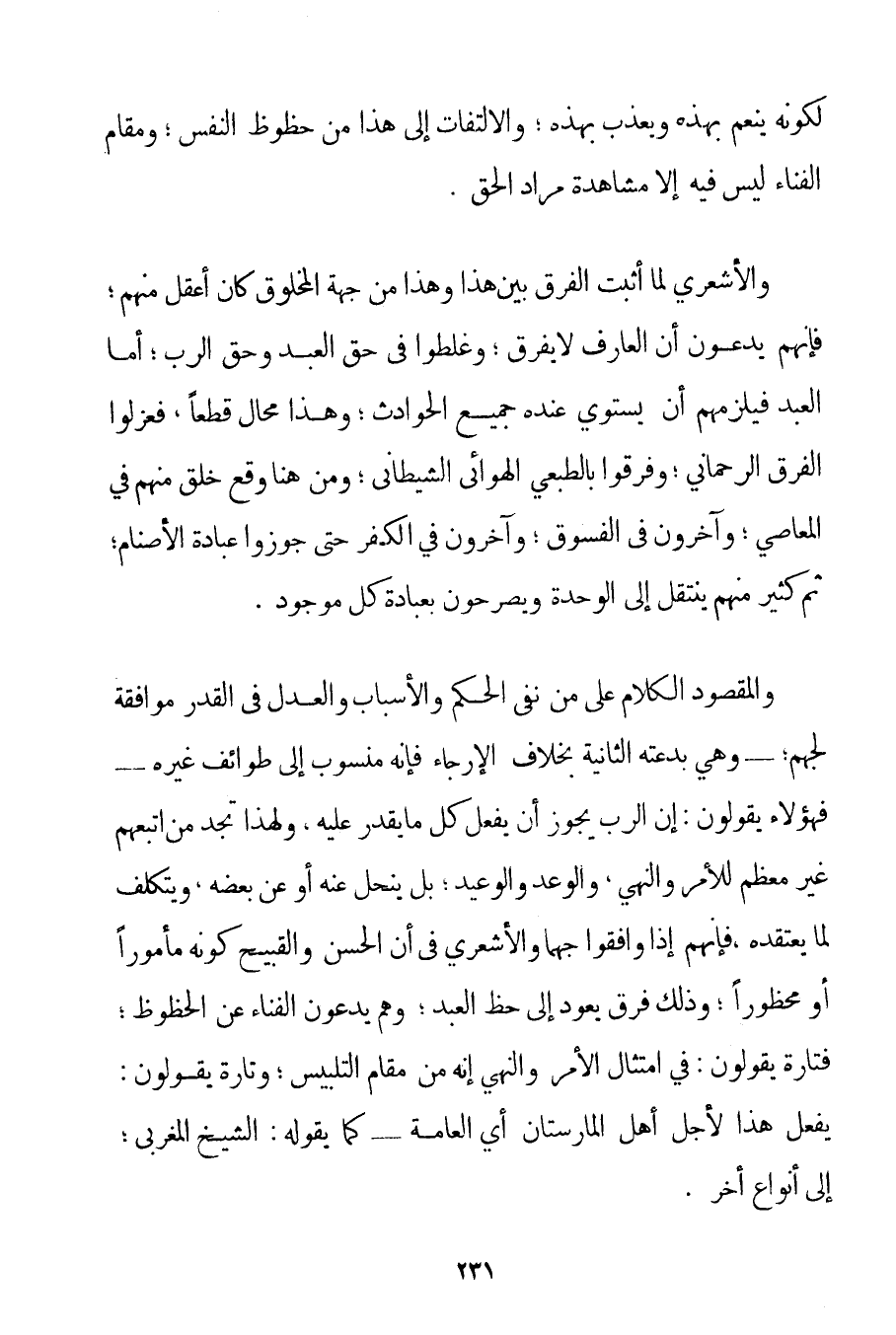 كَوْنِهِ يُنَعَّمُ بِهَذِهِ وَيُعَذَّبُ بِهَذِهِ؛ وَالِالْتِفَاتُ إلَى هَذَا مِنْ حُظُوظِ النَّفْسِ؛ وَمَقَامُ الْفَنَاءِ لَيْسَ فِيهِ إلَّا مُشَاهَدَةُ مُرَادِ الْحَقِّ. وَالْأَشْعَرِيُّ لَمَّا أَثْبَتَ الْفَرْقَ بَيْنَ هَذَا وَهَذَا مِنْ جِهَةِ الْمَخْلُوقِ كَانَ أَعْقَلَ مِنْهُمْ؛ فَإِنَّهُمْ يَدَّعُونَ أَنَّ الْعَارِفَ لَا يُفَرِّقُ؛ وَغَلِطُوا فِي حَقِّ الْعَبْدِ وَحَقِّ الرَّبِّ؛ أَمَّا الْعَبْدُ فَيَلْزَمُهُمْ أَنْ يَسْتَوِيَ عِنْدَهُ جَمِيعُ الْحَوَادِثِ؛ وَهَذَا مُحَالٌ قَطْعًا، فَعَزَلُوا الْفَرْقَ الرَّحْمَانِيَّ؛ وَفَرَّقُوا بِالطَّبْعِيِّ الْهَوَائِيِّ الشَّيْطَانِيِّ؛ وَمِنْ هُنَا وَقَعَ خَلْقٌ مِنْهُمْ فِي الْمَعَاصِي؛ وَآخَرُونَ فِي الْفُسُوقِ؛ وَآخَرُونَ فِي الْكُفْرِ حَتَّى جَوَّزُوا عِبَادَةَ الْأَصْنَامِ؛ ثُمَّ كَثِيرٌ مِنْهُمْ يَنْتَقِلُ إلَى الْوِحْدَةِ وَيُصَرِّحُونَ بِعِبَادَةِ كُلِّ مَوْجُودٍ. وَالْمَقْصُودُ الْكَلَامُ عَلَى مَنْ نَفَى الْحُكْمَ وَالْأَسْبَابَ وَالْعَدْلَ فِي الْقَدَرِ مُوَافَقَةً لِجَهْمِ؛ - وَهِيَ بِدْعَتُهُ الثَّانِيَةُ بِخِلَافِ الْإِرْجَاءِ فَإِنَّهُ مَنْسُوبٌ إلَى طَوَائِفَ غَيْرِهِ - فَهَؤُلَاءِ يَقُولُونَ: إنَّ الرَّبَّ يَجُوزُ أَنْ يَفْعَلَ كُلَّ مَا يَقْدِرُ عَلَيْهِ، وَلِهَذَا تَجِدُ مَنْ اتَّبَعَهُمْ غَيْرَ مُعَظِّمٍ لِلْأَمْرِ وَالنَّهْيِ، وَالْوَعْدِ وَالْوَعِيدِ؛ بَلْ يَنْحَلُّ عَنْهُ أَوْ عَنْ بَعْضِهِ، وَيَتَكَلَّفُ لِمَا يَعْتَقِدُهُ، فَإِنَّهُمْ إذَا وَافَقُوا جَهْمًا وَالْأَشْعَرِيَّ فِي أَنَّ الْحَسَنَ وَالْقَبِيحَ كَوْنُهُ مَأْمُورًا أَوْ مَحْظُورًا؛ وَذَلِكَ فَرْقٌ يَعُودُ إلَى حَظِّ الْعَبْدِ؛ وَهُمْ يَدَّعُونَ الْفَنَاءَ عَنْ الْحُظُوظِ؛ فَتَارَةً يَقُولُونَ: فِي امْتِثَالِ الْأَمْرِ وَالنَّهْيِ إنَّهُ مِنْ مَقَامِ التَّلْبِيسِ؛ وَتَارَةً يَقُولُونَ: يَفْعَلُ هَذَا لِأَجْلِ أَهْلِ الْمَارَسْتَانِ أَيْ الْعَامَّةِ - كَمَا يَقُولُهُ: الشَّيْخُ الْمَغْرِبِيُّ؛ إلَى أَنْوَاعٍ أُخَرَ.