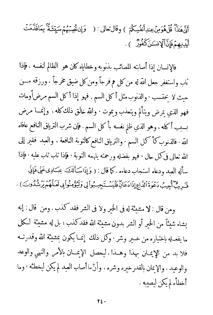 أَنَّى هَذَا قُلْ هُوَ مِنْ عِنْدِ أَنْفُسِكُمْ} وَقَالَ تَعَالَى: {وَإِنْ تُصِبْهُمْ سَيِّئَةٌ بِمَا قَدَّمَتْ أَيْدِيهِمْ فَإِنَّ الْإِنْسَانَ كَفُورٌ} . فَالْإِنْسَانُ إذَا أَصَابَتْهُ الْمَصَائِبُ بِذُنُوبِهِ وَخَطَايَاهُ كَانَ هُوَ الظَّالِمَ لِنَفْسِهِ، فَإِذَا تَابَ وَاسْتَغْفَرَ جَعَلَ اللَّهُ لَهُ مِنْ كُلِّ هَمٍّ فَرَجًا وَمِنْ كُلِّ ضِيقٍ مَخْرَجًا، وَرَزَقَهُ مِنْ حَيْثُ لَا يَحْتَسِبُ، وَالذُّنُوبُ مِثْلُ أَكْلِ السُّمِّ. فَهُوَ إذَا أَكَلَ السُّمَّ مَرِضَ أَوْ مَاتَ فَهُوَ الَّذِي يَمْرَضُ وَيَتَأَلَّمُ وَيَتَعَذَّبُ وَيَمُوتُ، وَاَللَّهُ خَالِقُ ذَلِكَ كُلِّهِ، وَإِنَّمَا مَرِضَ بِسَبَبِ أَكْلِهِ، وَهُوَ الَّذِي ظَلَمَ نَفْسَهُ بِأَكْلِ السُّمِّ. فَإِنْ شَرِبَ التِّرْيَاقَ النَّافِعَ عَافَاهُ اللَّهُ، فَالذُّنُوبُ كَأَكْلِ السُّمِّ، وَالتِّرْيَاقُ النَّافِعُ كَالتَّوْبَةِ النَّافِعَةِ، وَالْعَبْدُ فَقِيرٌ إلَى اللَّهِ تَعَالَى فِي كُلِّ حَالٍ، فَهُوَ بِفَضْلِهِ وَرَحْمَتِهِ يُلْهِمُهُ التَّوْبَةَ، فَإِذَا تَابَ تَابَ عَلَيْهِ، فَإِذَا سَأَلَهُ الْعَبْدُ وَدَعَاهُ اسْتَجَابَ دُعَاءَهُ. كَمَا قَالَ: {وَإِذَا سَأَلَكَ عِبَادِي عَنِّي فَإِنِّي قَرِيبٌ أُجِيبُ دَعْوَةَ الدَّاعِ إذَا دَعَانِ فَلْيَسْتَجِيبُوا لِي وَلْيُؤْمِنُوا بِي لَعَلَّهُمْ يَرْشُدُونَ} . وَمَنْ قَالَ: لَا مَشِيئَةَ لَهُ فِي الْخَيْرِ وَلَا فِي الشَّرِّ فَقَدْ كَذَبَ. وَمَنْ قَالَ: إنَّهُ يَشَاءُ شَيْئًا مِنْ الْخَيْرِ أَوْ الشَّرِّ بِدُونِ مَشِيئَةِ اللَّهِ فَقَدْ كَذَبَ؛ بَلْ لَهُ مَشِيئَةٌ لِكُلِّ مَا يَفْعَلُهُ بِاخْتِيَارِهِ مِنْ خَيْرٍ وَشَرٍّ، وَكُلُّ ذَلِكَ إنَّمَا يَكُونُ بِمَشِيئَةِ اللَّهِ وَقُدْرَتِهِ فَلَا بُدَّ مِنْ الْإِيمَانِ بِهَذَا وَهَذَا، لِيَحْصُلَ الْإِيمَانُ بِالْأَمْرِ وَالنَّهْيِ وَالْوَعْدِ وَالْوَعِيدِ، وَالْإِيمَانُ بِالْقَدَرِ خَيْرِهِ وَشَرِّهِ، وَأَنَّ مَا أَصَابَ الْعَبْدَ لَمْ يَكُنْ لِيُخْطِئَهُ، وَمَا أَخْطَأَهُ لَمْ يَكُنْ لِيُصِيبَهُ.