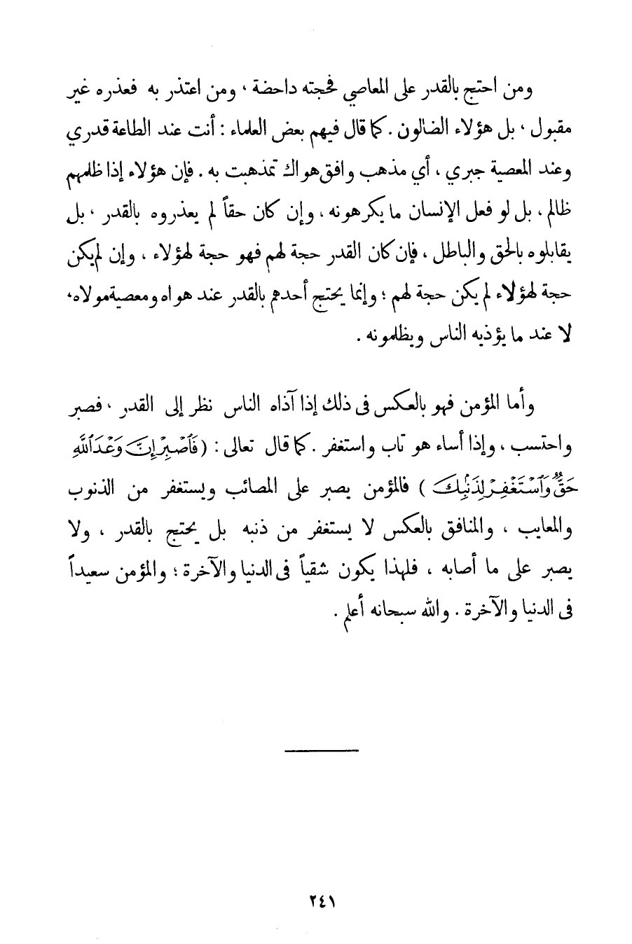 وَمَنْ احْتَجَّ بِالْقَدَرِ عَلَى الْمَعَاصِي فَحُجَّتُهُ دَاحِضَةٌ، وَمَنْ اعْتَذَرَ بِهِ فَعُذْرُهُ غَيْرُ مَقْبُولٍ، بَلْ هَؤُلَاءِ الضَّالُّونَ. كَمَا قَالَ فِيهِمْ بَعْضُ الْعُلَمَاءِ: أَنْتَ عِنْدَ الطَّاعَةِ قَدَرِيٌّ وَعِنْدَ الْمَعْصِيَةِ جَبْرِيٌّ، أَيُّ مَذْهَبٍ وَافَقَ هَوَاكَ تَمَذْهَبْتَ بِهِ. فَإِنَّ هَؤُلَاءِ إذَا ظَلَمَهُمْ ظَالِمٌ، بَلْ لَوْ فَعَلَ الْإِنْسَانُ مَا يَكْرَهُونَهُ، وَإِنْ كَانَ حَقًّا لَمْ يَعْذُرُوهُ بِالْقَدَرِ، بَلْ يُقَابِلُوهُ بِالْحَقِّ وَالْبَاطِلِ، فَإِنْ كَانَ الْقَدَرُ حُجَّةً لَهُمْ فَهُوَ حُجَّةٌ لِهَؤُلَاءِ، وَإِنْ لَمْ يَكُنْ حُجَّةً لِهَؤُلَاءِ لَمْ يَكُنْ حُجَّةً لَهُمْ؛ وَإِنَّمَا يَحْتَجُّ أَحَدُهُمْ بِالْقَدَرِ عِنْدَ هَوَاهُ وَمَعْصِيَةِ مَوْلَاهُ، لَا عِنْدَ مَا يُؤْذِيهِ النَّاسُ وَيَظْلِمُونَهُ. وَأَمَّا الْمُؤْمِنُ فَهُوَ بِالْعَكْسِ فِي ذَلِكَ إذَا آذَاهُ النَّاسُ نَظَرَ إلَى الْقَدَرِ، فَصَبَرَ وَاحْتَسَبَ، وَإِذَا أَسَاءَ هُوَ تَابَ وَاسْتَغْفَرَ. كَمَا قَالَ تَعَالَى: {فَاصْبِرْ إنَّ وَعْدَ اللَّهِ حَقٌّ وَاسْتَغْفِرْ لِذَنْبِكَ} فَالْمُؤْمِنُ يَصْبِرُ عَلَى الْمَصَائِبِ وَيَسْتَغْفِرُ مِنْ الذُّنُوبِ وَالْمَعَايِبِ، وَالْمُنَافِقُ بِالْعَكْسِ لَا يَسْتَغْفِرُ مِنْ ذَنْبِهِ بَلْ يَحْتَجُّ بِالْقَدَرِ، وَلَا يَصْبِرُ عَلَى مَا أَصَابَهُ، فَلِهَذَا يَكُونُ شَقِيًّا فِي الدُّنْيَا وَالْآخِرَةِ؛ وَالْمُؤْمِنُ سَعِيدًا فِي الدُّنْيَا وَالْآخِرَةِ. وَاَللَّهُ سُبْحَانَهُ أَعْلَمُ.