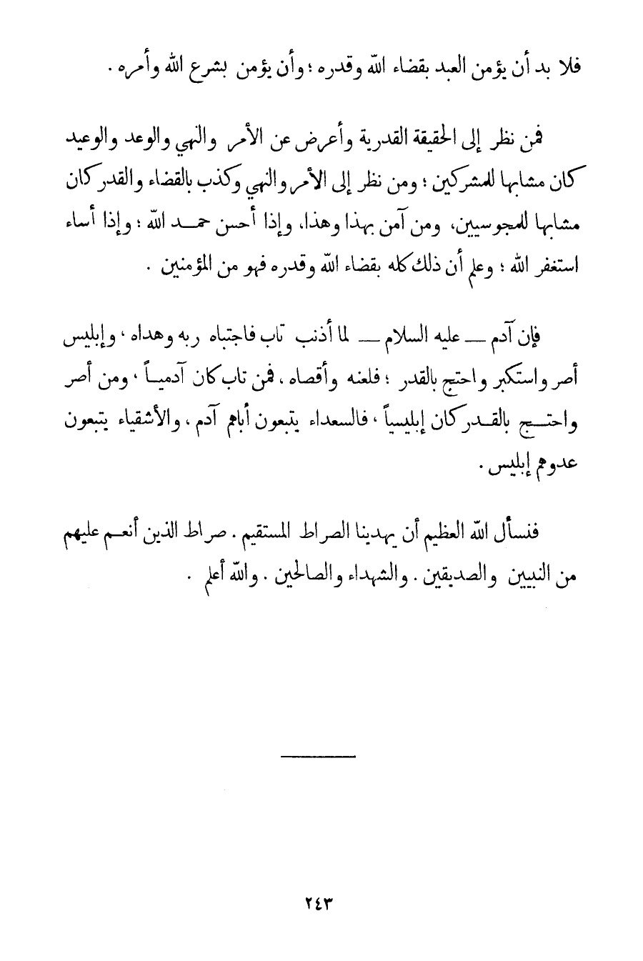 فَلَا بُدَّ أَنْ يُؤْمِنَ الْعَبْدُ بِقَضَاءِ اللَّهِ وَقَدَرِهِ؛ وَأَنْ يُؤْمِنَ بِشَرْعِ اللَّهِ وَأَمْرِهِ. فَمَنْ نَظَرَ إلَى الْحَقِيقَةِ الْقَدَرِيَّةِ وَأَعْرَضَ عَنْ الْأَمْرِ وَالنَّهْيِ وَالْوَعْدِ وَالْوَعِيدِ كَانَ مُشَابِهًا لِلْمُشْرِكِينَ؛ وَمَنْ نَظَرَ إلَى الْأَمْرِ وَالنَّهْيِ وَكَذَّبَ بِالْقَضَاءِ وَالْقَدَرِ كَانَ مُشَابِهًا لِلْمَجُوسِيِّينَ، وَمَنْ آمَنَ بِهَذَا وَهَذَا، وَإِذَا أَحْسَنَ حَمِدَ اللَّهَ؛ وَإِذَا أَسَاءَ اسْتَغْفَرَ اللَّهَ؛ وَعَلِمَ أَنَّ ذَلِكَ كُلَّهُ بِقَضَاءِ اللَّهِ وَقَدَرِهِ فَهُوَ مِنْ الْمُؤْمِنِينَ. فَإِنَّ آدَمَ - عَلَيْهِ السَّلَامُ - لَمَّا أَذْنَبَ تَابَ فَاجْتَبَاهُ رَبُّهُ وَهَدَاهُ، وَإِبْلِيسُ أَصَرَّ وَاسْتَكْبَرَ وَاحْتَجَّ بِالْقَدَرِ؛ فَلَعَنَهُ وَأَقْصَاهُ، فَمَنْ تَابَ كَانَ آدَمِيًّا، وَمَنْ أَصَرَّ وَاحْتَجَّ بِالْقَدَرِ كَانَ إبليسيا، فَالسُّعَدَاءُ يَتَّبِعُونَ أَبَاهُمْ آدَمَ، وَالْأَشْقِيَاءُ يَتَّبِعُونَ عَدُوَّهُمْ إبْلِيسَ. فَنَسْأَلُ اللَّهَ الْعَظِيمَ أَنْ يَهْدِيَنَا الصِّرَاطَ الْمُسْتَقِيمَ. صِرَاطَ الَّذِينَ أَنْعَمَ عَلَيْهِمْ مِنْ النَّبِيِّينَ وَالصِّدِّيقِينَ. وَالشُّهَدَاءِ وَالصَّالِحِينَ. وَاَللَّهُ أَعْلَمُ.