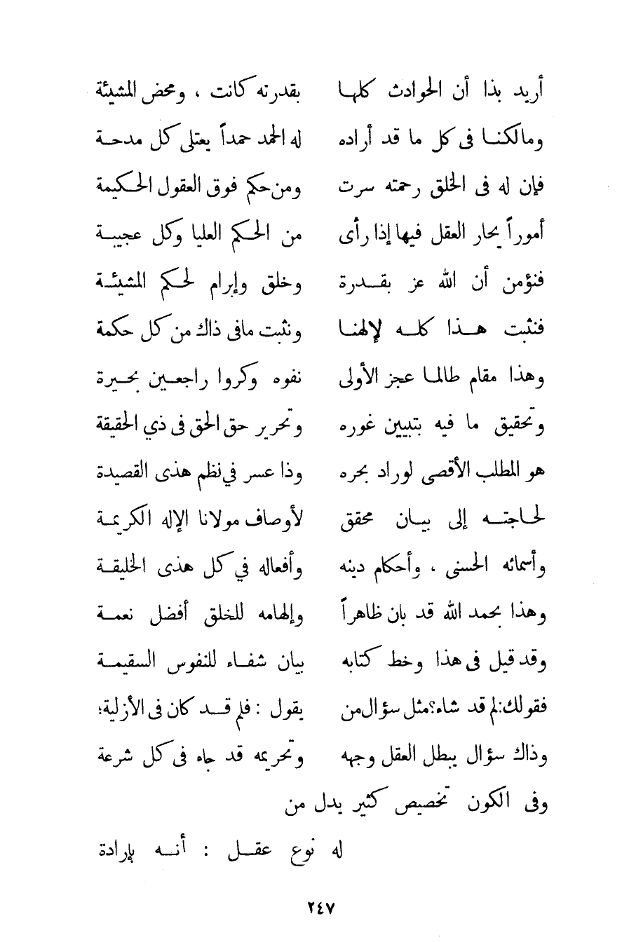 أُرِيدَ بِذَا أَنَّ الْحَوَادِثَ كُلَّهَا ... بِقُدْرَتِهِ كَانَتْ وَمَحْضِ الْمَشِيئَةِ