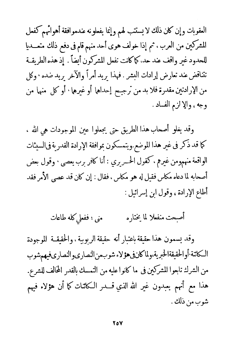 الْعُقُوبَاتِ وَإِنْ كَانَ ذَلِكَ لَا يَسْتَتِبُّ لَهُمْ وَإِنَّمَا يَفْعَلُونَهُ عِنْدَ مُوَافَقَةِ أَهْوَائِهِمْ كَفِعْلِ الْمُشْرِكِينَ مِنْ الْعَرَبِ ثُمَّ إذَا خُولِفَ هَوَى أَحَدٍ مِنْهُمْ قَامَ فِي دَفْعِ ذَلِكَ مُتَعَدِّيًا لِلْحُدُودِ غَيْرَ وَاقِفٍ عِنْدَ حَدٍّ كَمَا كَانَتْ تَفْعَلُ الْمُشْرِكُونَ أَيْضًا. إذْ هَذِهِ الطَّرِيقَةُ تَتَنَاقَضُ عِنْدَ تَعَارُضِ إرَادَاتِ الْبَشَرِ. فَهَذَا يُرِيدُ أَمْرًا وَالْآخَرُ يُرِيدُ ضِدَّهُ، وَكُلٌّ مِنْ الْإِرَادَتَيْنِ مُقَدَّرَةٌ فَلَا بُدَّ مِنْ تَرْجِيحِ إحْدَاهُمَا أَوْ غَيْرِهِمَا أَوْ كُلٍّ مِنْهُمَا مِنْ وَجْهٍ وَإِلَّا لَزِمَ الْفَسَادُ. وَقَدْ يَغْلُو أَصْحَابُ هَذَا الطَّرِيقِ حَتَّى يَجْعَلُوا عَيْنَ الْمَوْجُودَاتِ هِيَ اللَّهُ كَمَا قَدْ ذُكِرَ فِي غَيْرِ هَذَا الْمَوْضِعِ. وَيَتَمَسَّكُونَ بِمُوَافَقَةِ الْإِرَادَةِ الْقَدَرِيَّةِ فِي السَّيِّئَاتِ الْوَاقِعَةِ مِنْهُمْ وَمِنْ غَيْرِهِمْ كَقَوْلِ الْحَرِيرِيِّ: أَنَا كَافِرٌ بِرَبِّ يُعْصَى، وَقَوْلِ بَعْضِ أَصْحَابِهِ لَمَّا دَعَاهُ مكاس فَقِيلَ لَهُ هُوَ مكاس فَقَالَ: إنْ كَانَ قَدْ عَصَى الْأَمْرَ فَقَدْ أَطَاعَ الْإِرَادَةَ وَقَوْلُ ابْنِ إسْرَائِيلَ: أَصْبَحْت مُنْفَعِلًا لِمَا يَخْتَارُهُ مِنِّي فَفِعْلِي كُلُّهُ طَاعَاتٌ وَقَدْ يُسَمُّونَ هَذَا حَقِيقَةً بِاعْتِبَارِ أَنَّهُ حَقِيقَةُ الرُّبُوبِيَّةِ، وَالْحَقِيقَةُ الْمَوْجُودَةُ الْكَائِنَةُ أَوْ الْحَقِيقَةُ الْخَبَرِيَّةُ وَلَمَّا كَانَ فِي هَؤُلَاءِ شَوْبٌ مِنْ النَّصَارَى وَالنَّصَارَى فِيهِمْ شَوْبٌ مِنْ الشِّرْكِ تَابَعُوا الْمُشْرِكِينَ فِي مَا كَانُوا عَلَيْهِ مِنْ التَّمَسُّكِ بِالْقَدَرِ الْمُخَالِفِ لِلشَّرْعِ. هَذَا مَعَ أَنَّهُمْ يَعْبُدُونَ غَيْرَ اللَّهِ الَّذِي قَدَّرَ الْكَائِنَاتِ كَمَا أَنَّ هَؤُلَاءِ فِيهِمْ شَوْبٌ مِنْ ذَلِكَ