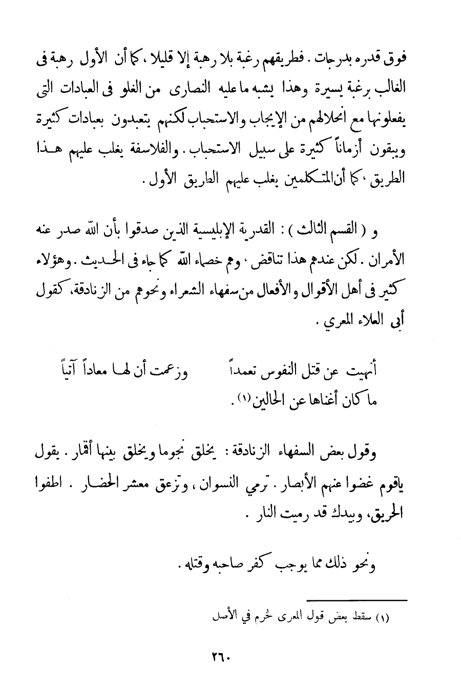 وَالْقِسْمُ الثَّالِثُ: الْقَدَرِيَّةُ الإبليسية الَّذِينَ صَدَّقُوا بِأَنَّ اللَّهَ صَدَرَ عَنْهُ الْأَمْرَانِ. لَكِنَّ عِنْدَهُمْ هَذَا تَنَاقُضٌ وَهُمْ خُصَمَاءُ اللَّهِ كَمَا جَاءَ فِي الْحَدِيثِ. وَهَؤُلَاءِ كَثِيرٌ فِي أَهْلِ الْأَقْوَالِ وَالْأَفْعَالِ مِنْ سُفَهَاءِ الشُّعَرَاءِ وَنَحْوِهِمْ مِنْ الزَّنَادِقَةِ كَقَوْلِ أَبِي الْعَلَاءِ المعري: