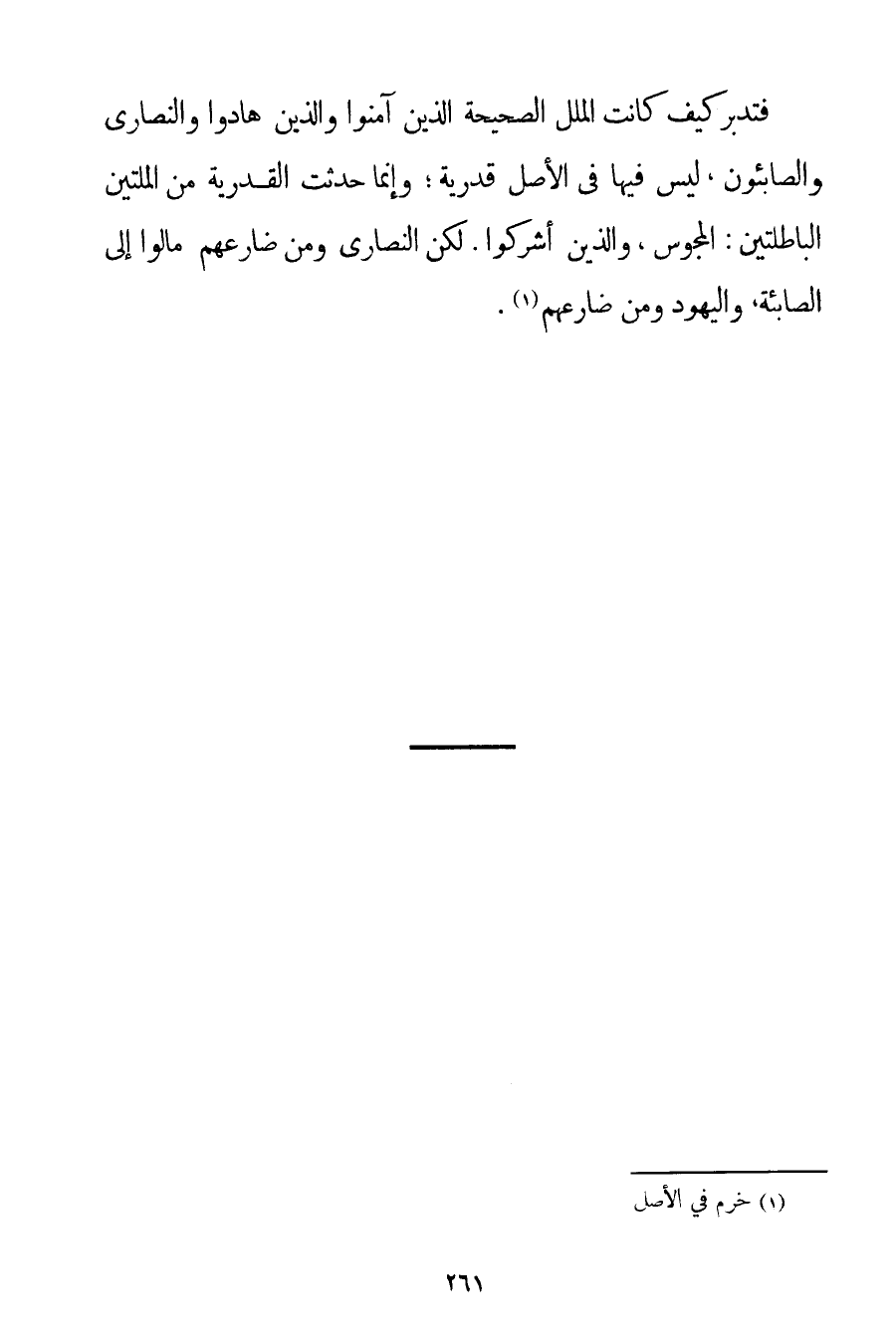 فَتَدَبَّرْ كَيْفَ كَانَتْ الْمِلَلُ الصَّحِيحَةُ الَّذِينَ آمَنُوا وَاَلَّذِينَ هَادَوْا وَالنَّصَارَى وَالصَّابِئُونَ لَيْسَ فِيهَا فِي الْأَصْلِ قَدَرِيَّةٌ؛ وَإِنَّمَا حَدَثَتْ الْقَدَرِيَّةُ مِنْ الْمِلَّتَيْنِ الْبَاطِلَتَيْنِ: الْمَجُوسُ وَاَلَّذِينَ أَشْرَكُوا. لَكِنَّ النَّصَارَى وَمَنْ ضَارَعَهُمْ مَالُوا إلَى الصَّابِئَةِ وَالْيَهُودُ وَمَنْ ضَارَعَهُمْ (1)