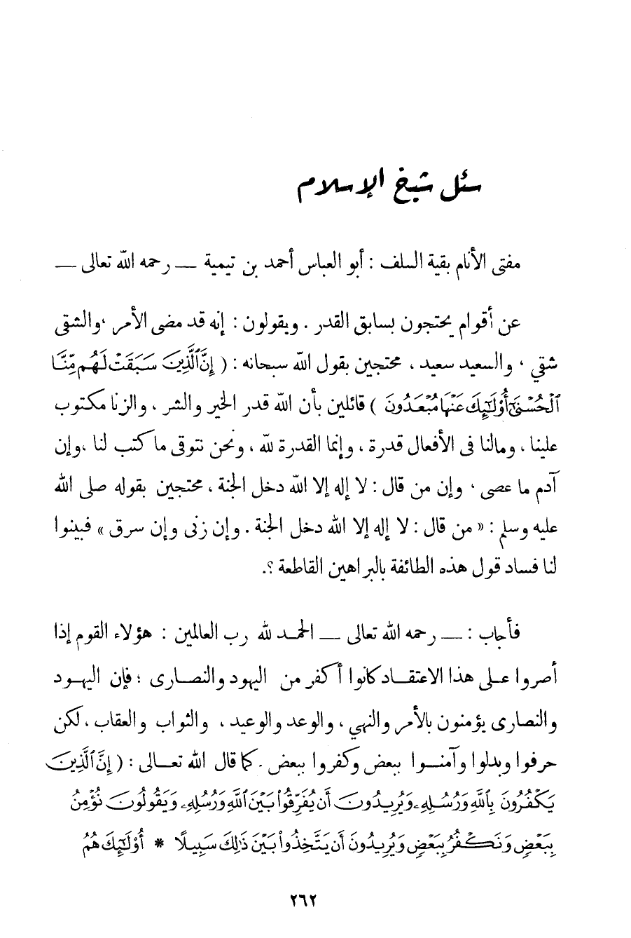 عَنْ أَقْوَامٍ يَحْتَجُّونَ بِسَابِقِ الْقَدَرِ، وَيَقُولُونَ: إنَّهُ قَدْ مَضَى الْأَمْرُ وَالشَّقِيُّ شَقِيٌّ، وَالسَّعِيدُ سَعِيدٌ مُحْتَجِّينَ بِقَوْلِ اللَّهِ سُبْحَانَهُ: {إنَّ الَّذِينَ سَبَقَتْ لَهُمْ مِنَّا الْحُسْنَى أُولَئِكَ عَنْهَا مُبْعَدُونَ} قَائِلِينَ بِأَنَّ اللَّهَ قَدَّرَ الْخَيْرَ وَالشَّرَّ وَالزِّنَا مَكْتُوبٌ عَلَيْنَا، وَمَا لَنَا فِي الْأَفْعَالِ قُدْرَةٌ وَإِنَّمَا الْقُدْرَةُ لِلَّهِ وَنَحْنُ نَتَوَقَّى مَا كُتِبَ لَنَا وَأَنَّ آدَمَ مَا عَصَى وَأَنَّ مَنْ قَالَ: لَا إلَهَ إلَّا اللَّهُ دَخَلَ الْجَنَّةَ مُحْتَجِّينَ بِقَوْلِهِ صَلَّى اللَّهُ عَلَيْهِ وَسَلَّمَ {مَنْ قَالَ: لَا إلَهَ إلَّا اللَّهُ دَخَلَ الْجَنَّةَ. وَإِنْ زَنَى وَإِنْ سَرَقَ} فَبَيِّنُوا لَنَا فَسَادَ قَوْلِ هَذِهِ الطَّائِفَةِ بِالْبَرَاهِينِ الْقَاطِعَةِ؟ .