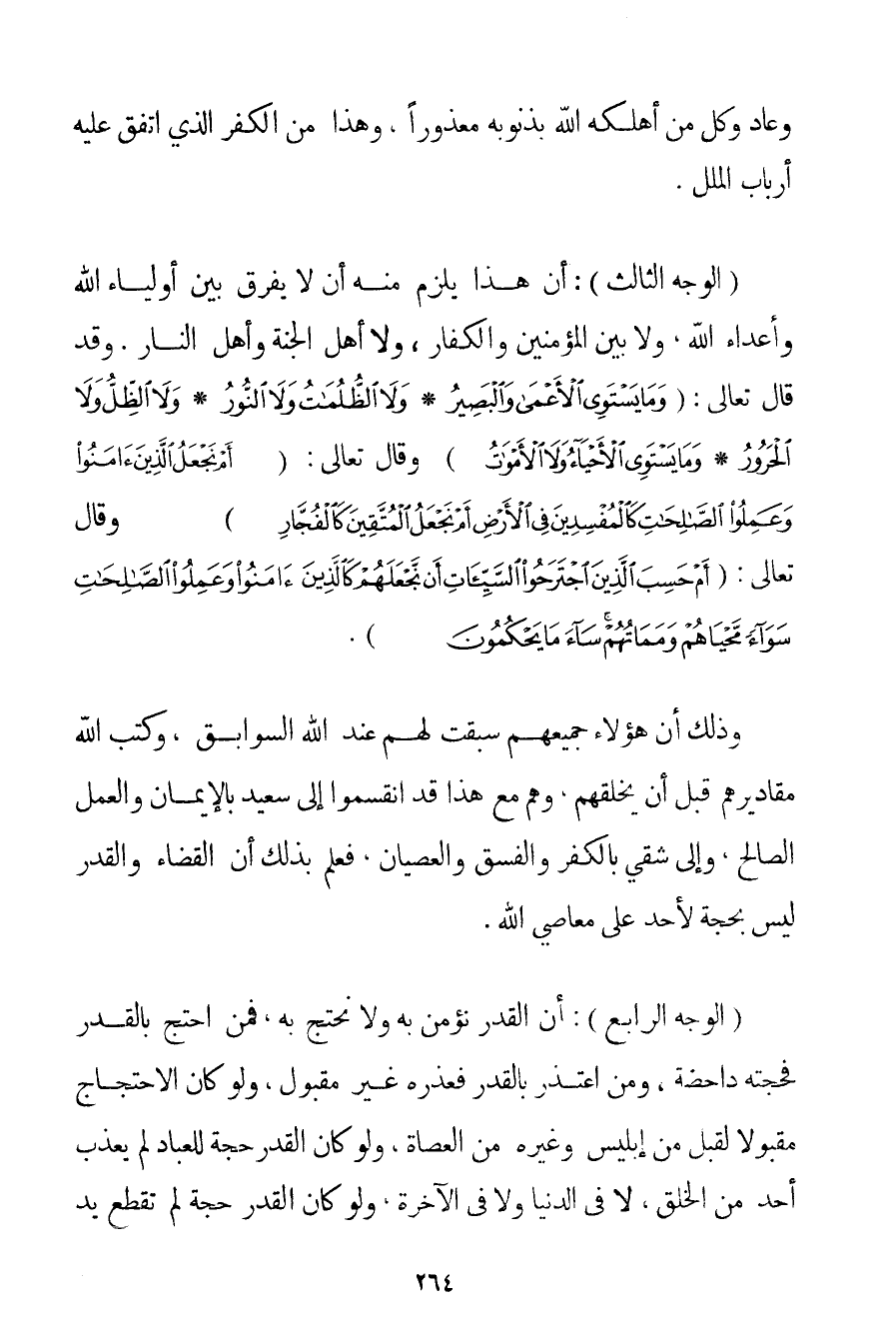 وَعَادٍ وَكُلُّ مَنْ أَهْلَكَهُ اللَّهُ بِذُنُوبِهِ مَعْذُورًا وَهَذَا مِنْ الْكُفْرِ الَّذِي اتَّفَقَ عَلَيْهِ أَرْبَابُ الْمِلَلِ. (الْوَجْهُ الثَّالِثُ) : أَنَّ هَذَا يَلْزَمُ مِنْهُ أَنْ لَا يُفَرِّقَ بَيْنَ أَوْلِيَاءِ اللَّهِ وَأَعْدَاءِ اللَّهِ وَلَا بَيْنَ الْمُؤْمِنِينَ وَالْكُفَّارِ وَلَا أَهْلِ الْجَنَّةِ وَأَهْلِ النَّارِ. وَقَدْ قَالَ تَعَالَى: {وَمَا يَسْتَوِي الْأَعْمَى وَالْبَصِيرُ} {وَلَا الظُّلُمَاتُ وَلَا النُّورُ} {وَلَا الظِّلُّ وَلَا الْحَرُورُ} {وَمَا يَسْتَوِي الْأَحْيَاءُ وَلَا الْأَمْوَاتُ} وَقَالَ تَعَالَى: {أَمْ نَجْعَلُ الَّذِينَ آمَنُوا وَعَمِلُوا الصَّالِحَاتِ كَالْمُفْسِدِينَ فِي الْأَرْضِ أَمْ نَجْعَلُ الْمُتَّقِينَ كَالْفُجَّارِ} وَقَالَ تَعَالَى: {أَمْ حَسِبَ الَّذِينَ اجْتَرَحُوا السَّيِّئَاتِ أَنْ نَجْعَلَهُمْ كَالَّذِينَ آمَنُوا وَعَمِلُوا الصَّالِحَاتِ سَوَاءً مَحْيَاهُمْ وَمَمَاتُهُمْ سَاءَ مَا يَحْكُمُونَ} . وَذَلِكَ أَنَّ هَؤُلَاءِ جَمِيعَهُمْ سَبَقَتْ لَهُمْ عِنْدَ اللَّهِ السَّوَابِقُ وَكَتَبَ اللَّهُ مَقَادِيرَهُمْ قَبْلَ أَنْ يَخْلُقَهُمْ وَهُمْ مَعَ هَذَا قَدْ انْقَسَمُوا إلَى سَعِيدٍ بِالْإِيمَانِ وَالْعَمَلِ الصَّالِحِ وَإِلَى شَقِيٍّ بِالْكُفْرِ وَالْفِسْقِ وَالْعِصْيَانِ فَعُلِمَ بِذَلِكَ أَنَّ الْقَضَاءَ وَالْقَدَرَ لَيْسَ بِحُجَّةِ لِأَحَدِ عَلَى مَعَاصِي اللَّهِ.