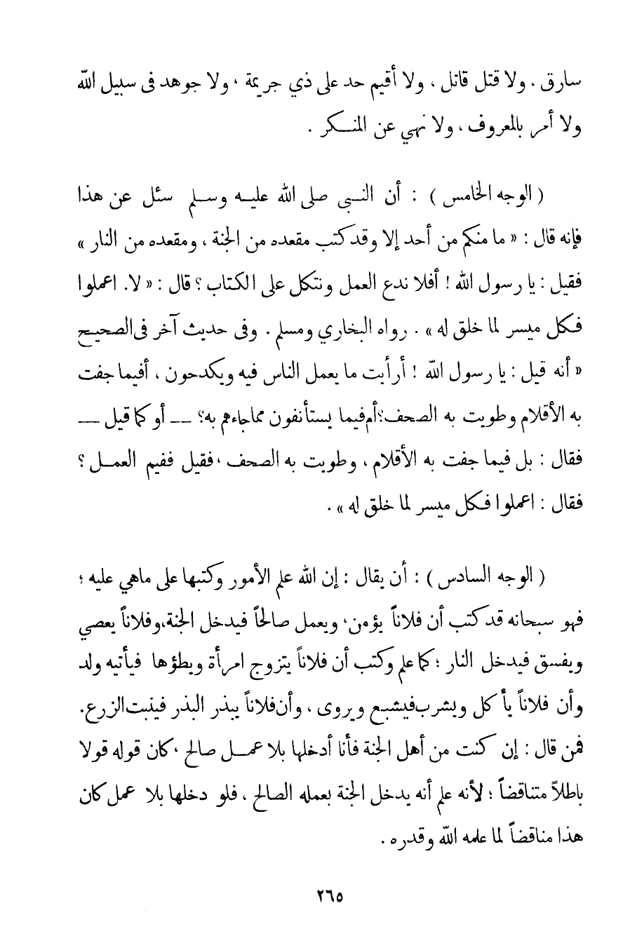 الْوَجْهُ الْخَامِسُ: أَنَّ النَّبِيَّ سُئِلَ عَنْ هَذَا فَإِنَّهُ قَالَ: {مَا مِنْكُمْ مِنْ أَحَدٍ إلَّا وَقَدْ كُتِبَ مَقْعَدُهُ مِنْ الْجَنَّةِ وَمَقْعَدُهُ مِنْ النَّارِ فَقِيلَ: يَا رَسُولَ اللَّهِ أَفَلَا نَدَعُ الْعَمَلَ، وَنَتَّكِلُ عَلَى الْكِتَابِ؟ قَالَ: لَا، اعْمَلُوا فَكُلٌّ مُيَسَّرٌ لِمَا خُلِقَ لَهُ} . رَوَاهُ الْبُخَارِيُّ وَمُسْلِمٌ. وَفِي حَدِيثٍ آخَرَ فِي الصَّحِيحِ {أَنَّهُ قِيلَ: يَا رَسُولَ اللَّهِ أَرَأَيْت مَا يَعْمَلُ النَّاسُ فِيهِ وَيَكْدَحُونَ أَفِيمَا جَفَّتْ بِهِ الْأَقْلَامُ وَطُوِيَتْ بِهِ الصُّحُفُ؟ أَمْ فِيمَا يَسْتَأْنِفُونَ مِمَّا جَاءَهُمْ بِهِ؟ - أَوْ كَمَا قِيلَ - فَقَالَ: بَلْ فِيمَا جَفَّتْ بِهِ الْأَقْلَامُ وَطُوِيَتْ بِهِ الصُّحُفُ فَقِيلَ فَفِيمَ الْعَمَلُ؟ فَقَالَ: اعْمَلُوا فَكُلٌّ مُيَسَّرٌ لِمَا خُلِقَ لَهُ} .