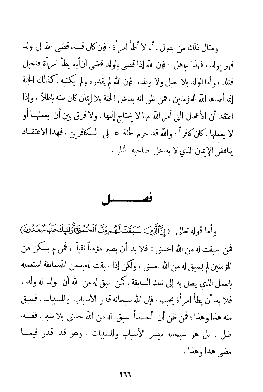 وَمِثَالُ ذَلِكَ مَنْ يَقُولُ: أَنَا لَا أَطَأُ امْرَأَةً فَإِنْ كَانَ قَدْ قَضَى اللَّهُ لِي بِوَلَدِ فَهُوَ يُولَدُ فَهَذَا جَاهِلٌ فَإِنَّ اللَّهَ إذَا قَضَى بِالْوَلَدِ قَضَى أَنَّ أَبَاهُ يَطَأُ امْرَأَةً فَتَحْبَلُ فَتَلِدُ، وَأَمَّا الْوَلَدُ بِلَا حَبَلٍ وَلَا وَطْءٍ فَإِنَّ اللَّهَ لَمْ يُقَدِّرْهُ وَلَمْ يَكْتُبْهُ كَذَلِكَ الْجَنَّةُ إنَّمَا أَعَدَّهَا اللَّهُ لِلْمُؤْمِنِينَ فَمَنْ ظَنَّ أَنَّهُ يَدْخُلُ الْجَنَّةَ بِلَا إيمَانٍ كَانَ ظَنُّهُ بَاطِلًا وَإِذَا اعْتَقَدَ أَنَّ الْأَعْمَالَ الَّتِي أَمَرَ اللَّهُ بِهَا لَا يَحْتَاجُ إلَيْهَا وَلَا فَرْقَ بَيْنَ أَنْ يَعْمَلَهَا أَوْ لَا يَعْمَلَهَا كَانَ كَافِرًا وَاَللَّهُ قَدْ حَرَّمَ الْجَنَّةَ عَلَى الْكَافِرِينَ فَهَذَا الِاعْتِقَادُ يُنَاقِضُ الْإِيمَانَ الَّذِي لَا يَدْخُلُ صَاحِبُهُ النَّارَ.