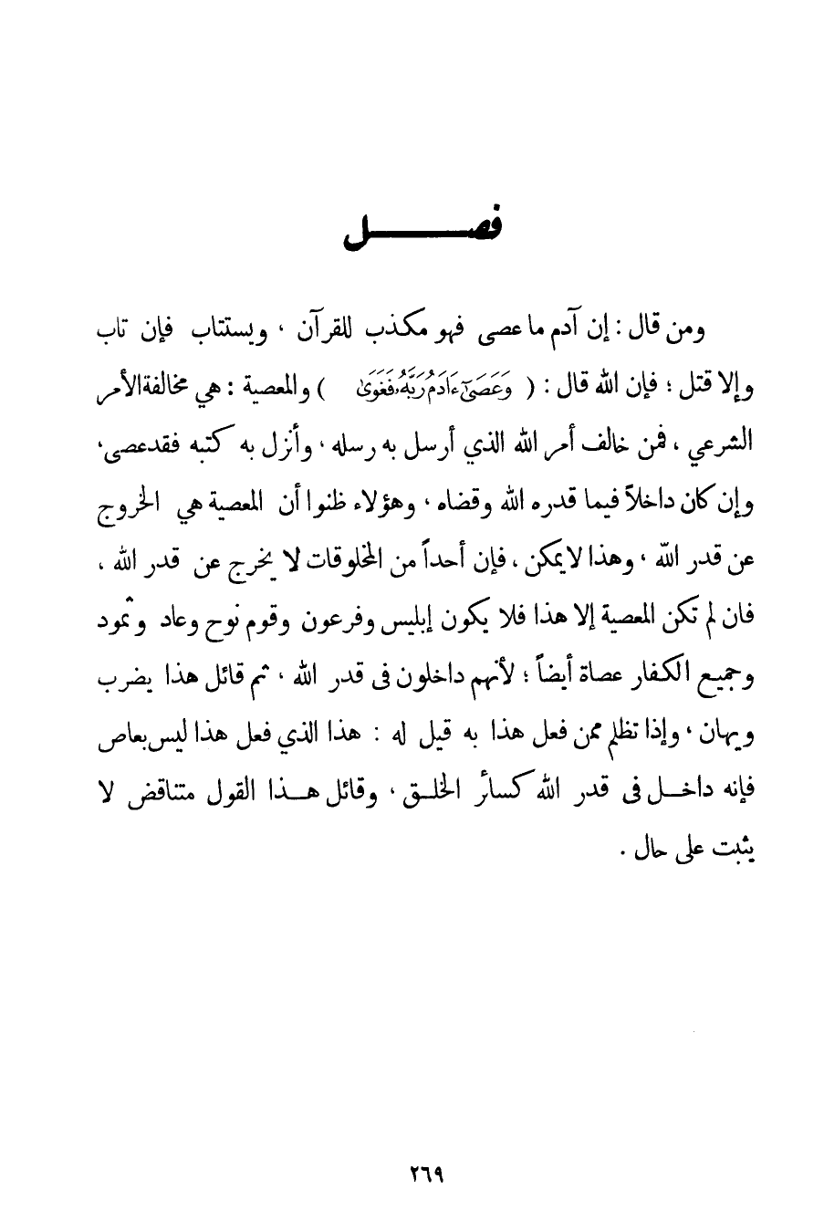وَمَنْ قَالَ: إنَّ آدَمَ مَا عَصَى فَهُوَ مُكَذِّبٌ لِلْقُرْآنِ وَيُسْتَتَابُ فَإِنْ تَابَ وَإِلَّا قُتِلَ؛ فَإِنَّ اللَّهَ قَالَ: {وَعَصَى آدَمُ رَبَّهُ فَغَوَى} وَالْمَعْصِيَةُ: هِيَ مُخَالَفَةُ الْأَمْرِ الشَّرْعِيِّ فَمَنْ خَالَفَ أَمْرَ اللَّهِ الَّذِي أَرْسَلَ بِهِ رُسُلَهُ وَأَنْزَلَ بِهِ كُتُبَهُ فَقَدْ عَصَى وَإِنْ كَانَ دَاخِلًا فِيمَا قَدَّرَهُ اللَّهُ وَقَضَاهُ وَهَؤُلَاءِ ظَنُّوا أَنَّ الْمَعْصِيَةَ هِيَ الْخُرُوجُ عَنْ قَدَرِ اللَّهِ وَهَذَا لَا يُمْكِنُ فَإِنَّ أَحَدًا مِنْ الْمَخْلُوقَاتِ لَا يَخْرُجُ عَنْ قَدَرِ اللَّهِ فَإِنْ لَمْ تَكُنْ الْمَعْصِيَةُ إلَّا هَذَا فَلَا يَكُونُ إبْلِيسُ وَفِرْعَوْنُ وَقَوْمُ نُوحٍ وَعَادٍ وَثَمُودَ وَجَمِيعُ الْكُفَّارِ عُصَاةً أَيْضًا؛ لِأَنَّهُمْ دَاخِلُونَ فِي قَدَرِ اللَّهِ ثُمَّ قَائِلُ هَذَا يُضْرَبُ وَيُهَانُ وَإِذَا تَظَلَّمَ مِمَّنْ فَعَلَ هَذَا بِهِ قِيلَ لَهُ: هَذَا الَّذِي فَعَلَ هَذَا لَيْسَ بِعَاصٍ فَإِنَّهُ دَاخِلٌ فِي قَدَرِ اللَّهِ كَسَائِرِ الْخَلْقِ وَقَائِلُ هَذَا الْقَوْلِ مُتَنَاقِضٌ لَا يَثْبُتُ عَلَى حَالٍ.