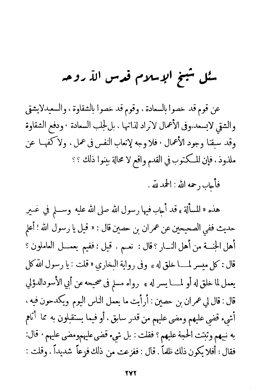 الْحَمْدُ لِلَّهِ، هَذِهِ " الْمَسْأَلَةُ " قَدْ أَجَابَ فِيهَا رَسُولُ اللَّهِ صَلَّى اللَّهُ عَلَيْهِ وَسَلَّمَ فِي غَيْرِ حَدِيثٍ فَفِي الصَّحِيحَيْنِ عَنْ عِمْرَانَ بْنِ حُصَيْن قَالَ: {قِيلَ يَا رَسُولَ اللَّهِ أَعُلِمَ أَهْلُ الْجَنَّةِ مِنْ أَهْلِ النَّارِ؟ قَالَ: نَعَمْ. قِيلَ: فَفِيمَ يَعْمَلُ الْعَامِلُونَ؟ قَالَ: كُلٌّ مُيَسَّرٌ لِمَا خُلِقَ لَهُ} وَفِي رِوَايَةِ الْبُخَارِيِّ {قُلْت: يَا رَسُولَ اللَّهِ كُلٌّ يَعْمَلُ لِمَا خُلِقَ لَهُ أَوْ لِمَا يُسِّرَ لَهُ} رَوَاهُ مُسْلِمٌ فِي صَحِيحِهِ {عَنْ أَبِي الْأَسْوَدِ الدؤلي قَالَ: قَالَ لِي عِمْرَانُ بْنُ حُصَيْن: أَرَأَيْت مَا يَعْمَلُ النَّاسُ الْيَوْمَ وَيَكْدَحُونَ فِيهِ أَشَيْءٌ قُضِيَ عَلَيْهِمْ وَمَضَى عَلَيْهِمْ مِنْ قَدَرٍ سَابِقٍ أَوْ فِيمَا يَسْتَقْبِلُونَ بِهِ مِمَّا أَتَاهُمْ بِهِ نَبِيُّهُمْ وَثَبَتَتْ الْحُجَّةُ عَلَيْهِمْ؟ فَقُلْت: بَلْ شَيْءٌ قُضِيَ عَلَيْهِمْ وَمَضَى عَلَيْهِمْ قَالَ: فَقَالَ: أَفَلَا يَكُونُ ذَلِكَ ظُلْمًا. قَالَ: فَفَزِعْت مِنْ ذَلِكَ فَزَعًا شَدِيدًا. وَقُلْت:
