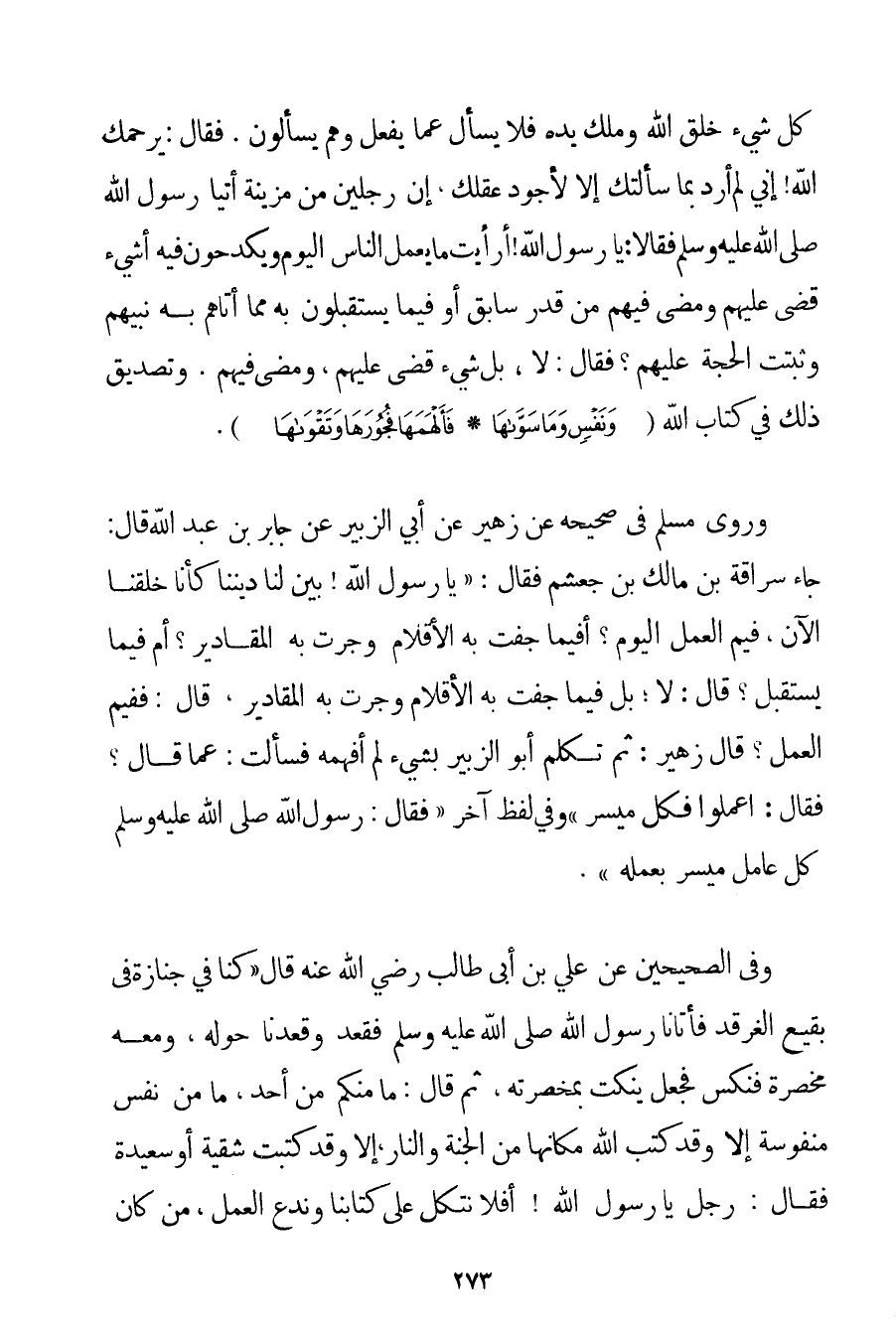 كُلُّ شَيْءٍ خَلْقُ اللَّهِ وَمِلْكُ يَدِهِ فَلَا يُسْأَلُ عَمَّا يَفْعَلُ وَهُمْ يُسْأَلُونَ. فَقَالَ: يَرْحَمُك اللَّهُ إنِّي لَمْ أُرِدْ بِمَا سَأَلْتُك إلَّا لِأُجَوِّدَ عَقْلَك إنَّ رَجُلَيْنِ مِنْ مزينة أَتَيَا رَسُولَ اللَّهِ صَلَّى اللَّهُ عَلَيْهِ وَسَلَّمَ فَقَالَا: يَا رَسُولَ اللَّهِ أَرَأَيْت مَا يَعْمَلُ النَّاسُ الْيَوْمَ وَيَكْدَحُونَ فِيهِ أَشَيْءٌ قُضِيَ عَلَيْهِمْ وَمَضَى فِيهِمْ مِنْ قَدَرٍ سَابِقٍ أَوْ فِيمَا يَسْتَقْبِلُونَ بِهِ مِمَّا أَتَاهُمْ بِهِ نَبِيُّهُمْ وَثَبَتَتْ الْحُجَّةُ عَلَيْهِمْ؟ فَقَالَ: لَا بَلْ شَيْءٌ قُضِيَ عَلَيْهِمْ وَمَضَى فِيهِمْ. وَتَصْدِيقُ ذَلِكَ فِي كِتَابِ اللَّهِ {وَنَفْسٍ وَمَا سَوَّاهَا} {فَأَلْهَمَهَا فُجُورَهَا وَتَقْوَاهَا} } . وَرَوَى مُسْلِمٌ فِي صَحِيحِهِ عَنْ زُهَيْرٍ عَنْ أَبِي الزُّبَيْرِ عَنْ جَابِرِ بْنِ عَبْدِ اللَّهِ قَالَ: {جَاءَ سُرَاقَةُ بْنُ مَالِكِ بْنِ جُعْشُمٍ فَقَالَ: يَا رَسُولَ اللَّهِ بَيِّنْ لَنَا دِينَنَا كَأَنَّا خُلِقْنَا الْآنَ فِيمَ الْعَمَلُ الْيَوْمُ؟ أَفِيمَا جَفَّتْ بِهِ الْأَقْلَامُ وَجَرَتْ بِهِ الْمَقَادِيرُ؟ أَمْ فِيمَا يُسْتَقْبَلُ؟ قَالَ: لَا؛ بَلْ فِيمَا جَفَّتْ بِهِ الْأَقْلَامُ وَجَرَتْ بِهِ الْمَقَادِيرُ قَالَ: فَفِيمَ الْعَمَلُ؟ قَالَ زُهَيْرٌ: ثُمَّ تَكَلَّمَ أَبُو الزُّبَيْرِ بِشَيْءِ لَمْ أَفْهَمْهُ فَسَأَلْت: عَمَّا قَالَ؟ فَقَالَ: اعْمَلُوا فَكُلٌّ مُيَسَّرٌ} وَفِي لَفْظٍ آخَرَ {فَقَالَ: رَسُولُ اللَّهِ صَلَّى اللَّهُ عَلَيْهِ وَسَلَّمَ كُلٌّ عَامِلٌ مُيَسَّرٌ بِعَمَلِهِ} . وَفِي الصَّحِيحَيْنِ عَنْ عَلِيِّ بْنِ أَبِي طَالِبٍ رَضِيَ اللَّهُ عَنْهُ قَالَ {كُنَّا فِي جِنَازَةٍ فِي بَقِيعِ الْغَرْقَدِ فَأَتَانَا رَسُولُ اللَّهِ صَلَّى اللَّهُ عَلَيْهِ وَسَلَّمَ فَقَعَدَ وَقَعَدْنَا حَوْلَهُ وَمَعَهُ مِخْصَرَةٌ فَنَكَّسَ فَجَعَلَ يَنْكُتُ بِمِخْصَرَتِهِ ثُمَّ قَالَ: مَا مِنْكُمْ مِنْ أَحَدٍ مَا مِنْ نَفْسٍ مَنْفُوسَةٍ إلَّا وَقَدْ كَتَبَ اللَّهُ مَكَانَهَا مِنْ الْجَنَّةِ وَالنَّارِ إلَّا وَقَدْ كُتِبَتْ شَقِيَّةً أَوْ سَعِيدَةً فَقَالَ: رَجُلٌ يَا رَسُولَ اللَّهِ أَفَلَا نَتَّكِلُ عَلَى كِتَابِنَا وَنَدَعُ الْعَمَلَ مَنْ كَانَ