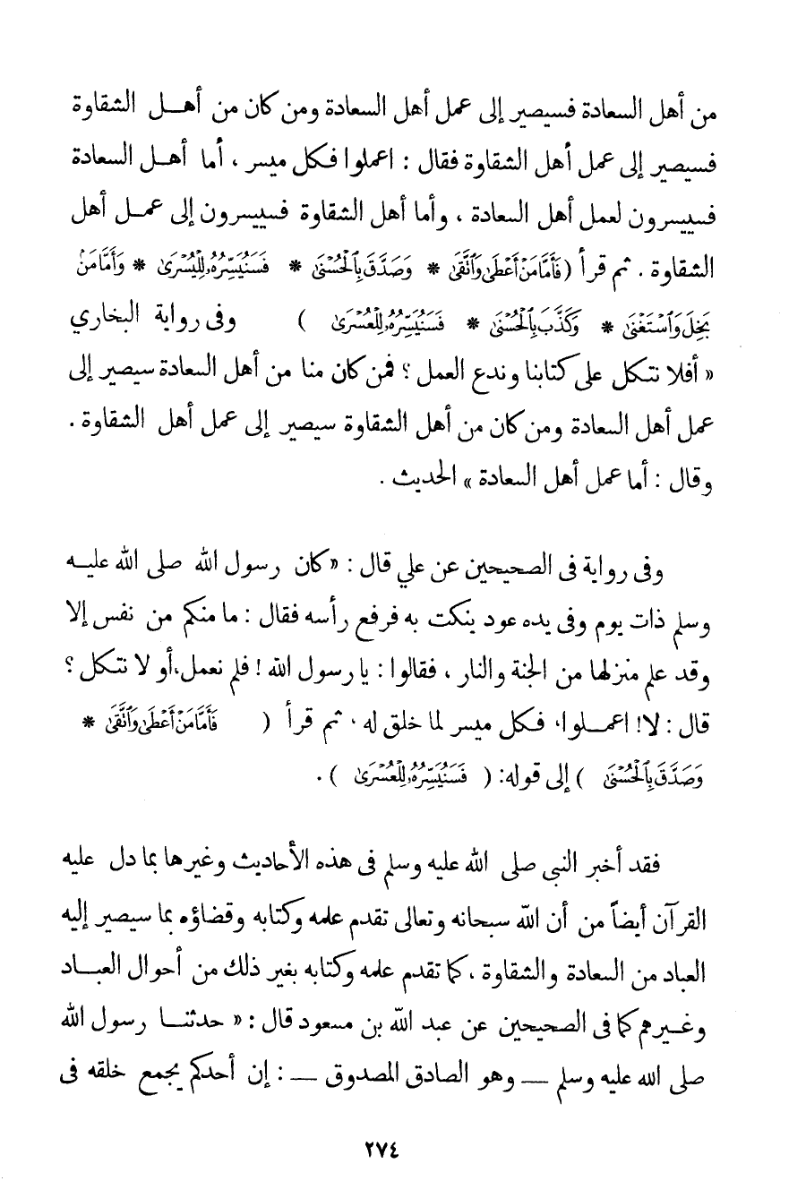مِنْ أَهْلِ السَّعَادَةِ فَسَيَصِيرُ إلَى عَمَلِ أَهْلِ السَّعَادَةِ وَمَنْ كَانَ مِنْ أَهْلِ الشَّقَاوَةِ فَسَيَصِيرُ إلَى عَمَلِ أَهْلِ الشَّقَاوَةِ فَقَالَ: اعْمَلُوا فَكُلٌّ مُيَسَّرٌ أَمَّا أَهْلُ السَّعَادَةِ فسييسرون لِعَمَلِ أَهْلِ السَّعَادَةِ وَأَمَّا أَهْلُ الشَّقَاوَةِ فسييسرون إلَى عَمَلِ أَهْلِ الشَّقَاوَةِ. ثُمَّ قَرَأَ {فَأَمَّا مَنْ أَعْطَى وَاتَّقَى} {وَصَدَّقَ بِالْحُسْنَى} {فَسَنُيَسِّرُهُ لِلْيُسْرَى} {وَأَمَّا مَنْ بَخِلَ وَاسْتَغْنَى} {وَكَذَّبَ بِالْحُسْنَى} {فَسَنُيَسِّرُهُ لِلْعُسْرَى} } وَفِي رِوَايَةِ الْبُخَارِيِّ {أَفَلَا نَتَّكِلُ عَلَى كِتَابِنَا وَنَدَعُ الْعَمَلَ؟ فَمَنْ كَانَ مِنَّا مِنْ أَهْلِ السَّعَادَةِ سَيَصِيرُ إلَى عَمَلِ أَهْلِ السَّعَادَةِ وَمَنْ كَانَ مِنْ أَهْلِ الشَّقَاوَةِ سَيَصِيرُ إلَى عَمَلِ أَهْلِ الشَّقَاوَةِ. وَقَالَ: أَمَّا عَمَلُ أَهْلِ السَّعَادَةِ} الْحَدِيثَ. وَفِي رِوَايَةٍ فِي الصَّحِيحَيْنِ عَنْ عَلِيٍّ قَالَ: {كَانَ رَسُولُ اللَّهِ صَلَّى اللَّهُ عَلَيْهِ وَسَلَّمَ ذَاتَ يَوْمٍ وَفِي يَدِهِ عُودٌ يَنْكُتُ بِهِ فَرَفَعَ رَأْسَهُ فَقَالَ: مَا مِنْكُمْ مِنْ نَفْسٍ إلَّا وَقَدْ عُلِمَ مَنْزِلُهَا مِنْ الْجَنَّةِ وَالنَّارِ فَقَالُوا: يَا رَسُولَ اللَّهِ فَلِمَ نَعْمَلُ أو لَا نَتَّكِلُ؟ قَالَ: لَا اعْمَلُوا فَكُلٌّ مُيَسَّرٌ لِمَا خُلِقَ لَهُ ثُمَّ قَرَأَ {فَأَمَّا مَنْ أَعْطَى وَاتَّقَى} {وَصَدَّقَ بِالْحُسْنَى} إلَى قَوْلِهِ: {فَسَنُيَسِّرُهُ لِلْعُسْرَى} } . فَقَدْ أَخْبَرَ النَّبِيُّ صَلَّى اللَّهُ عَلَيْهِ وَسَلَّمَ فِي هَذِهِ الْأَحَادِيثِ وَغَيْرِهَا بِمَا دَلَّ عَلَيْهِ الْقُرْآنُ أَيْضًا مِنْ أَنَّ اللَّهَ سُبْحَانَهُ وَتَعَالَى تَقَدَّمَ عِلْمُهُ وَكِتَابُهُ وَقَضَاؤُهُ بِمَا سَيَصِيرُ إلَيْهِ الْعِبَادُ مِنْ السَّعَادَةِ وَالشَّقَاوَةِ كَمَا تَقَدَّمَ عِلْمُهُ وَكِتَابُهُ بِغَيْرِ ذَلِكَ مِنْ أَحْوَالِ الْعِبَادِ وَغَيْرِهِمْ كَمَا فِي الصَّحِيحَيْنِ عَنْ عَبْدِ اللَّهِ بْنِ مَسْعُودٍ قَالَ: {حَدَّثَنَا رَسُولُ اللَّهِ صَلَّى اللَّهُ عَلَيْهِ وَسَلَّمَ - وَهُوَ الصَّادِقُ الْمَصْدُوقُ -: إنَّ أَحَدَكُمْ يُجْمَعُ خَلْقُهُ فِي