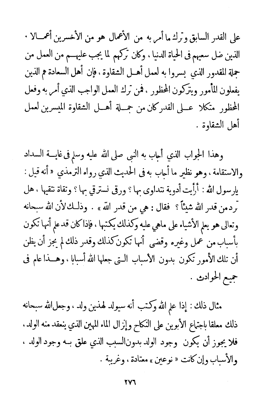 عَلَى الْقَدَرِ السَّابِقِ، وَتَرَكَ مَا أُمِرَ بِهِ مِنْ الْأَعْمَالِ هُوَ مِنْ الْأَخْسَرِينَ أَعْمَالًا الَّذِينَ ضَلَّ سَعْيُهُمْ فِي الْحَيَاةِ الدُّنْيَا وَكَانَ تَرْكُهُمْ لِمَا يَجِبُ عَلَيْهِمْ مِنْ الْعَمَلِ مِنْ جُمْلَةِ الْمَقْدُورِ الَّذِي يسروا بِهِ لِعَمَلِ أَهْلِ الشَّقَاوَةِ فَإِنَّ أَهْلَ السَّعَادَةِ هُمْ الَّذِينَ يَفْعَلُونَ الْمَأْمُورَ وَيَتْرُكُونَ الْمَحْظُورَ فَمَنْ تَرَكَ الْعَمَلَ الْوَاجِبَ الَّذِي أُمِرَ بِهِ وَفَعَلَ الْمَحْظُورَ مُتَّكِلًا عَلَى الْقَدَرِ كَانَ مِنْ جُمْلَةِ أَهْلِ الشَّقَاوَةِ الْمُيَسَّرِينَ لِعَمَلِ أَهْلِ الشَّقَاوَةِ. وَهَذَا الْجَوَابُ الَّذِي أَجَابَ بِهِ النَّبِيُّ صَلَّى اللَّهُ عَلَيْهِ وَسَلَّمَ فِي غَايَةِ السَّدَادِ وَالِاسْتِقَامَةِ وَهُوَ نَظِيرُ مَا أَجَابَ بِهِ فِي الْحَدِيثِ الَّذِي رَوَاهُ التِّرْمِذِيُّ {أَنَّهُ قِيلَ: يَا رَسُولَ اللَّهِ: أَرَأَيْت أَدْوِيَةً نَتَدَاوَى بِهَا؟ وَرُقًى نسترقي بِهَا؟ وَتُقَاةً نَتَّقِيهَا هَلْ تَرُدُّ مِنْ قَدَرِ اللَّهِ شَيْئًا؟ فَقَالَ: هِيَ مِنْ قَدَرِ اللَّهِ} . وَذَلِكَ لِأَنَّ اللَّهَ - سُبْحَانَهُ وَتَعَالَى - هُوَ يَعْلَمُ الْأَشْيَاءَ عَلَى مَا هِيَ عَلَيْهِ وَكَذَلِكَ يَكْتُبُهَا فَإِذَا كَانَ قَدْ عَلِمَ أَنَّهَا تَكُونُ بِأَسْبَابِ مِنْ عَمَلٍ وَغَيْرِهِ وَقَضَى أَنَّهَا تَكُونُ كَذَلِكَ وَقَدَّرَ ذَلِكَ لَمْ يَجُزْ أَنْ يُظَنَّ أَنَّ تِلْكَ الْأُمُورَ تَكُونُ بِدُونِ الْأَسْبَابِ الَّتِي جَعَلَهَا اللَّهُ أَسْبَابًا وَهَذَا عَامٌّ فِي جَمِيعِ الْحَوَادِثِ. مِثَالُ ذَلِكَ: إذَا عَلِمَ اللَّهُ وَكَتَبَ أَنَّهُ سَيُولَدُ لِهَذَيْنِ وَلَدٌ وَجَعَلَ اللَّهُ سُبْحَانَهُ ذَلِكَ مُعَلَّقًا بِاجْتِمَاعِ الْأَبَوَيْنِ عَلَى النِّكَاحِ وَإِنْزَالِ الْمَاءِ الْمَهِينِ الَّذِي يَنْعَقِدُ مِنْهُ الْوَلَدُ فَلَا يَجُوزُ أَنْ يَكُونَ وُجُودُ الْوَلَدِ بِدُونِ السَّبَبِ الَّذِي عُلِّقَ بِهِ وُجُودُ الْوَلَدِ وَالْأَسْبَابُ وَإِنْ كَانَتْ " نَوْعَيْنِ " مُعْتَادَةٌ وَغَرِيبَةٌ.
