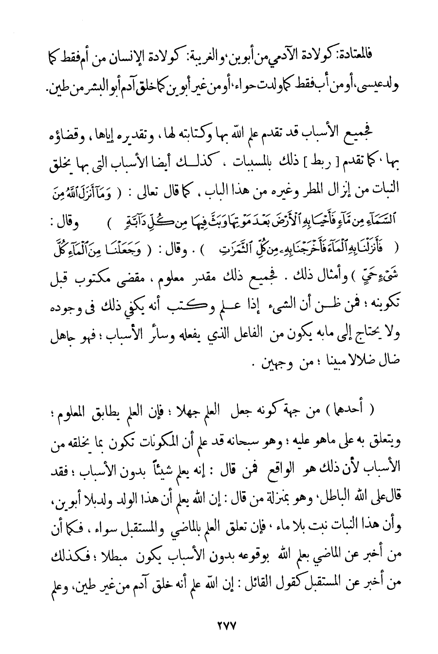 فَالْمُعْتَادَةُ: كَوِلَادَةِ الْآدَمِيِّ مِنْ أَبَوَيْنِ وَالْغَرِيبَةُ: كَوِلَادَةِ الْإِنْسَانِ مِنْ أُمٍّ فَقَطْ كَمَا وُلِدَ عِيسَى أَوْ مِنْ أَبٍ فَقَطْ كَمَا وُلِدَتْ حَوَّاءُ أَوْ مِنْ غَيْرِ أَبَوَيْنِ كَمَا خُلِقَ آدَمَ أَبُو الْبَشَرِ مِنْ طِينٍ. فَجَمِيعُ الْأَسْبَابِ قَدْ تَقَدَّمَ عِلْمُ اللَّهِ بِهَا وَكِتَابَتُهُ لَهَا وَتَقْدِيرُهُ إيَّاهَا وَقَضَاؤُهُ بِهَا كَمَا تَقَدَّمَ رَبْطُ ذَلِكَ بِالْمُسَبَّبَاتِ كَذَلِكَ أَيْضًا الْأَسْبَابُ الَّتِي بِهَا يُخْلَقُ النَّبَاتُ مِنْ إنْزَالِ الْمَطَرِ وَغَيْرِهِ مِنْ هَذَا الْبَابِ كَمَا قَالَ تَعَالَى: {وَمَا أَنْزَلَ اللَّهُ مِنَ السَّمَاءِ مِنْ مَاءٍ فَأَحْيَا بِهِ الْأَرْضَ بَعْدَ مَوْتِهَا وَبَثَّ فِيهَا مِنْ كُلِّ دَابَّةٍ} وَقَالَ: {فَأَنْزَلْنَا بِهِ الْمَاءَ فَأَخْرَجْنَا بِهِ مِنْ كُلِّ الثَّمَرَاتِ} . وَقَالَ: {وَجَعَلْنَا مِنَ الْمَاءِ كُلَّ شَيْءٍ حَيٍّ} وَأَمْثَالُ ذَلِكَ. فَجَمِيعُ ذَلِكَ مُقَدَّرٌ مَعْلُومٌ مَقْضِيٌّ مَكْتُوبٌ قَبْلَ تَكْوِينِهِ؛ فَمَنْ ظَنَّ أَنَّ الشَّيْءَ إذَا عُلِمَ وَكُتِبَ أَنَّهُ يَكْفِي ذَلِكَ فِي وُجُودِهِ وَلَا يَحْتَاجُ إلَى مَا بِهِ يَكُونُ مِنْ الْفَاعِلِ الَّذِي يَفْعَلُهُ، وَسَائِرِ الْأَسْبَابِ؛ فَهُوَ جَاهِلٌ ضَالٌّ ضَلَالًا مُبِينًا؛ مِنْ وَجْهَيْنِ. (أَحَدُهُمَا مِنْ جِهَةِ كَوْنِهِ جَعَلَ الْعِلْمَ جَهْلًا؛ فَإِنَّ الْعِلْمَ يُطَابِقُ الْمَعْلُومَ؛ وَيَتَعَلَّقُ بِهِ عَلَى مَا هُوَ عَلَيْهِ؛ وَهُوَ سُبْحَانَهُ قَدْ عَلِمَ أَنَّ الْمُكَوِّنَاتِ تَكُونُ بِمَا يَخْلُقُهُ مِنْ الْأَسْبَابِ لِأَنَّ ذَلِكَ هُوَ الْوَاقِعُ فَمَنْ قَالَ: إنَّهُ يَعْلَمُ شَيْئًا بِدُونِ الْأَسْبَابِ؛ فَقَدْ قَالَ عَلَى اللَّهِ الْبَاطِلَ وَهُوَ بِمَنْزِلَةِ مَنْ قَالَ: إنَّ اللَّهَ يَعْلَمُ أَنَّ هَذَا الْوَلَدَ وُلِدَ بِلَا أَبَوَيْنِ وَأَنَّ هَذَا النَّبَاتَ نَبَتَ بِلَا مَاءٍ فَإِنَّ تَعَلُّقَ الْعِلْمِ بِالْمَاضِي وَالْمُسْتَقْبَلِ سَوَاءٌ فَكَمَا أَنَّ مَنْ أَخْبَرَ عَنْ الْمَاضِي بِعِلْمِ اللَّهِ بِوُقُوعِهِ بِدُونِ الْأَسْبَابِ يَكُونُ مُبْطِلًا؛ فَكَذَلِكَ مَنْ أَخْبَرَ عَنْ الْمُسْتَقْبَلِ كَقَوْلِ الْقَائِلِ: إنَّ اللَّهَ عَلِمَ أَنَّهُ خَلَقَ آدَمَ مِنْ غَيْرِ طِينٍ وَعَلِمَ