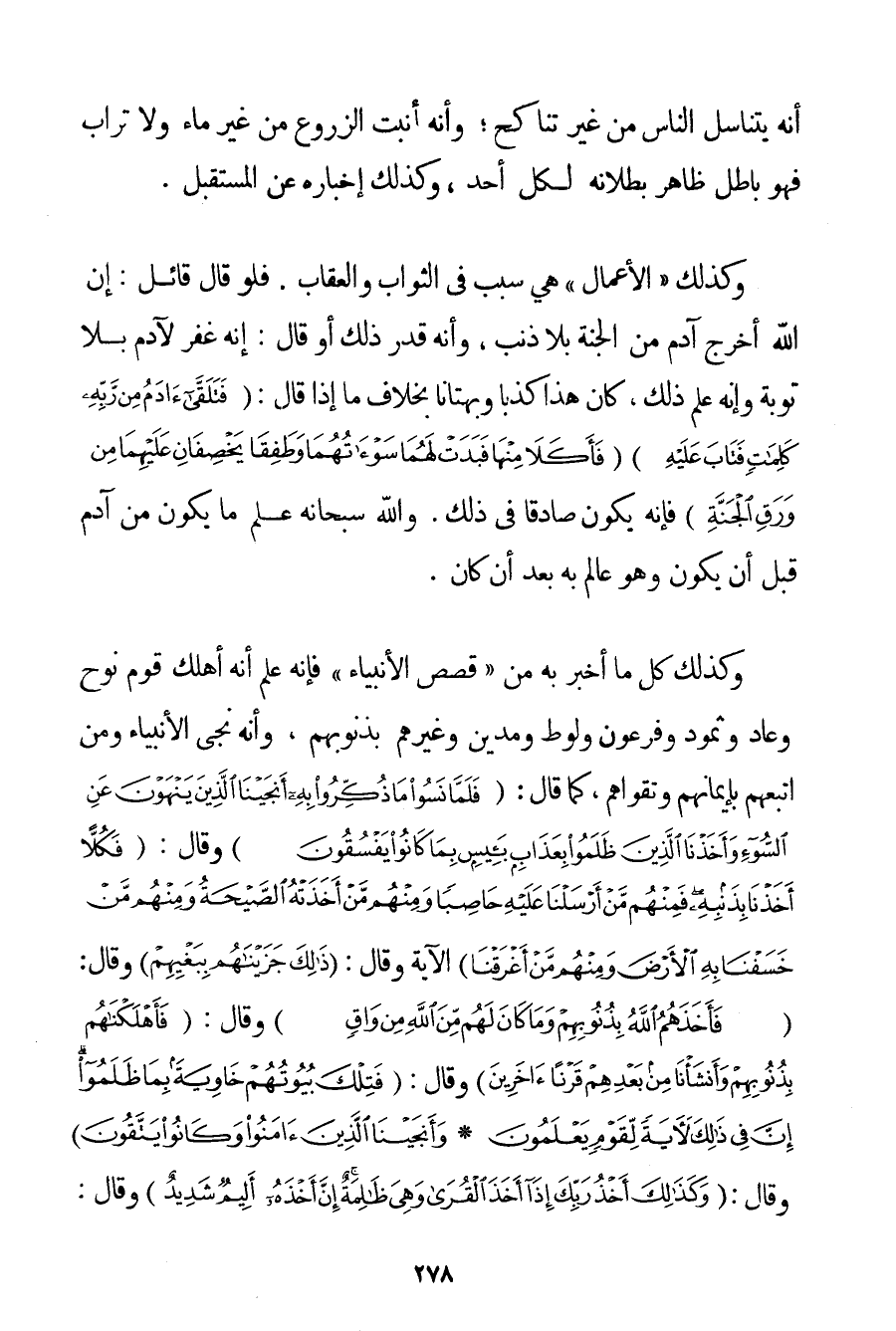 أَنَّهُ يَتَنَاسَلُ النَّاسُ مِنْ غَيْرِ تَنَاكُحٍ؛ وَأَنَّهُ أَنْبَتَ الزُّرُوعَ مِنْ غَيْرِ مَاءٍ وَلَا تُرَابٍ فَهُوَ بَاطِلٌ ظَاهِرٌ بُطْلَانُهُ لِكُلِّ أَحَدٍ وَكَذَلِكَ إخْبَارُهُ عَنْ الْمُسْتَقْبَلِ. وَكَذَلِكَ " الْأَعْمَالُ " هِيَ سَبَبٌ فِي الثَّوَابِ وَالْعِقَابِ. فَلَوْ قَالَ قَائِلٌ: إنَّ اللَّهَ أَخْرَجَ آدَمَ مِنْ الْجَنَّةِ بِلَا ذَنْبٍ وَأَنَّهُ قَدَّرَ ذَلِكَ أَوْ قَالَ: إنَّهُ غَفَرَ لِآدَمَ بِلَا تَوْبَةٍ وَإِنَّهُ عَلِمَ ذَلِكَ كَانَ هَذَا كَذِبًا وَبُهْتَانًا بِخِلَافِ مَا إذَا قَالَ: {فَتَلَقَّى آدَمُ مِنْ رَبِّهِ كَلِمَاتٍ فَتَابَ عَلَيْهِ} {فَأَكَلَا مِنْهَا فَبَدَتْ لَهُمَا سَوْآتُهُمَا وَطَفِقَا يَخْصِفَانِ عَلَيْهِمَا مِنْ وَرَقِ الْجَنَّةِ} فَإِنَّهُ يَكُونُ صَادِقًا فِي ذَلِكَ. وَاَللَّهُ سُبْحَانَهُ عَلِمَ مَا يَكُونُ مِنْ آدَمَ قَبْلَ أَنْ يَكُونَ وَهُوَ عَالِمٌ بِهِ بَعْدَ أَنْ كَانَ. وَكَذَلِكَ كُلُّ مَا أَخْبَرَ بِهِ مِنْ " قَصَصِ الْأَنْبِيَاءِ " فَإِنَّهُ عَلِمَ أَنَّهُ أَهْلَكَ قَوْمَ نُوحٍ وَعَادٍ وَثَمُودَ وَفِرْعَوْنَ وَلُوطٍ وَمَدْيَنَ وَغَيْرِهِمْ بِذُنُوبِهِمْ وَأَنَّهُ نَجَّى الْأَنْبِيَاءَ وَمَنْ اتَّبَعَهُمْ بِإِيمَانِهِمْ وَتَقْوَاهُمْ كَمَا قَالَ: {فَلَمَّا نَسُوا مَا ذُكِّرُوا بِهِ أَنْجَيْنَا الَّذِينَ يَنْهَوْنَ عَنِ السُّوءِ وَأَخَذْنَا الَّذِينَ ظَلَمُوا بِعَذَابٍ بَئِيسٍ بِمَا كَانُوا يَفْسُقُونَ} وَقَالَ: {فَكُلًّا أَخَذْنَا بِذَنْبِهِ فَمِنْهُمْ مَنْ أَرْسَلْنَا عَلَيْهِ حَاصِبًا وَمِنْهُمْ مَنْ أَخَذَتْهُ الصَّيْحَةُ وَمِنْهُمْ مَنْ خَسَفْنَا بِهِ الْأَرْضَ وَمِنْهُمْ مَنْ أَغْرَقْنَا} الْآيَةَ وَقَالَ: {ذَلِكَ جَزَيْنَاهُمْ بِبَغْيِهِمْ} وَقَالَ: {فَأَخَذَهُمُ اللَّهُ بِذُنُوبِهِمْ وَمَا كَانَ لَهُمْ مِنَ اللَّهِ مِنْ وَاقٍ} وَقَالَ: {فَأَهْلَكْنَاهُمْ بِذُنُوبِهِمْ وَأَنْشَأْنَا مِنْ بَعْدِهِمْ قَرْنًا آخَرِينَ} وَقَالَ: {فَتِلْكَ بُيُوتُهُمْ خَاوِيَةً بِمَا ظَلَمُوا إنَّ فِي ذَلِكَ لَآيَةً لِقَوْمٍ يَعْلَمُونَ} {وَأَنْجَيْنَا الَّذِينَ آمَنُوا وَكَانُوا يَتَّقُونَ} وَقَالَ: {وَكَذَلِكَ أَخْذُ رَبِّكَ إذَا أَخَذَ الْقُرَى وَهِيَ ظَالِمَةٌ إنَّ أَخْذَهُ أَلِيمٌ شَدِيدٌ} وَقَالَ: