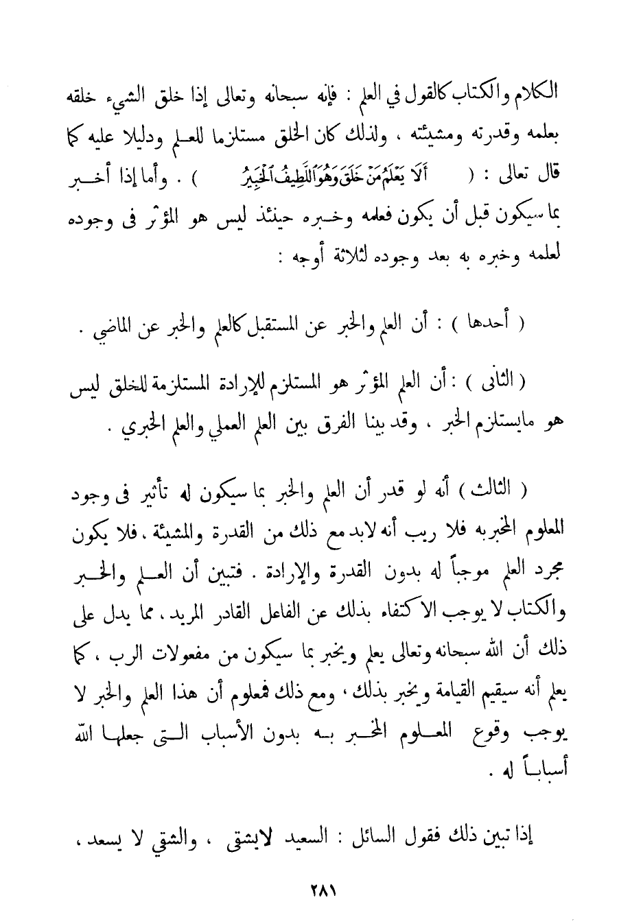 الْكَلَامِ وَالْكِتَابِ كَالْقَوْلِ فِي الْعِلْمِ: فَإِنَّهُ - سُبْحَانَهُ وَتَعَالَى - إذَا خَلَقَ الشَّيْءَ خَلَقَهُ بِعِلْمِهِ وَقُدْرَتِهِ وَمَشِيئَتِهِ وَلِذَلِكَ كَانَ الْخَلْقُ مُسْتَلْزِمًا لِلْعِلْمِ وَدَلِيلًا عَلَيْهِ كَمَا قَالَ تَعَالَى: {أَلَا يَعْلَمُ مَنْ خَلَقَ وَهُوَ اللَّطِيفُ الْخَبِيرُ} . وَأَمَّا إذَا أَخْبَرَ بِمَا سَيَكُونُ قَبْلَ أَنْ يَكُونَ فَعِلْمُهُ وَخَبَرُهُ حِينَئِذٍ لَيْسَ هُوَ الْمُؤَثِّرَ فِي وُجُودِهِ لِعِلْمِهِ وَخَبَرِهِ بِهِ بَعْدَ وُجُودِهِ لِثَلَاثَةِ أَوْجُهٍ: (أَحَدُهَا) : أَنَّ الْعِلْمَ وَالْخَبَرَ عَنْ الْمُسْتَقْبَلِ كَالْعِلْمِ وَالْخَبَرِ عَنْ الْمَاضِي. (الثَّانِي) : أَنَّ الْعِلْمَ الْمُؤَثِّرَ هُوَ الْمُسْتَلْزِمُ لِلْإِرَادَةِ الْمُسْتَلْزَمَةِ لِلْخَلْقِ لَيْسَ هُوَ مَا يَسْتَلْزِمُ الْخَبَرَ وَقَدْ بَيَّنَّا الْفَرْقَ بَيْنَ الْعِلْمِ الْعَمَلِيِّ وَالْعِلْمِ الْخَبَرِيِّ. (الثَّالِثُ) أَنَّهُ لَوْ قُدِّرَ أَنَّ الْعِلْمَ وَالْخَبَرَ بِمَا سَيَكُونُ لَهُ تَأْثِيرٌ فِي وُجُودِ الْمَعْلُومِ الْمُخْبَرِ بِهِ فَلَا رَيْبَ أَنَّهُ لَا بُدَّ مَعَ ذَلِكَ مِنْ الْقُدْرَةِ وَالْمَشِيئَةِ فَلَا يَكُونُ مُجَرَّدُ الْعِلْمِ مُوجِبًا لَهُ بِدُونِ الْقُدْرَةِ وَالْإِرَادَةِ. فَتَبَيَّنَ أَنَّ الْعِلْمَ وَالْخَبَرَ وَالْكِتَابَ لَا يُوجِبُ الِاكْتِفَاءَ بِذَلِكَ عَنْ الْفَاعِلِ الْقَادِرِ الْمُرِيدِ مِمَّا يَدُلُّ عَلَى ذَلِكَ أَنَّ اللَّهَ - سُبْحَانَهُ وَتَعَالَى - يَعْلَمُ وَيُخْبِرُ بِمَا سَيَكُونُ مِنْ مَفْعُولَاتِ الرَّبِّ كَمَا يَعْلَمُ أَنَّهُ سَيُقِيمُ الْقِيَامَةَ وَيُخْبِرُ بِذَلِكَ وَمَعَ ذَلِكَ فَمَعْلُومٌ أَنَّ هَذَا الْعِلْمَ وَالْخَبَرَ لَا يُوجِبُ وُقُوعَ الْمَعْلُومِ الْمُخْبَرِ بِهِ بِدُونِ الْأَسْبَابِ الَّتِي جَعَلَهَا اللَّهُ أَسْبَابًا لَهُ. إذَا تَبَيَّنَ ذَلِكَ فَقَوْلُ السَّائِلِ: السَّعِيدُ لَا يَشْقَى، وَالشَّقِيُّ لَا يَسْعَدُ