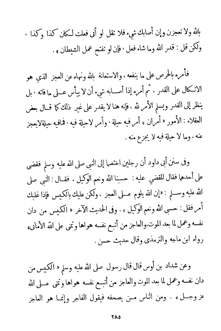 بِاَللَّهِ وَلَا تَعْجَزَنَّ، وَإِنْ أَصَابَك شَيْءٌ فَلَا تَقُلْ لَوْ أَنِّي فَعَلْت لَكَانَ كَذَا وَكَذَا وَلَكِنْ قُلْ: قَدَّرَ اللَّهُ وَمَا شَاءَ فَعَلَ فَإِنَّ لَوْ تَفْتَحُ عَمَلَ الشَّيْطَانِ} . فَأَمَرَهُ بِالْحِرْصِ عَلَى مَا يَنْفَعُهُ وَالِاسْتِعَانَةِ بِاَللَّهِ وَنَهَاهُ عَنْ الْعَجْزِ الَّذِي هُوَ الِاتِّكَالُ عَلَى الْقَدَرِ ثُمَّ أَمَرَهُ إذَا أَصَابَهُ شَيْءٌ أَنْ لَا يَيْأَسَ عَلَى مَا فَاتَهُ بَلْ يَنْظُرَ إلَى الْقَدَرِ وَيُسَلِّمَ الْأَمْرَ لِلَّهِ فَإِنَّهُ هُنَا لَا يَقْدِرُ عَلَى غَيْرِ ذَلِكَ كَمَا قَالَ بَعْضُ الْعُقَلَاءِ: الْأُمُورُ " أَمْرَانِ " أَمْرٌ فِيهِ حِيلَةٌ وَأَمْرٌ لَا حِيلَةَ فِيهِ فَمَا فِيهِ حِيلَةٌ لَا يَعْجِزُ عَنْهُ وَمَا لَا حِيلَةَ فِيهِ لَا يَجْزَعُ مِنْهُ. وَفِي سُنَنِ أَبِي دَاوُد {أَنَّ رَجُلَيْنِ اخْتَصَمَا إلَى النَّبِيِّ صَلَّى اللَّهُ عَلَيْهِ وَسَلَّمَ فَقَضَى عَلَى أَحَدِهِمَا فَقَالَ الْمَقْضِيُّ عَلَيْهِ: حَسْبُنَا اللَّهُ وَنِعْمَ الْوَكِيلُ فَقَالَ: النَّبِيُّ صَلَّى اللَّهُ عَلَيْهِ وَسَلَّمَ إنَّ اللَّهَ يَلُومُ عَلَى الْعَجْزِ وَلَكِنْ عَلَيْك بِالْكَيْسِ فَإِذَا غَلَبَك أَمْرٌ فَقُلْ: حَسْبِي اللَّهُ وَنِعْمَ الْوَكِيلُ} . وَفِي الْحَدِيثِ الْآخَرِ {الْكَيِّسُ مَنْ دَانَ نَفْسَهُ وَعَمِلَ لِمَا بَعْدَ الْمَوْتِ وَالْعَاجِزُ مَنْ أَتْبَعَ نَفْسَهُ هَوَاهَا وَتَمَنَّى عَلَى اللَّهِ الْأَمَانِيَّ} رَوَاهُ ابْنُ مَاجَه وَالتِّرْمِذِي، وَقَالَ حَدِيثٌ حَسَنٌ. وَعَنْ شَدَّادِ بْنِ أَوْسٍ قَالَ: قَالَ رَسُولُ اللَّهِ صَلَّى اللَّهُ عَلَيْهِ وَسَلَّمَ {الْكَيِّسُ مَنْ دَانَ نَفْسَهُ وَعَمِلَ لِمَا بَعْدَ الْمَوْتِ وَالْعَاجِزُ مَنْ أَتْبَعَ نَفْسَهُ هَوَاهَا وَتَمَنَّى عَلَى اللَّهِ عَزَّ وَجَلَّ} . وَمِنْ النَّاسِ مَنْ يُصَحِّفُهُ فَيَقُولُ الْفَاجِرُ وَإِنَّمَا هُوَ الْعَاجِزُ