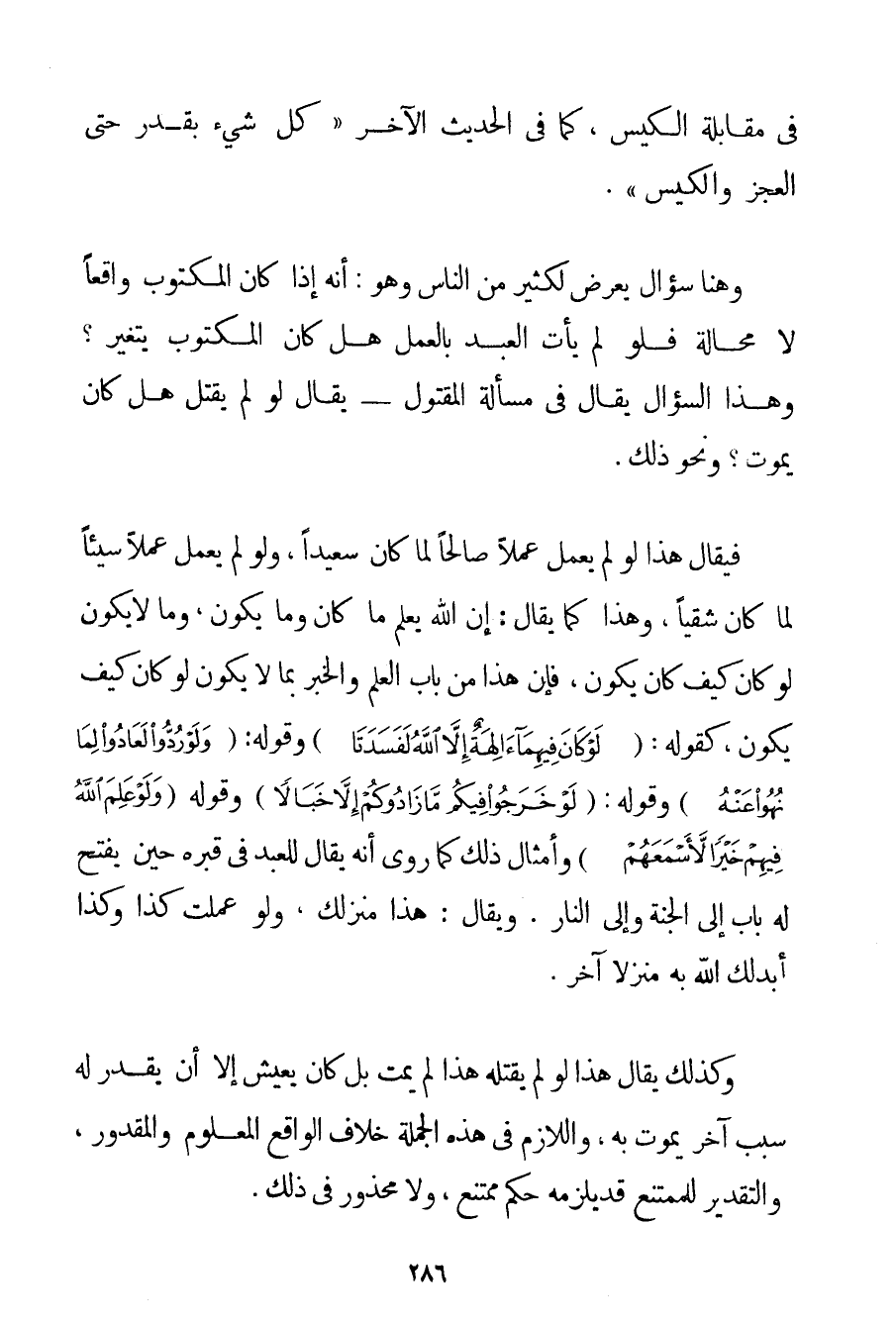 وَهُنَا سُؤَالٌ يَعْرِضُ لِكَثِيرِ مِنْ النَّاسِ وَهُوَ: أَنَّهُ إذَا كَانَ الْمَكْتُوبُ وَاقِعًا لَا مَحَالَةَ فَلَوْ لَمْ يَأْتِ الْعَبْدُ بِالْعَمَلِ هَلْ كَانَ الْمَكْتُوبُ يَتَغَيَّرُ؟ وَهَذَا السُّؤَالُ يُقَالُ فِي مَسْأَلَةِ الْمَقْتُولِ - يُقَالُ لَوْ لَمْ يُقْتَلْ هَلْ كَانَ يَمُوتُ؟ وَنَحْوُ ذَلِكَ. فَيُقَالُ هَذَا لَوْ لَمْ يَعْمَلْ عَمَلًا صَالِحًا لَمَا كَانَ سَعِيدًا وَلَوْ لَمْ يَعْمَلْ عَمَلًا سَيِّئًا لَمَا كَانَ شَقِيًّا وَهَذَا كَمَا يُقَالُ: إنَّ اللَّهَ يَعْلَمُ مَا كَانَ وَمَا يَكُونُ وَمَا لَا يَكُونُ لَوْ كَانَ كَيْفَ كَانَ يَكُونُ فَإِنَّ هَذَا مِنْ بَابِ الْعِلْمِ وَالْخَبَرِ بِمَا لَا يَكُونُ لَوْ كَانَ كَيْفَ يَكُونُ كَقَوْلِهِ: {لَوْ كَانَ فِيهِمَا آلِهَةٌ إلَّا اللَّهُ لَفَسَدَتَا} وَقَوْلِهِ: {وَلَوْ رُدُّوا لَعَادُوا لِمَا نُهُوا عَنْهُ} وَقَوْلِهِ: {لَوْ خَرَجُوا فِيكُمْ مَا زَادُوكُمْ إلَّا خَبَالًا} وَقَوْلِهِ {وَلَوْ عَلِمَ اللَّهُ فِيهِمْ خَيْرًا لَأَسْمَعَهُمْ} وَأَمْثَالِ ذَلِكَ كَمَا رُوِيَ أَنَّهُ يُقَالُ لِلْعَبْدِ فِي قَبْرِهِ حِينَ يُفْتَحُ لَهُ بَابٌ إلَى الْجَنَّةِ وَإِلَى النَّارِ. وَيُقَالُ: هَذَا مَنْزِلُك وَلَوْ عَمِلْت كَذَا وَكَذَا أَبْدَلَك اللَّهُ بِهِ مَنْزِلًا آخَرَ. وَكَذَلِكَ يُقَالُ هَذَا لَوْ لَمْ يَقْتُلْهُ هَذَا لَمْ يَمُتْ بَلْ كَانَ يَعِيشُ إلَّا أَنْ يُقَدَّرَ لَهُ سَبَبٌ آخَرُ يَمُوتُ بِهِ وَاللَّازِمُ فِي هَذِهِ الْجُمْلَةِ خِلَافُ الْوَاقِعِ الْمَعْلُومِ وَالْمَقْدُورِ وَالتَّقْدِيرُ لِلْمُمْتَنِعِ قَدْ يَلْزَمُهُ حُكْمٌ مُمْتَنِعٌ وَلَا مَحْذُورَ فِي ذَلِكَ.