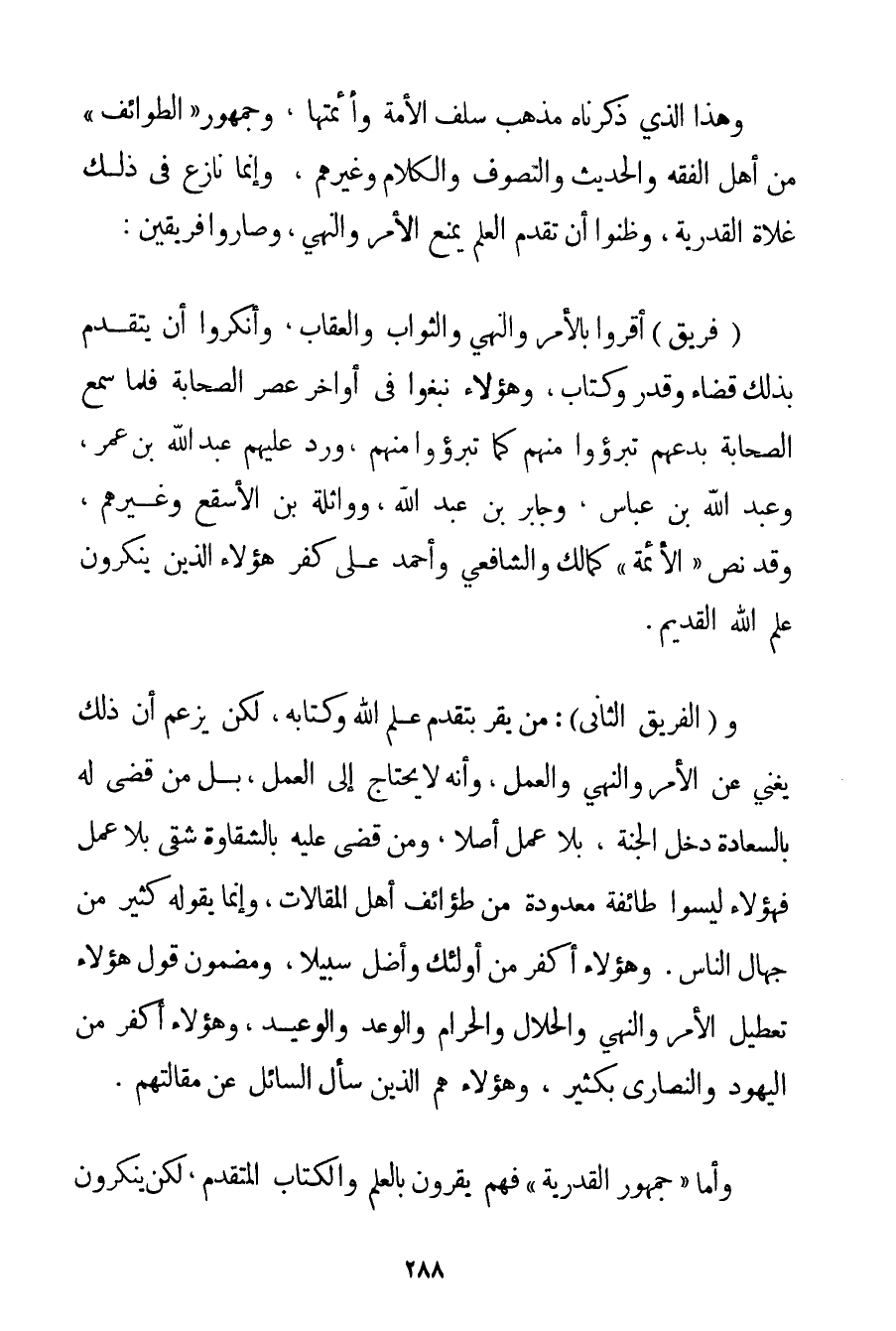 وَهَذَا الَّذِي ذَكَرْنَاهُ مَذْهَبُ سَلَفِ الْأُمَّةِ وَأَئِمَّتِهَا وَجُمْهُورِ " الطَّوَائِفِ " مِنْ أَهْلِ الْفِقْهِ وَالْحَدِيثِ وَالتَّصَوُّفِ وَالْكَلَامِ وَغَيْرِهِمْ وَإِنَّمَا نَازَعَ فِي ذَلِكَ غُلَاةُ الْقَدَرِيَّةِ وَظَنُّوا أَنَّ تَقَدُّمَ الْعِلْمِ يَمْنَعُ الْأَمْرَ وَالنَّهْيَ وَصَارُوا فَرِيقَيْنِ: (فَرِيقٌ أَقَرُّوا بِالْأَمْرِ وَالنَّهْيِ وَالثَّوَابِ وَالْعِقَابِ وَأَنْكَرُوا أَنْ يَتَقَدَّمَ بِذَلِكَ قَضَاءٌ وَقَدَرٌ وَكِتَابٌ وَهَؤُلَاءِ نَبَغُوا فِي أَوَاخِرِ عَصْرِ الصَّحَابَةِ فَلَمَّا سَمِعَ الصَّحَابَةُ بِدَعَهُمْ تَبَرَّءُوا مِنْهُمْ كَمَا تَبَرَّءُوا مِنْهُمْ وَرَدَّ عَلَيْهِمْ عَبْدُ اللَّهِ بْنُ عُمَرَ وَعَبْدُ اللَّهِ بْنُ عَبَّاسٍ وَجَابِرُ بْنُ عَبْدِ اللَّهِ وَوَاثِلَةُ بْنُ الْأَسْقَعِ وَغَيْرُهُمْ وَقَدْ نَصَّ " الْأَئِمَّةُ " كَمَالِكِ وَالشَّافِعِيِّ وَأَحْمَد عَلَى كُفْرِ هَؤُلَاءِ الَّذِينَ يُنْكِرُونَ عِلْمَ اللَّهِ الْقَدِيمِ. وَ (الْفَرِيقُ الثَّانِي: مَنْ يُقِرُّ بِتَقَدُّمِ عِلْمِ اللَّهِ وَكِتَابِهِ لَكِنْ يَزْعُمُ أَنَّ ذَلِكَ يُغْنِي عَنْ الْأَمْرِ وَالنَّهْيِ وَالْعَمَلِ وَأَنَّهُ لَا يَحْتَاجُ إلَى الْعَمَلِ بَلْ مَنْ قُضِيَ لَهُ بِالسَّعَادَةِ دَخَلَ الْجَنَّةَ بِلَا عَمَلٍ أَصْلًا وَمَنْ قُضِيَ عَلَيْهِ بِالشَّقَاوَةِ شَقِيَ بِلَا عَمَلٍ فَهَؤُلَاءِ لَيْسُوا طَائِفَةً مَعْدُودَةً مِنْ طَوَائِفِ أَهْلِ الْمَقَالَاتِ وَإِنَّمَا يَقُولُهُ كَثِيرٌ مِنْ جُهَّالِ النَّاسِ. وَهَؤُلَاءِ أَكْفَرُ مِنْ أُولَئِكَ وَأَضَلُّ سَبِيلًا وَمَضْمُونُ قَوْلِ هَؤُلَاءِ تَعْطِيلُ الْأَمْرِ وَالنَّهْيِ وَالْحَلَالِ وَالْحَرَامِ وَالْوَعْدِ وَالْوَعِيدِ وَهَؤُلَاءِ أَكْفَرُ مِنْ الْيَهُودِ وَالنَّصَارَى بِكَثِيرِ وَهَؤُلَاءِ هُمْ الَّذِينَ سَأَلَ السَّائِلُ عَنْ مَقَالَتِهِمْ. وَأَمَّا " جُمْهُورُ الْقَدَرِيَّةِ " فَهُمْ يُقِرُّونَ بِالْعِلْمِ وَالْكِتَابِ الْمُتَقَدِّمِ لَكِنْ يُنْكِرُونَ