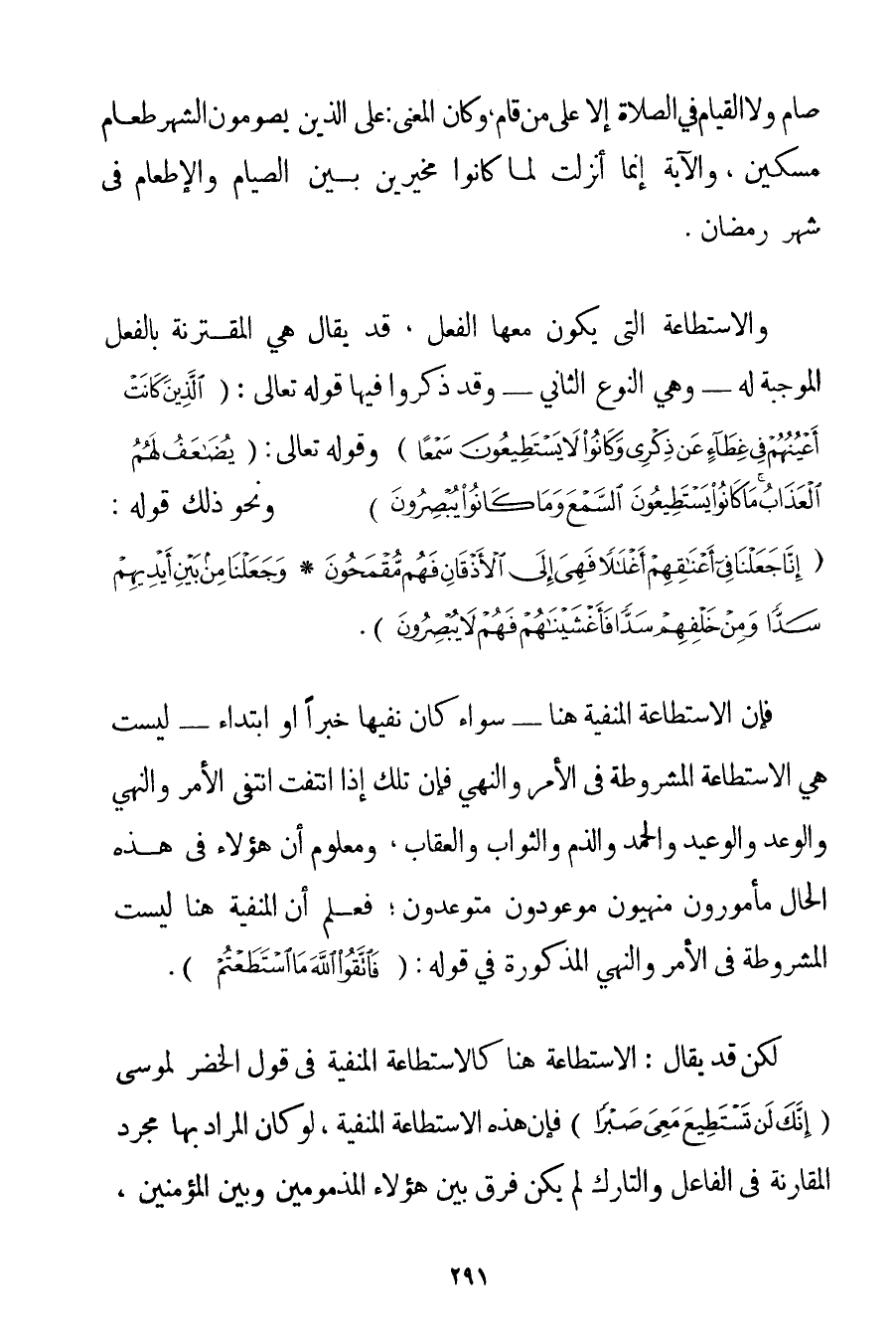 صَامَ وَلَا الْقِيَامُ فِي الصَّلَاةِ إلَّا عَلَى مَنْ قَامَ وَكَانَ الْمَعْنَى: عَلَى الَّذِينَ يَصُومُونَ الشَّهْرَ طَعَامُ مِسْكِينٍ وَالْآيَةُ إنَّمَا أُنْزِلَتْ لَمَّا كَانُوا مُخَيَّرِينَ بَيْنَ الصِّيَامِ وَالْإِطْعَامِ فِي شَهْرِ رَمَضَانَ. وَالِاسْتِطَاعَةُ الَّتِي يَكُونُ مَعَهَا الْفِعْلُ قَدْ يُقَالُ هِيَ المقترنة بِالْفِعْلِ الْمُوجِبَةُ لَهُ - وَهِيَ النَّوْعُ الثَّانِي - وَقَدْ ذَكَرُوا فِيهَا قَوْله تَعَالَى {الَّذِينَ كَانَتْ أَعْيُنُهُمْ فِي غِطَاءٍ عَنْ ذِكْرِي وَكَانُوا لَا يَسْتَطِيعُونَ سَمْعًا} وقَوْله تَعَالَى {يُضَاعَفُ لَهُمُ الْعَذَابُ مَا كَانُوا يَسْتَطِيعُونَ السَّمْعَ وَمَا كَانُوا يُبْصِرُونَ} وَنَحْوَ ذَلِكَ قَوْلُهُ: {إنَّا جَعَلْنَا فِي أَعْنَاقِهِمْ أَغْلَالًا فَهِيَ إلَى الْأَذْقَانِ فَهُمْ مُقْمَحُونَ} {وَجَعَلْنَا مِنْ بَيْنِ أَيْدِيهِمْ سَدًّا وَمِنْ خَلْفِهِمْ سَدًّا فَأَغْشَيْنَاهُمْ فَهُمْ لَا يُبْصِرُونَ} فَإِنَّ الِاسْتِطَاعَةَ الْمَنْفِيَّةَ هُنَا - سَوَاءٌ كَانَ نَفْيُهَا خَبَرًا أَوْ ابْتِدَاءً - لَيْسَتْ هِيَ الِاسْتِطَاعَةَ الْمَشْرُوطَةَ فِي الْأَمْرِ وَالنَّهْيِ فَإِنَّ تِلْكَ إذَا انْتَفَتْ انْتَفَى الْأَمْرُ وَالنَّهْيُ وَالْوَعْدُ وَالْوَعِيدُ وَالْحَمْدُ وَالذَّمُّ وَالثَّوَابُ وَالْعِقَابُ وَمَعْلُومٌ أَنَّ هَؤُلَاءِ فِي هَذِهِ الْحَالِ مَأْمُورُونَ مَنْهِيُّونَ مَوْعُودُونَ مُتَوَعِّدُونَ؛ فَعُلِمَ أَنَّ الْمَنْفِيَّةَ هُنَا لَيْسَتْ الْمَشْرُوطَةَ فِي الْأَمْرِ وَالنَّهْيِ الْمَذْكُورَةَ فِي قَوْلِهِ: {فَاتَّقُوا اللَّهَ مَا اسْتَطَعْتُمْ} . لَكِنْ قَدْ يُقَالُ: الِاسْتِطَاعَةُ هُنَا كَالِاسْتِطَاعَةِ الْمَنْفِيَّةِ فِي قَوْلِ الْخَضِرِ لِمُوسَى {إنَّكَ لَنْ تَسْتَطِيعَ مَعِيَ صَبْرًا} فَإِنَّ هَذِهِ الِاسْتِطَاعَةَ الْمَنْفِيَّةَ لَوْ كَانَ الْمُرَادُ بِهَا مُجَرَّدَ الْمُقَارَنَةِ فِي الْفَاعِلِ وَالتَّارِكِ لَمْ يَكُنْ فَرْقٌ بَيْنَ هَؤُلَاءِ الْمَذْمُومِينَ وَبَيْنَ الْمُؤْمِنِينَ
