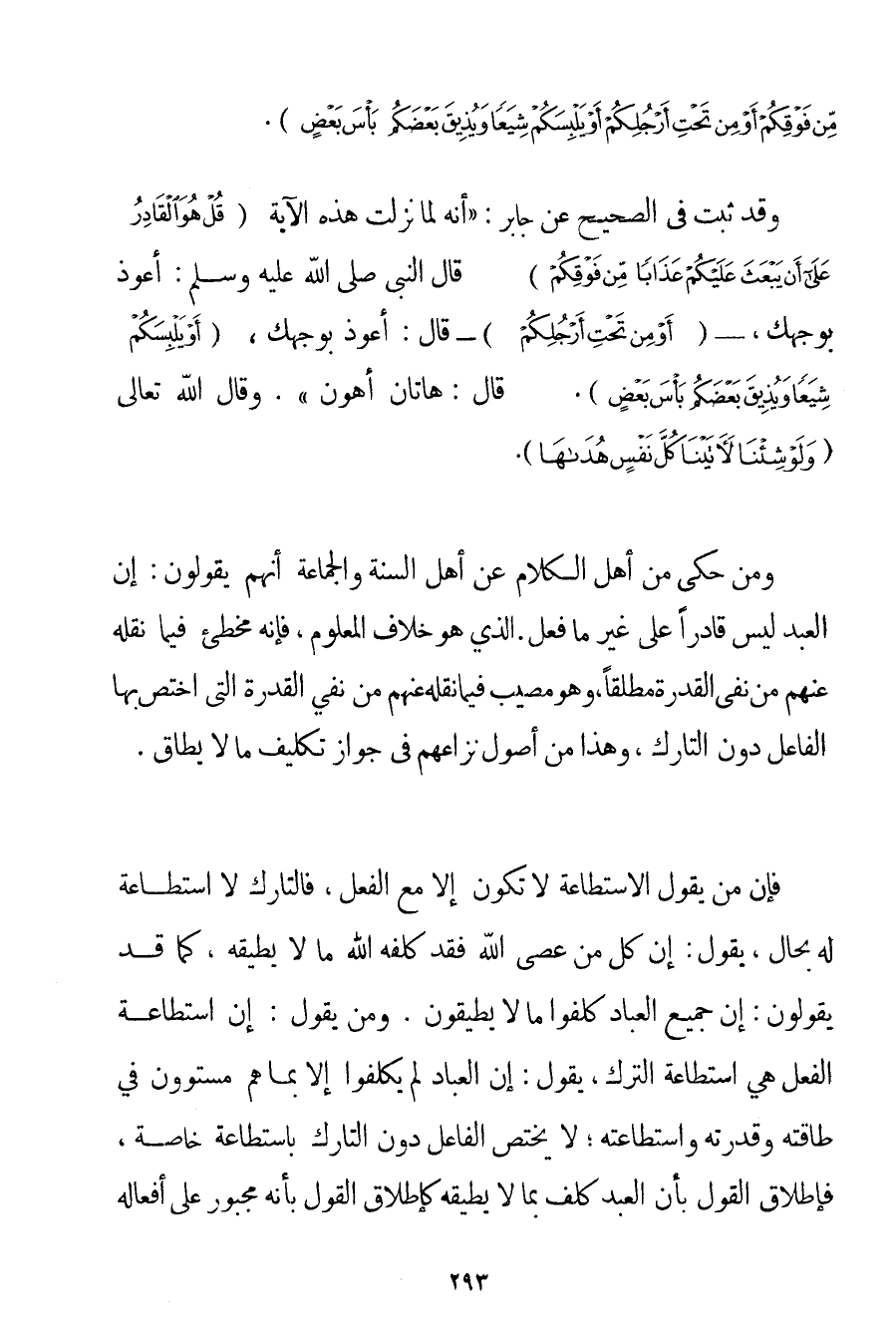 عَذَابًا مِنْ فَوْقِكُمْ أَوْ مِنْ تَحْتِ أَرْجُلِكُمْ أَوْ يَلْبِسَكُمْ شِيَعًا وَيُذِيقَ بَعْضَكُمْ بَأْسَ بَعْضٍ} . وَقَدْ ثَبَتَ فِي الصَّحِيحِ عَنْ جَابِرٍ: {أَنَّهُ لَمَّا نَزَلَتْ هَذِهِ الْآيَةُ {قُلْ هُوَ الْقَادِرُ عَلَى أَنْ يَبْعَثَ عَلَيْكُمْ عَذَابًا مِنْ فَوْقِكُمْ} قَالَ النَّبِيُّ صَلَّى اللَّهُ عَلَيْهِ وَسَلَّمَ أَعُوذُ بِوَجْهِك - {أَوْ مِنْ تَحْتِ أَرْجُلِكُمْ} - قَالَ: أَعُوذُ بِوَجْهِك {أَوْ يَلْبِسَكُمْ شِيَعًا وَيُذِيقَ بَعْضَكُمْ بَأْسَ بَعْضٍ} . قَالَ: هَاتَانِ أَهْوَنُ} . وَقَالَ اللَّهُ تَعَالَى {وَلَوْ شِئْنَا لَآتَيْنَا كُلَّ نَفْسٍ هُدَاهَا} . وَمَنْ حَكَى مِنْ أَهْلِ الْكَلَامِ عَنْ أَهْلِ السُّنَّةِ وَالْجَمَاعَةِ أَنَّهُمْ يَقُولُونَ: إنَّ الْعَبْدَ لَيْسَ قَادِرًا عَلَى غَيْرِ مَا فَعَلَ الَّذِي هُوَ خِلَافُ الْمَعْلُومِ فَإِنَّهُ - مُخْطِئٌ فِيمَا نَقَلَهُ عَنْهُمْ مِنْ نَفْيِ الْقُدْرَةِ مُطْلَقًا وَهُوَ مُصِيبٌ فِيمَا نَقَلَهُ عَنْهُمْ مِنْ نَفْيِ الْقُدْرَةِ الَّتِي اخْتَصَّ بِهَا الْفَاعِلُ دُونَ التَّارِكِ وَهَذَا مِنْ أُصُولِ نِزَاعِهِمْ فِي جَوَازِ تَكْلِيفِ مَا لَا يُطَاقُ. فَإِنَّ مَنْ يَقُولُ الِاسْتِطَاعَةُ لَا تَكُونُ إلَّا مَعَ الْفِعْلِ فَالتَّارِكُ لَا اسْتِطَاعَةَ لَهُ بِحَالِ يَقُولُ: إنَّ كُلَّ مَنْ عَصَى اللَّهَ فَقَدْ كَلَّفَهُ اللَّهُ مَا لَا يُطِيقُهُ كَمَا قَدْ يَقُولُونَ: إنَّ جَمِيعَ الْعِبَادِ كُلِّفُوا مَا لَا يُطِيقُونَ. وَمَنْ يَقُولُ: إنَّ اسْتِطَاعَةَ الْفِعْلِ هِيَ اسْتِطَاعَةُ التَّرْكِ يَقُولُ: إنَّ الْعِبَادَ لَمْ يُكَلَّفُوا إلَّا بِمَا هُمْ مُسْتَوُونَ فِي طَاقَتِهِ وَقُدْرَتِهِ وَاسْتِطَاعَتِهِ؛ لَا يَخْتَصُّ الْفَاعِلُ دُونَ التَّارِكِ بِاسْتِطَاعَةِ خَاصَّةٍ فَإِطْلَاقُ الْقَوْلِ بِأَنَّ الْعَبْدَ كُلِّفَ بِمَا لَا يُطِيقُهُ كَإِطْلَاقِ الْقَوْلِ بِأَنَّهُ مَجْبُورٌ عَلَى أَفْعَالِهِ