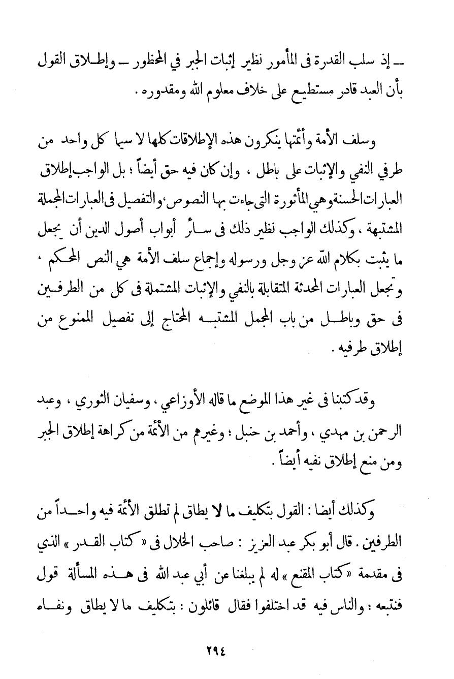 - إذْ سَلْبُ الْقُدْرَةِ فِي الْمَأْمُورِ نَظِيرُ إثْبَاتِ الْجَبْرِ فِي الْمَحْظُورِ - وَإِطْلَاقُ الْقَوْلِ بِأَنَّ الْعَبْدَ قَادِرٌ مُسْتَطِيعٌ عَلَى خِلَافِ مَعْلُومِ اللَّهِ وَمَقْدُورِهِ. وَسَلَفُ الْأُمَّةِ وَأَئِمَّتُهَا يُنْكِرُونَ هَذِهِ الْإِطْلَاقَاتِ كُلَّهَا لَا سِيَّمَا كُلُّ وَاحِدٍ مِنْ طَرَفَيْ النَّفْيِ وَالْإِثْبَاتِ عَلَى بَاطِلٍ وَإِنْ كَانَ فِيهِ حَقٌّ أَيْضًا؛ بَلْ الْوَاجِبُ إطْلَاقُ الْعِبَارَاتِ الْحَسَنَةِ وَهِيَ الْمَأْثُورَةُ الَّتِي جَاءَتْ بِهَا النُّصُوصُ وَالتَّفْصِيلُ فِي الْعِبَارَاتِ الْمُجْمَلَةِ الْمُشْتَبِهَةِ وَكَذَلِكَ الْوَاجِبُ نَظِيرُ ذَلِكَ فِي سَائِرِ أَبْوَابِ أُصُولِ الدِّينِ أَنْ يَجْعَلَ مَا يَثْبُتُ بِكَلَامِ اللَّهِ عَزَّ وَجَلَّ وَرَسُولِهِ وَإِجْمَاعِ سَلَفِ الْأُمَّةِ هِيَ النَّصُّ الْمُحْكَمُ، وَتَجْعَلَ الْعِبَارَاتِ الْمُحْدَثَةَ الْمُتَقَابِلَةَ بِالنَّفْيِ وَالْإِثْبَاتِ الْمُشْتَمِلَةَ فِي كُلٍّ مِنْ الطَّرَفَيْنِ فِي حَقٍّ وَبَاطِلٍ مِنْ بَابِ الْمُجْمَلِ الْمُشْتَبَهِ الْمُحْتَاجِ إلَى تَفْصِيلِ الْمَمْنُوعِ مِنْ إطْلَاقِ طَرَفَيْهِ. وَقَدْ كَتَبْنَا فِي غَيْرِ هَذَا الْمَوْضِعِ مَا قَالَهُ الأوزاعي وَسُفْيَانُ الثَّوْرِيُّ وَعَبْدُ الرَّحْمَنِ بْنُ مَهْدِيٍّ وَأَحْمَد بْنُ حَنْبَلٍ؛ وَغَيْرُهُمْ مِنْ الْأَئِمَّةِ مِنْ كَرَاهَةِ إطْلَاقِ الْجَبْرِ وَمِنْ مَنْعِ إطْلَاقِ نَفْيِهِ أَيْضًا.