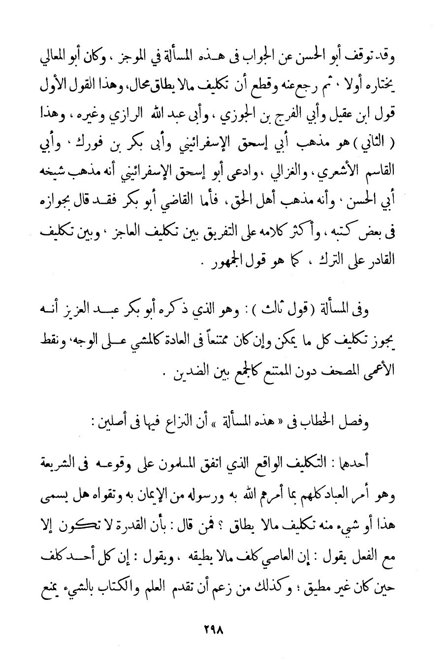 وَقَدْ تَوَقَّفَ أَبُو الْحَسَنِ عَنْ الْجَوَابِ فِي هَذِهِ الْمَسْأَلَةِ فِي الْمُوجَزِ وَكَانَ أَبُو الْمَعَالِي يَخْتَارُهُ أَوَّلًا ثُمَّ رَجَعَ عَنْهُ وَقَطَعَ أَنَّ تَكْلِيفَ مَا لَا يُطَاقُ مُحَالٌ وَهَذَا الْقَوْلُ الْأَوَّلُ قَوْلُ ابْنِ عَقِيلٍ وَأَبِي الْفَرَجِ ابْنِ الْجَوْزِيِّ وَأَبِي عَبْدِ اللَّهِ الرَّازِي وَغَيْرِهِ وَهَذَا (الثَّانِي) هُوَ مَذْهَبُ أَبِي إسْحَاقَ الإسفراييني وَأَبِي بَكْرِ بْنِ فورك، وَأَبِي الْقَاسِم الْأَشْعَرِيِّ وَالْغَزَالِيِّ وَادَّعَى أَبُو إسْحَاقَ الإسفراييني أَنَّهُ مَذْهَبُ شَيْخِهِ أَبِي الْحَسَنِ وَأَنَّهُ مَذْهَبُ أَهْلِ الْحَقِّ فَأَمَّا الْقَاضِي أَبُو بَكْرٍ فَقَدْ قَالَ بِجَوَازِهِ فِي بَعْضِ كُتُبِهِ وَأَكْثَرُ كَلَامِهِ عَلَى التَّفْرِيقِ بَيْنَ تَكْلِيفِ الْعَاجِزِ وَبَيْنَ تَكْلِيفِ الْقَادِرِ عَلَى التَّرْكِ كَمَا هُوَ قَوْلُ الْجُمْهُورِ. وَفِي الْمَسْأَلَةِ (قَوْلٌ ثَالِثٌ) : وَهُوَ الَّذِي ذَكَرَهُ أَبُو بَكْرٍ عَبْدُ الْعَزِيزِ أَنَّهُ يَجُوزُ تَكْلِيفُ كُلِّ مَا يُمْكِنُ وَإِنْ كَانَ مُمْتَنِعًا فِي الْعَادَةِ كَالْمَشْيِ عَلَى الْوَجْهِ وَنَقْطِ الْأَعْمَى الْمُصْحَفَ دُونَ الْمُمْتَنِعِ كَالْجَمْعِ بَيْنَ الضِّدَّيْنِ. وَفَصْلُ الْخِطَابِ فِي " هَذِهِ الْمَسْأَلَةِ " أَنَّ النِّزَاعَ فِيهَا فِي أَصْلَيْنِ: أَحَدُهُمَا: التَّكْلِيفُ الْوَاقِعُ الَّذِي اتَّفَقَ الْمُسْلِمُونَ عَلَى وُقُوعِهِ فِي الشَّرِيعَةِ وَهُوَ أَمْرُ الْعِبَادِ كُلِّهِمْ بِمَا أَمَرَهُمْ اللَّهُ بِهِ وَرَسُولُهُ مِنْ الْإِيمَانِ بِهِ وَتَقْوَاهُ هَلْ يُسَمَّى هَذَا أَوْ شَيْءٌ مِنْهُ تَكْلِيفُ مَا لَا يُطَاقُ؟ فَمَنْ قَالَ: بِأَنَّ الْقُدْرَةَ لَا تَكُونُ إلَّا مَعَ الْفِعْلِ يَقُولُ: إنَّ الْعَاصِيَ كُلِّفَ مَا لَا يُطِيقُهُ وَيَقُولُ: إنَّ كُلَّ أَحَدٍ كُلِّفَ حِينَ كَانَ غَيْرَ مُطِيقٍ؛ وَكَذَلِكَ مَنْ زَعَمَ أَنَّ تَقَدُّمَ الْعِلْمِ، وَالْكِتَابَ بِالشَّيْءِ يَمْنَعُ