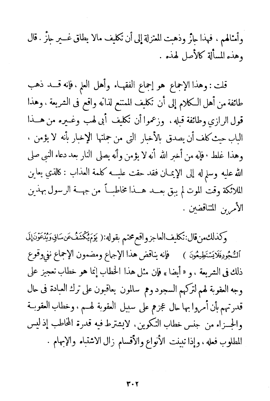 وَأَمْثَالِهِمْ فَهَذَا جَائِزٌ وَذَهَبَتْ الْمُعْتَزِلَةُ إلَى أَنَّ تَكْلِيفَ مَا لَا يُطَاقُ غَيْرُ جَائِزٍ. قَالَ وَهَذِهِ الْمَسْأَلَةُ كَالْأَصْلِ لِهَذِهِ. قُلْت: وَهَذَا الْإِجْمَاعُ هُوَ إجْمَاعُ الْفُقَهَاءِ وَأَهْلِ الْعِلْمِ فَإِنَّهُ قَدْ ذَهَبَ طَائِفَةٌ مِنْ أَهْلِ الْكَلَامِ إلَى أَنَّ تَكْلِيفَ الْمُمْتَنِعِ لِذَاتِهِ وَاقِعٌ فِي الشَّرِيعَةِ وَهَذَا قَوْلُ الرَّازِي، وَطَائِفَةٌ قَبْلَهُ وَزَعَمُوا أَنَّ تَكْلِيفَ أَبِي لَهَبٍ وَغَيْرِهِ مِنْ هَذَا الْبَابِ حَيْثُ كُلِّفَ أَنْ يُصَدِّقَ بِالْأَخْبَارِ الَّتِي مِنْ جُمْلَتِهَا الْإِخْبَارُ بِأَنَّهُ لَا يُؤْمِنُ وَهَذَا غَلَطٌ فَإِنَّهُ مَنْ أَخْبَرَ اللَّهُ أَنَّهُ لَا يُؤْمِنُ وَأَنَّهُ يَصْلَى النَّارَ بَعْدَ دُعَاءِ النَّبِيِّ صَلَّى اللَّهُ عَلَيْهِ وَسَلَّمَ لَهُ إلَى الْإِيمَانِ فَقَدْ حَقَّتْ عَلَيْهِ كَلِمَةُ الْعَذَابِ: كَاَلَّذِي يُعَايِنُ الْمَلَائِكَةَ وَقْتَ الْمَوْتِ لَمْ يَبْقَ بَعْدَ هَذَا مُخَاطَبًا مِنْ جِهَةِ الرَّسُولِ بِهَذَيْنِ الْأَمْرَيْنِ الْمُتَنَاقِضَيْنِ. وَكَذَلِكَ مَنْ قَالَ: تَكْلِيفُ الْعَاجِزِ وَاقِعٌ مُحَتَّمٌ بِقَوْلِهِ: {يَوْمَ يُكْشَفُ عَنْ سَاقٍ وَيُدْعَوْنَ إلَى السُّجُودِ فَلَا يَسْتَطِيعُونَ} فَإِنَّهُ يُنَاقِضُ هَذَا الْإِجْمَاعَ، وَمَضْمُونُ الْإِجْمَاعِ نَفْيُ وُقُوعِ ذَلِكَ فِي الشَّرِيعَةِ وَ " أَيْضًا " فَإِنَّ مِثْلَ هَذَا الْخِطَابِ إنَّمَا هُوَ خِطَابُ تَعْجِيزٍ عَلَى وَجْهِ الْعُقُوبَةِ لَهُمْ لِتَرْكِهِمْ السُّجُودَ وَهُمْ سَالِمُونَ يُعَاقَبُونَ عَلَى تَرْكِ الْعِبَادَةِ فِي حَالِ قُدْرَتِهِمْ بِأَنْ أُمِرُوا بِهَا حَالَ عَجْزِهِمْ عَلَى سَبِيلِ الْعُقُوبَةِ لَهُمْ وَخِطَابُ الْعُقُوبَةِ وَالْجَزَاءِ مِنْ جِنْسِ خِطَابِ التَّكْوِينِ لَا يُشْتَرَطُ فِيهِ قُدْرَةُ الْمُخَاطَبِ إذْ لَيْسَ الْمَطْلُوبُ فِعْلَهُ وَإِذَا تَبَيَّنَتْ الْأَنْوَاعُ وَالْأَقْسَامُ زَالَ الِاشْتِبَاهُ وَالْإِبْهَامُ.
