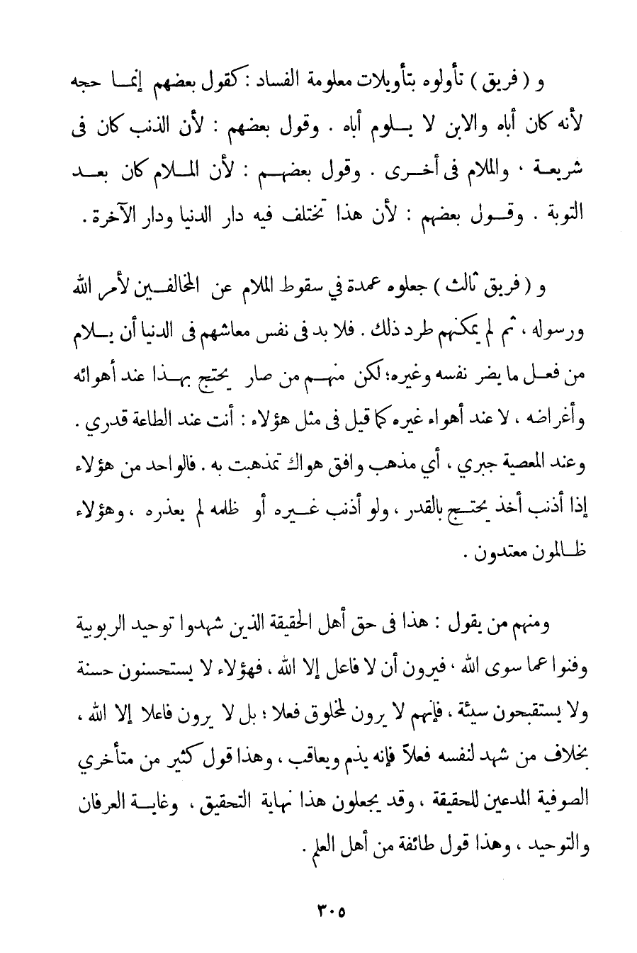 وَ (فَرِيقٌ ثَالِثٌ) جَعَلُوهُ عُمْدَةً فِي سُقُوطِ الْمَلَامِ عَنْ الْمُخَالِفِينَ لِأَمْرِ اللَّهِ وَرَسُولِهِ ثُمَّ لَمْ يُمْكِنْهُمْ طَرْدُ ذَلِكَ. فَلَا بُدَّ فِي نَفْسِ مَعَاشِهِمْ فِي الدُّنْيَا أَنْ يُلَامَ مَنْ فَعَلَ مَا يَضُرُّ نَفْسَهُ وَغَيْرَهُ؛ لَكِنَّ مِنْهُمْ مَنْ صَارَ يَحْتَجُّ بِهَذَا عِنْدَ أَهْوَائِهِ وَأَغْرَاضِهِ لَا عِنْدَ أَهْوَاءِ غَيْرِهِ كَمَا قِيلَ فِي مِثْلِ هَؤُلَاءِ: أَنْتَ عِنْدَ الطَّاعَةِ قَدَرِيٌّ، وَعِنْدَ الْمَعْصِيَةِ جَبْرِيٌّ، أَيُّ مَذْهَبٍ وَافَقَ هَوَاك تَمَذْهَبْت بِهِ. فَالْوَاحِدُ مِنْ هَؤُلَاءِ إذَا أَذْنَبَ أَخَذَ يَحْتَجُّ بِالْقَدَرِ وَلَوْ أَذْنَبَ غَيْرُهُ أَوْ ظَلَمَهُ لَمْ يَعْذُرْهُ وَهَؤُلَاءِ ظَالِمُونَ مُعْتَدُونَ. وَمِنْهُمْ مَنْ يَقُولُ: هَذَا فِي حَقِّ أَهْلِ الْحَقِيقَةِ الَّذِينَ شَهِدُوا تَوْحِيدَ الرُّبُوبِيَّةِ وَفَنُوا عَمَّا سِوَى اللَّهِ فَيَرَوْنَ أَنْ لَا فَاعِلَ إلَّا اللَّهُ فَهَؤُلَاءِ لَا يَسْتَحْسِنُونَ حَسَنَةً وَلَا يَسْتَقْبِحُونَ سَيِّئَةً فَإِنَّهُمْ لَا يَرَوْنَ لِمَخْلُوقِ فِعْلًا؛ بَلْ لَا يَرَوْنَ فَاعِلًا إلَّا اللَّهُ بِخِلَافِ مَنْ شَهِدَ لِنَفْسِهِ فِعْلًا فَإِنَّهُ يُذَمُّ وَيُعَاقَبُ وَهَذَا قَوْلُ كَثِيرٍ مِنْ مُتَأَخِّرِي الصُّوفِيَّةِ الْمُدَّعِينَ لِلْحَقِيقَةِ وَقَدْ يَجْعَلُونَ هَذَا نِهَايَةَ التَّحْقِيقِ وَغَايَةَ الْعِرْفَانِ وَالتَّوْحِيدِ وَهَذَا قَوْلُ طَائِفَةٍ مِنْ أَهْلِ الْعِلْمِ.
