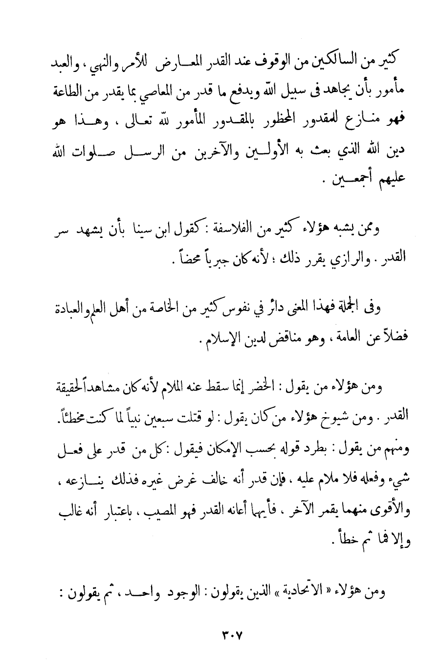 كَثِيرٍ مِنْ السَّالِكِينَ مِنْ الْوُقُوفِ عِنْدَ الْقَدَرِ الْمُعَارِضِ لِلْأَمْرِ وَالنَّهْيِ وَالْعَبْدُ مَأْمُورٌ بِأَنْ يُجَاهِدَ فِي سَبِيلِ اللَّهِ، وَيَدْفَعَ مَا قَدَرَ مِنْ الْمَعَاصِي بِمَا يَقْدِرُ مِنْ الطَّاعَةِ فَهُوَ مُنَازِعٌ لِلْمَقْدُورِ الْمَحْظُورِ بِالْمَقْدُورِ الْمَأْمُورِ لِلَّهِ تَعَالَى وَهَذَا هُوَ دِينُ اللَّهِ الَّذِي بَعَثَ بِهِ الْأَوَّلِينَ والآخرين مِنْ الرُّسُلِ - صَلَوَاتُ اللَّهِ عَلَيْهِمْ أَجْمَعِينَ -. وَمِمَّنْ يُشْبِهُ هَؤُلَاءِ كَثِيرٌ مِنْ الْفَلَاسِفَةِ: كَقَوْلِ ابْنِ سِينَا بِأَنْ يَشْهَدَ سِرُّ الْقَدَرِ. وَالرَّازِي يُقَرِّرُ ذَلِكَ؛ لِأَنَّهُ كَانَ جَبْرِيًّا مَحْضًا. وَفِي الْجُمْلَةِ فَهَذَا الْمَعْنَى دَائِرٌ فِي نُفُوسِ كَثِيرٍ مِنْ الْخَاصَّةِ مِنْ أَهْلِ الْعِلْمِ وَالْعِبَادَةِ فَضْلًا عَنْ الْعَامَّةِ وَهُوَ مُنَاقِضٌ لِدِينِ الْإِسْلَامِ. وَمِنْ هَؤُلَاءِ مَنْ يَقُولُ: الْخَضِرُ إنَّمَا سَقَطَ عَنْهُ الْمَلَامُ لِأَنَّهُ كَانَ مُشَاهِدًا لِحَقِيقَةِ الْقَدَرِ. وَمِنْ شُيُوخِ هَؤُلَاءِ مَنْ كَانَ يَقُولُ: لَوْ قَتَلْت سَبْعِينَ نَبِيًّا لَمَا كُنْت مُخْطِئًا. وَمِنْهُمْ مَنْ يَقُولُ: بِطَرْدِ قَوْلِهِ بِحَسَبِ الْإِمْكَانِ فَيَقُولُ: كُلُّ مَنْ قَدَرَ عَلَى فِعْلِ شَيْءٍ وَفَعَلَهُ فَلَا مَلَامَ عَلَيْهِ فَإِنْ قُدِّرَ أَنَّهُ خَالَفَ غَرَضَ غَيْرِهِ فَذَلِكَ يُنَازِعُهُ وَالْأَقْوَى مِنْهُمَا يُقْمِرُ الْآخَرَ فَأَيُّهُمَا أَعَانَهُ الْقَدَرُ فَهُوَ الْمُصِيبُ بِاعْتِبَارِ أَنَّهُ غَالِبٌ وَإِلَّا فَمَا ثَمَّ خَطَأٌ.